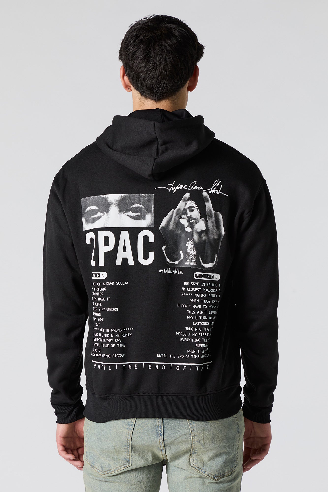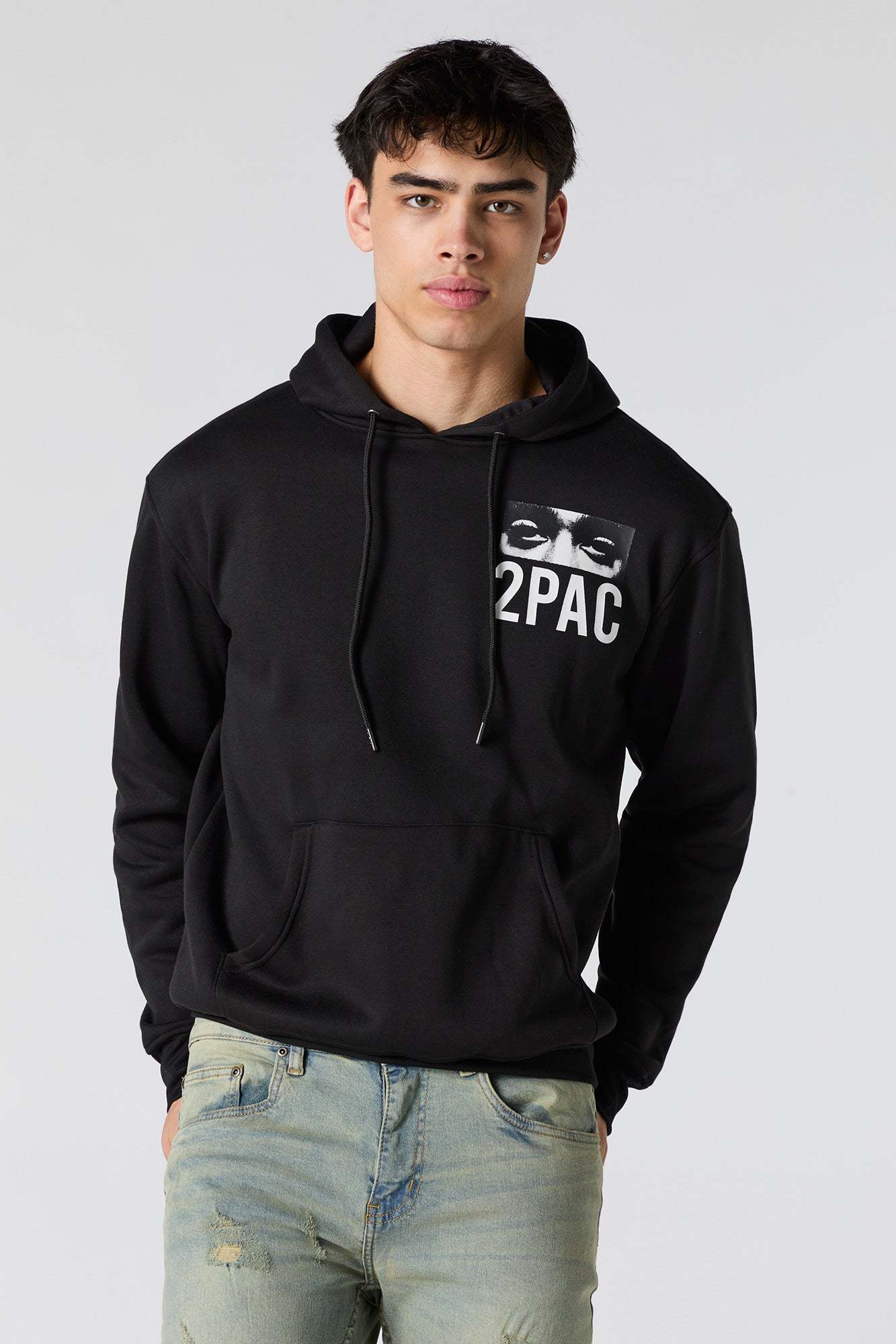 This hoodie features fleece material, graphic front and back, drawstring hood, kangaroo pocket, long sleeves, and ribbed knit trim.