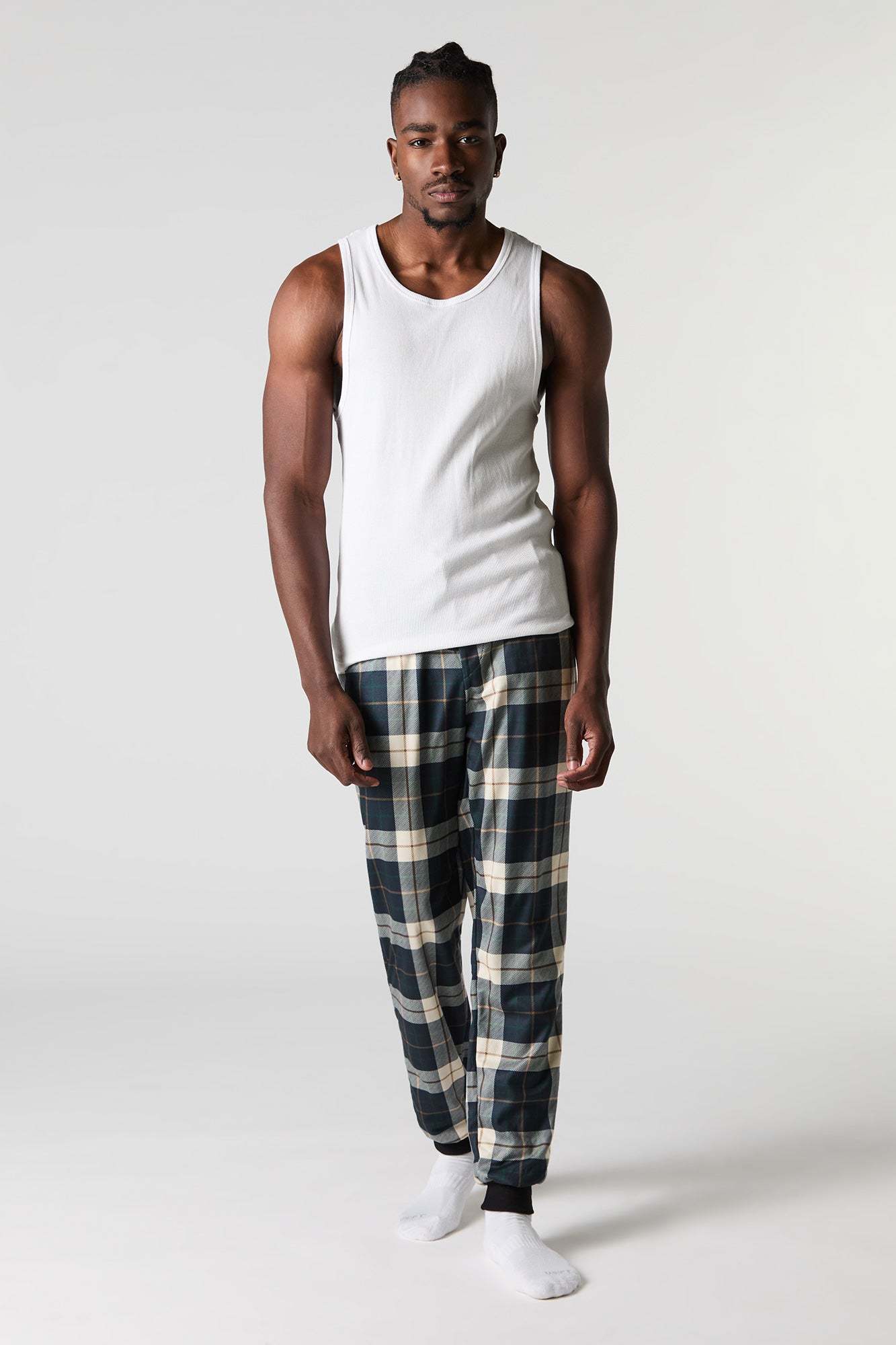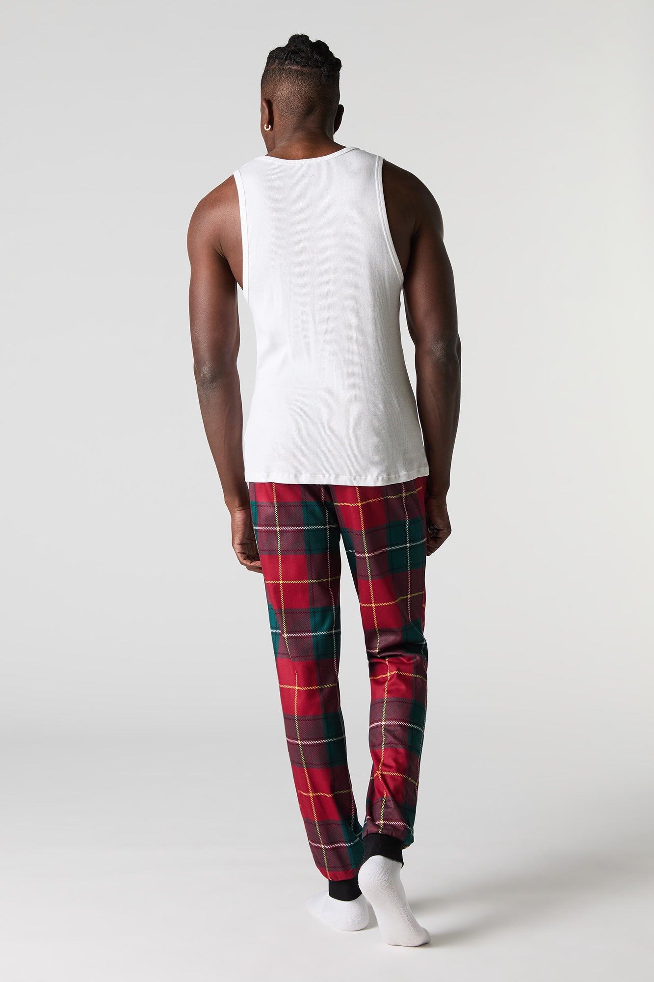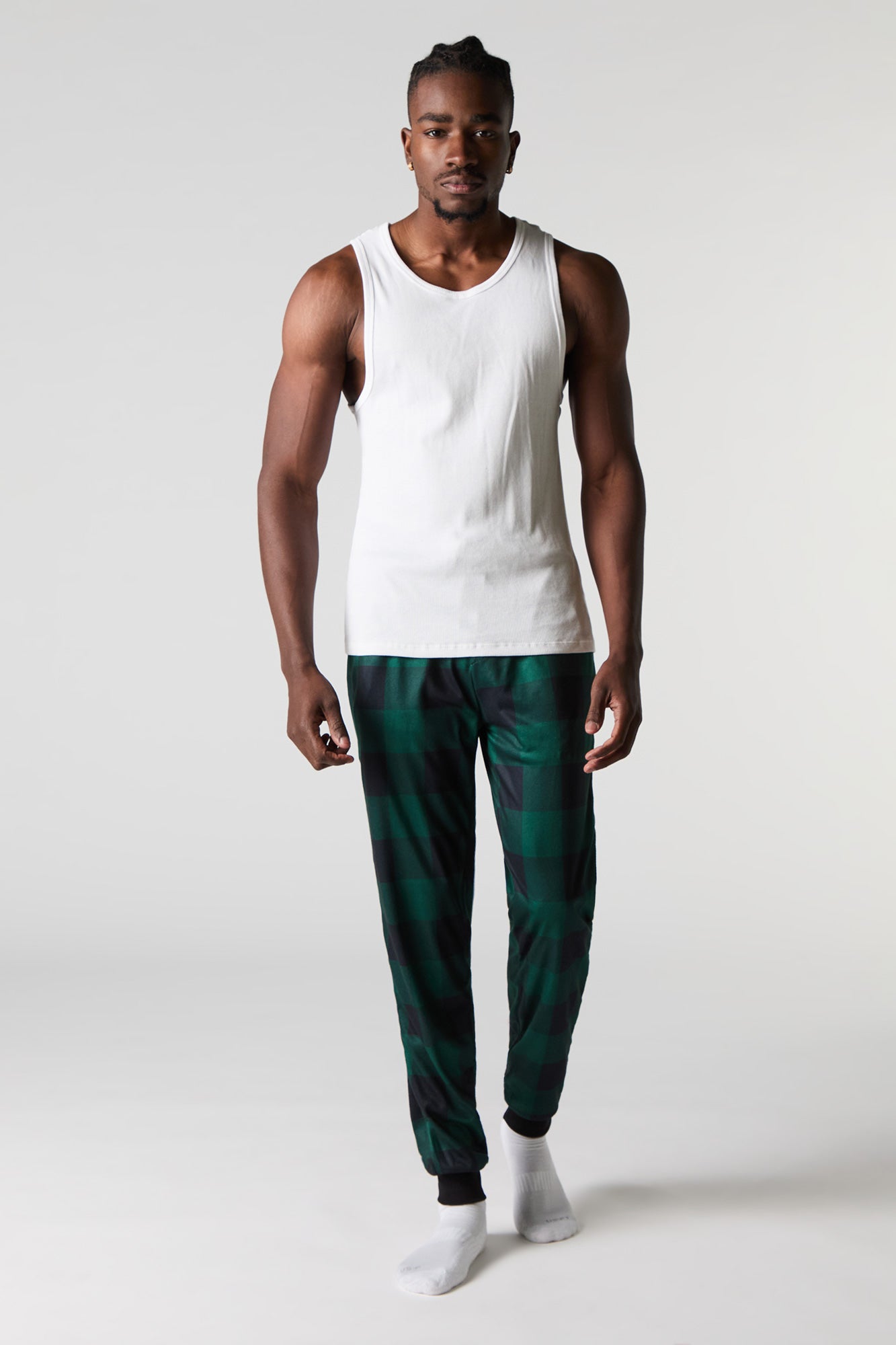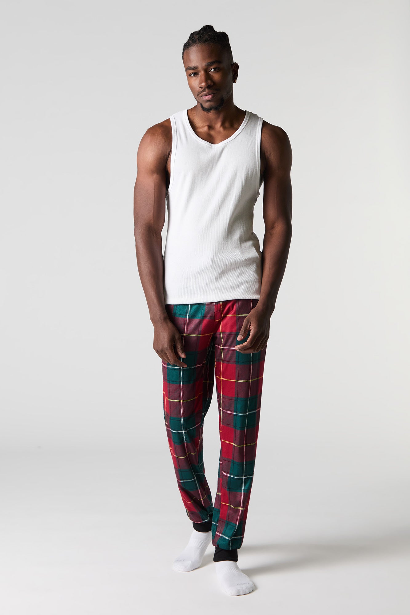 This pajama jogger features all-over print, drawstring waist, and cinched ankles.