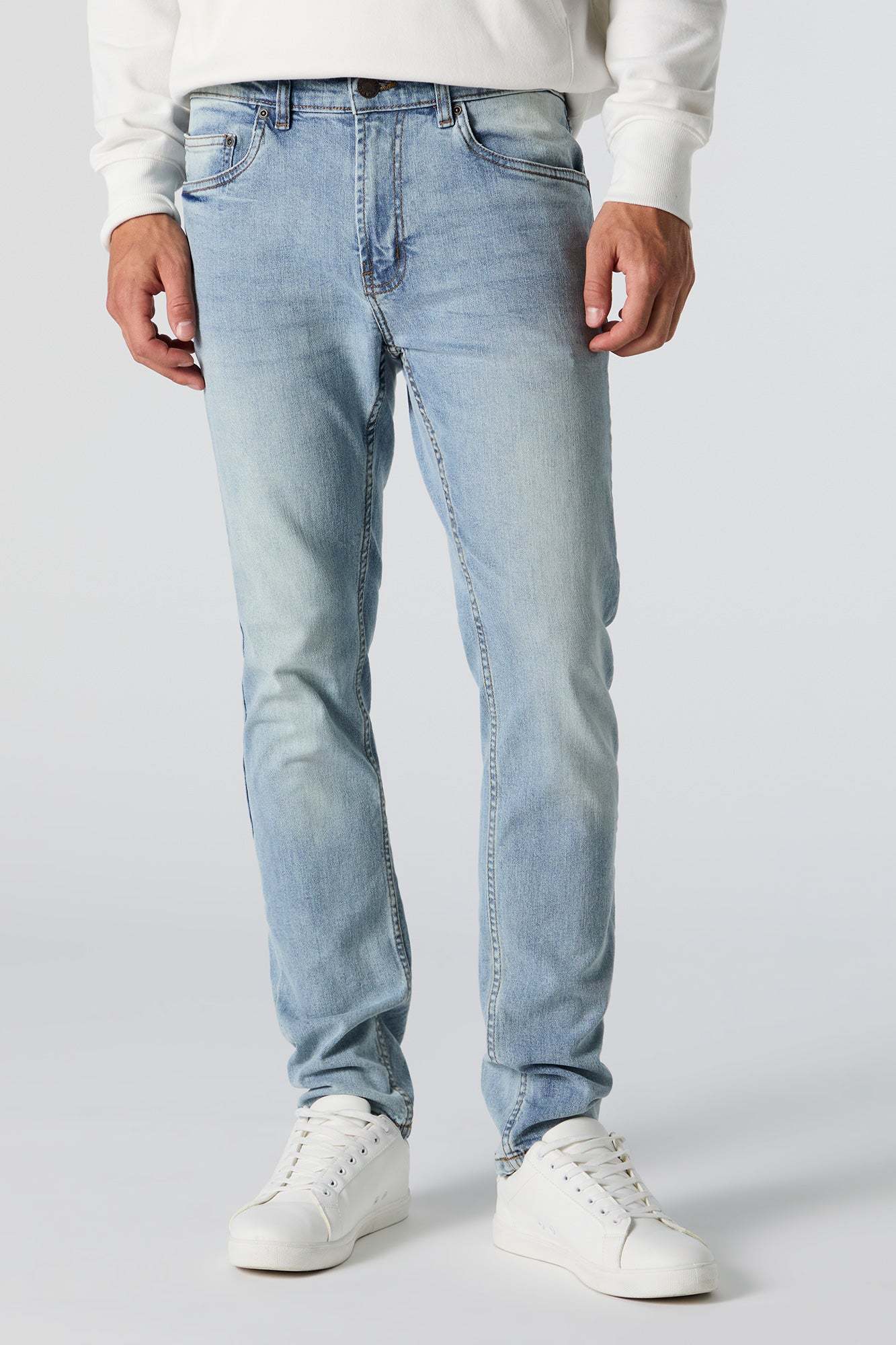 Elevate your denim game and find your perfect fit. This jean features denim material, zip-fly button-up closure, belt loops, 5 pockets, and skinny leg.