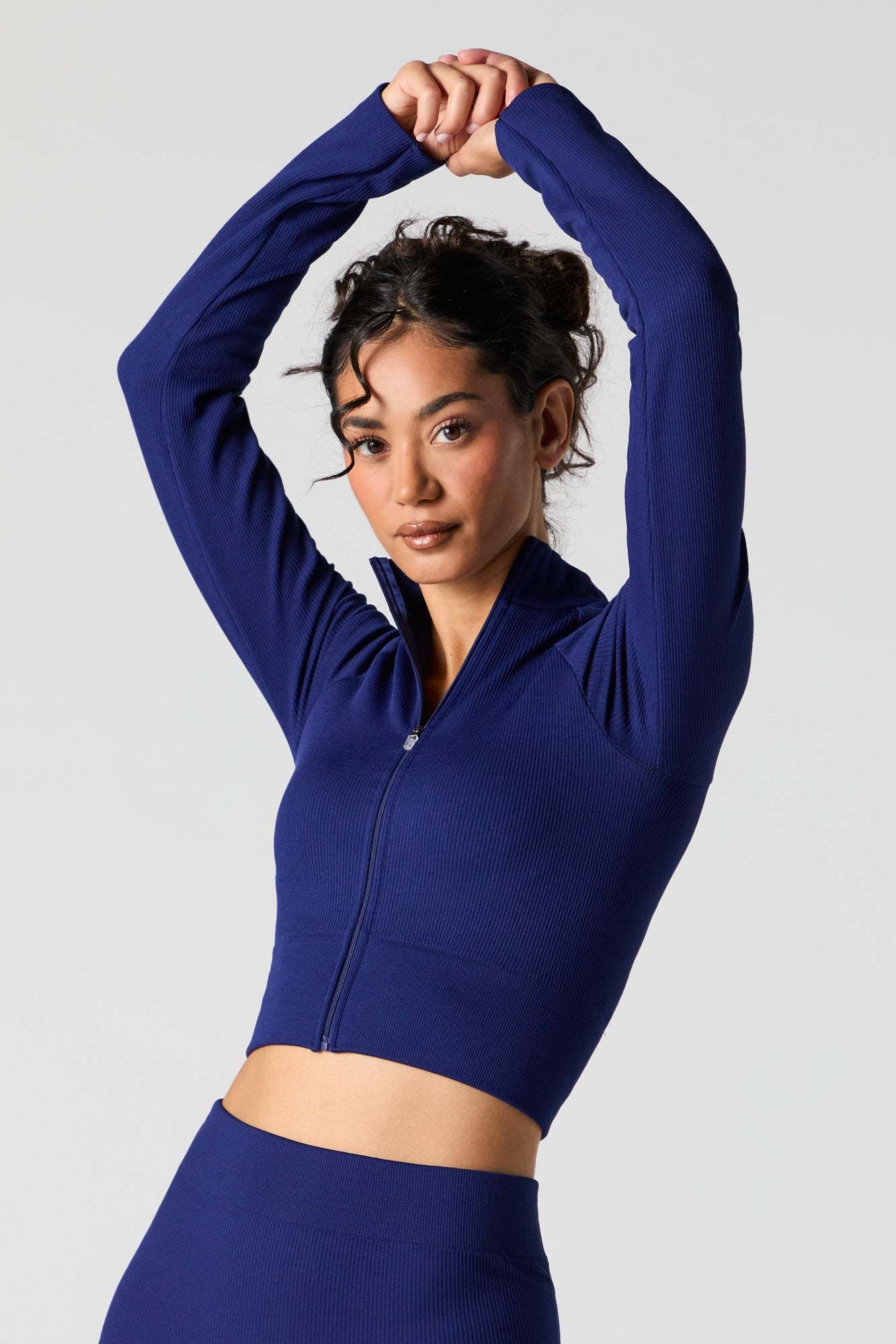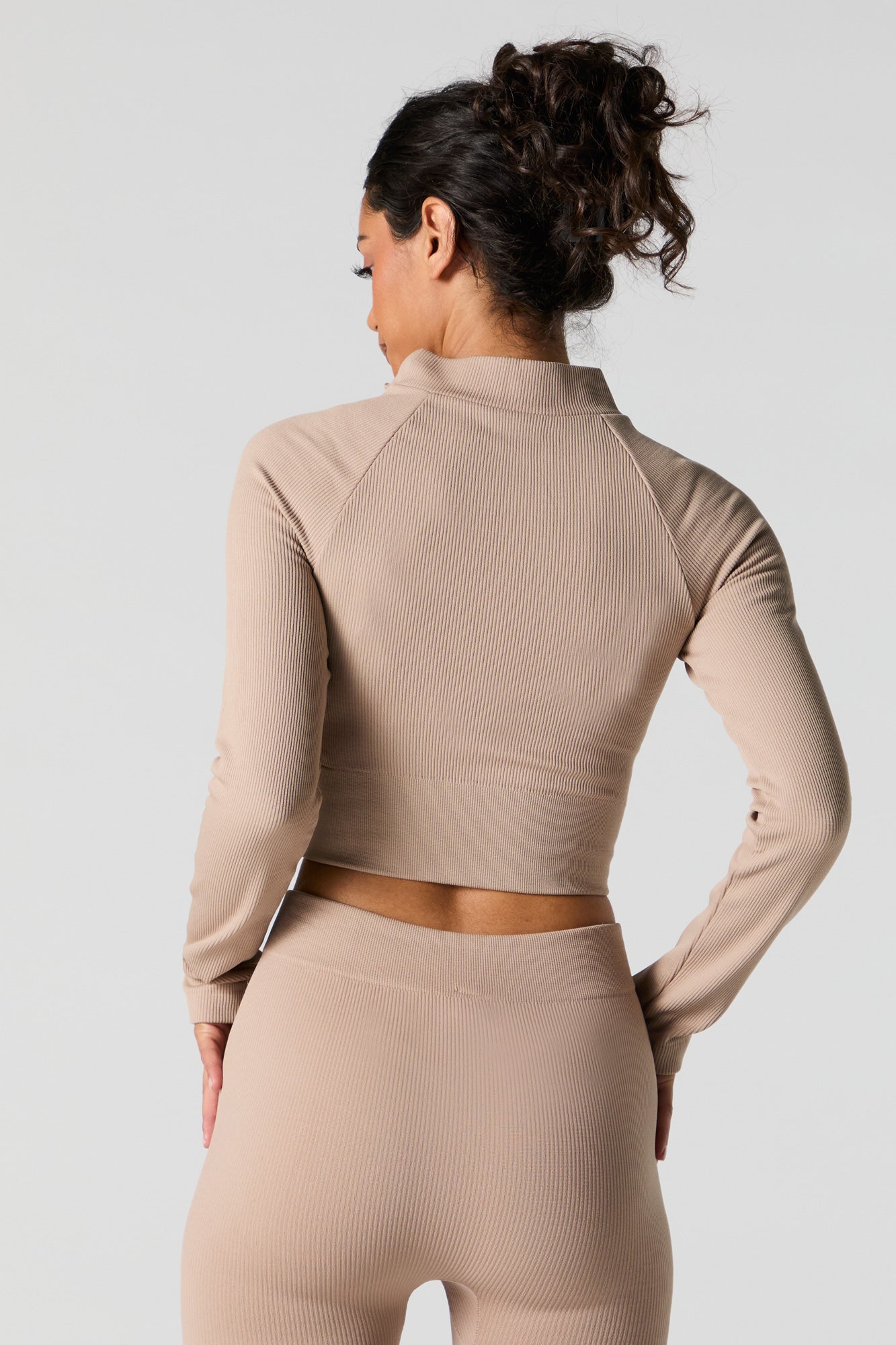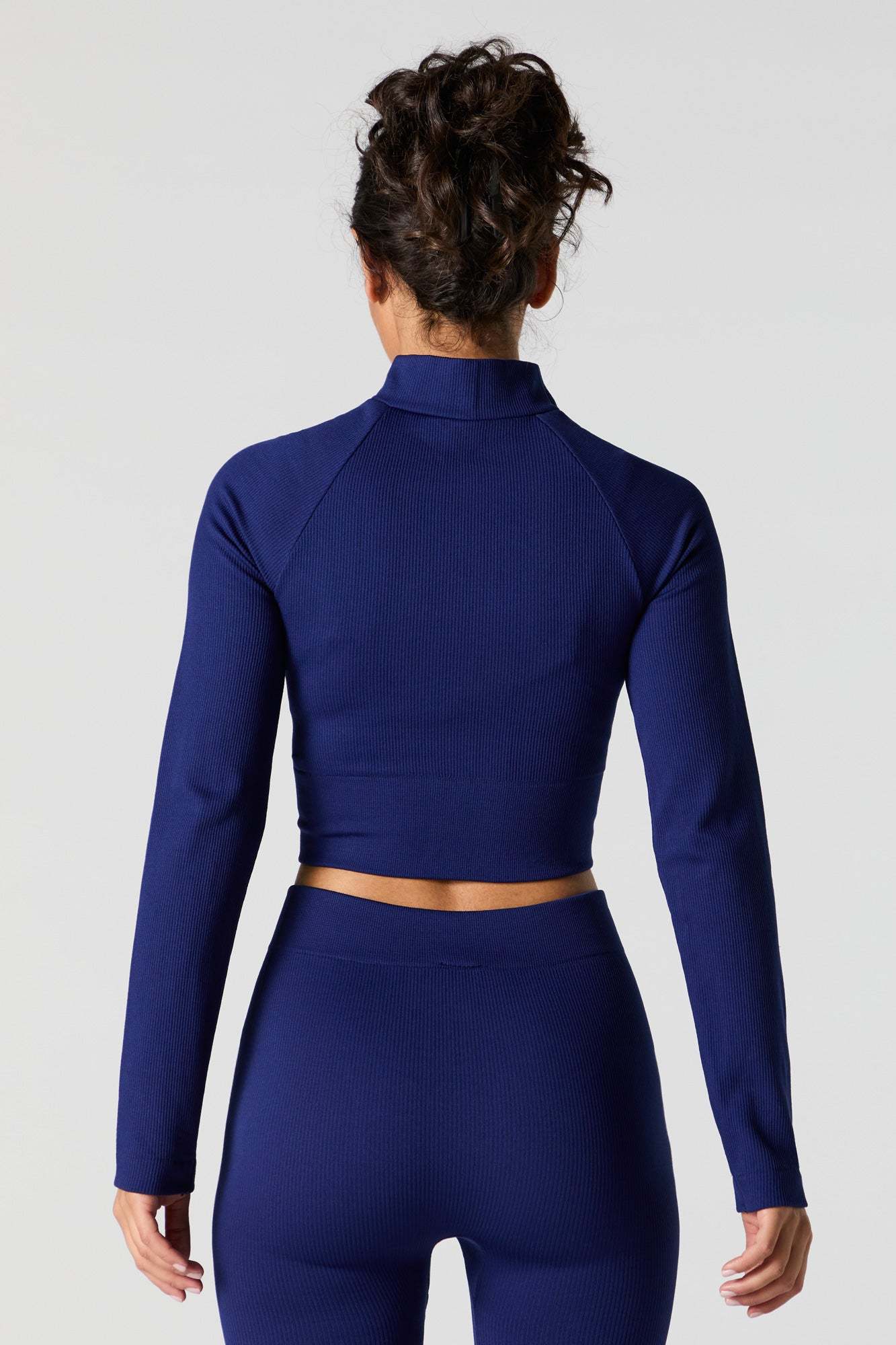 This active top features seamless construction, all-over ribbing, mock neck, zip-up front, long sleeves, and cropped hem. Pair with our to complete the look.
