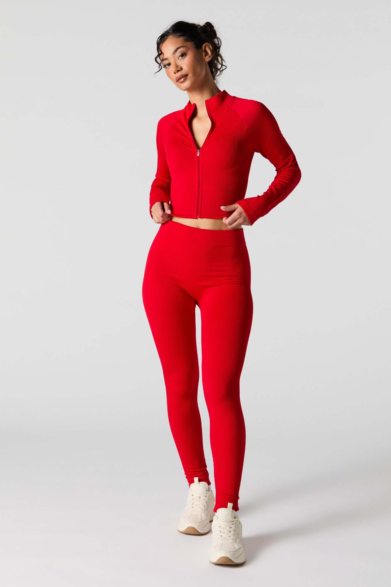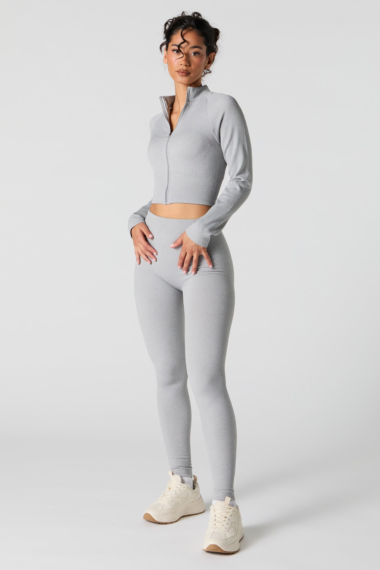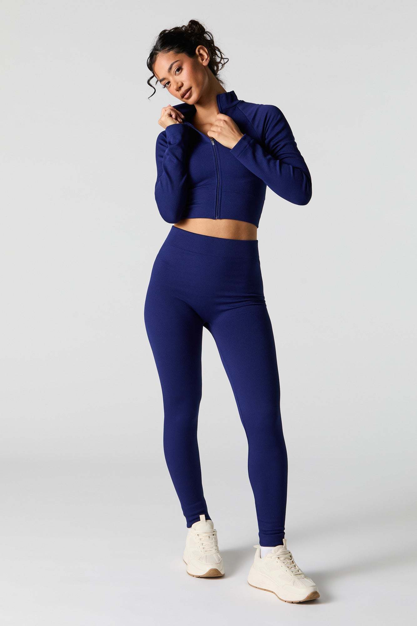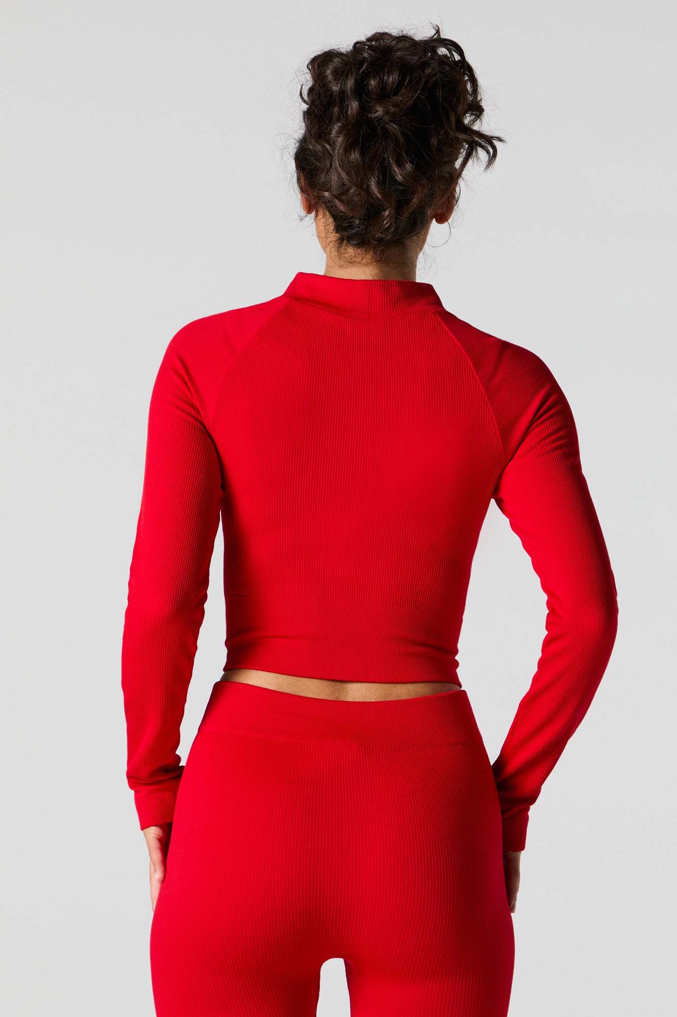 This active top features seamless construction, all-over ribbing, mock neck, zip-up front, long sleeves, and cropped hem. Pair with our to complete the look.