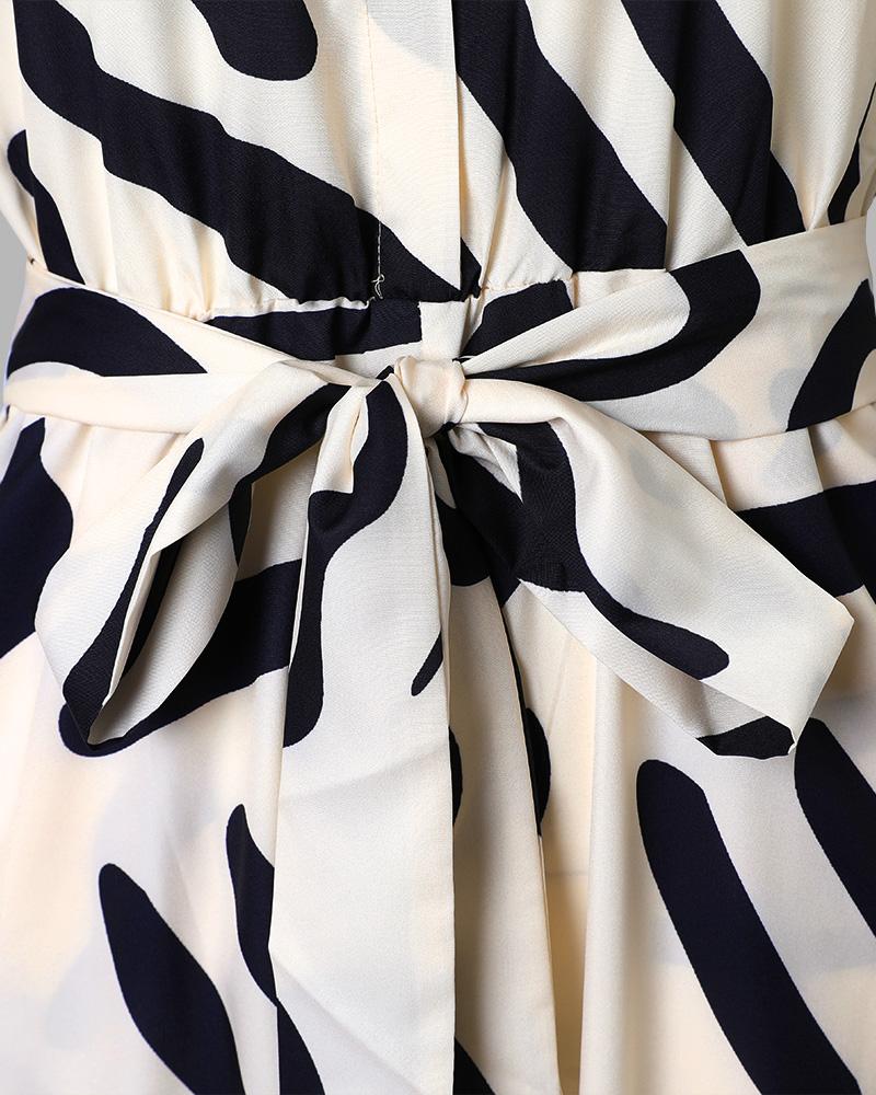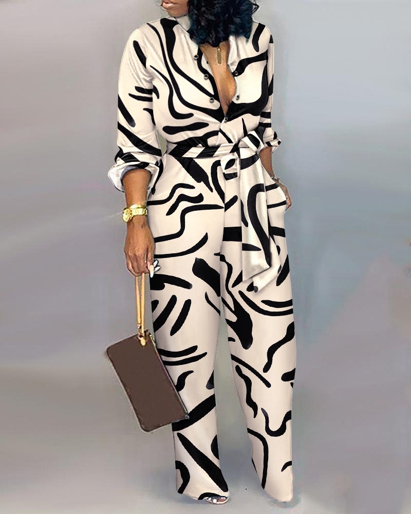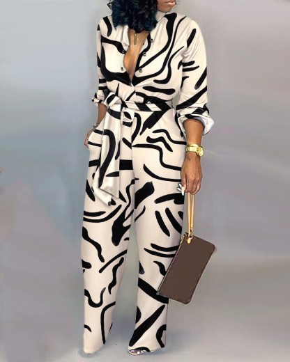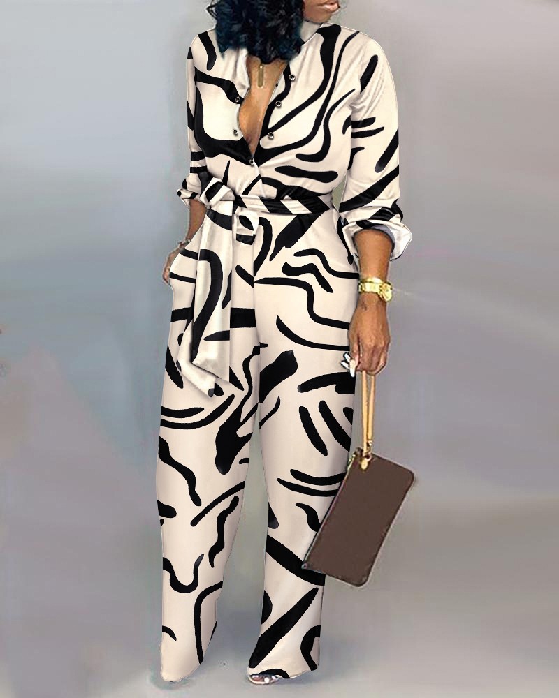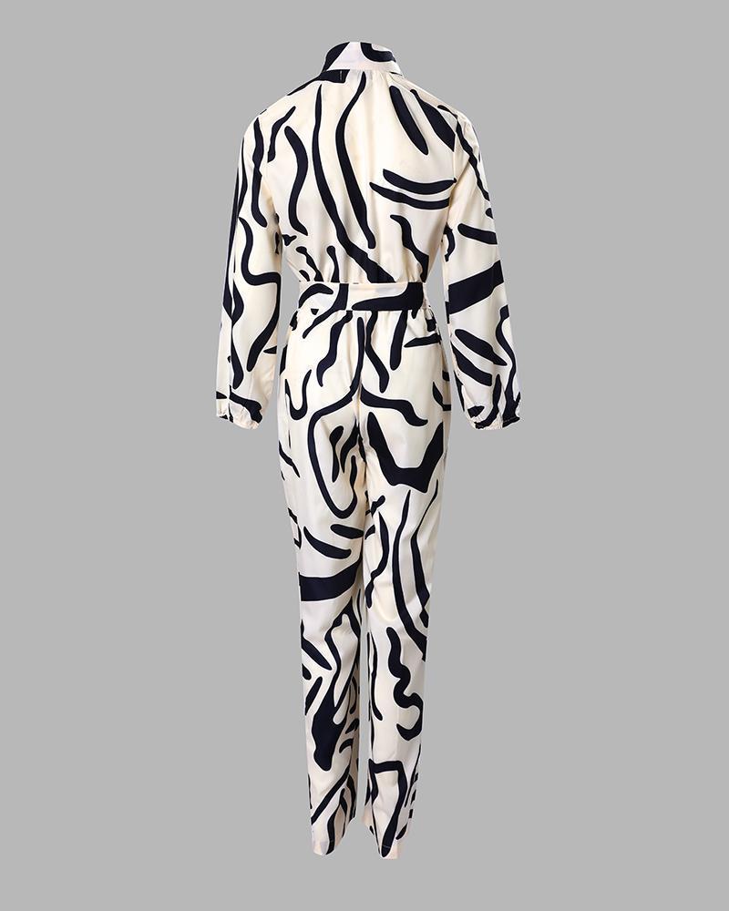 Abstract Print Long Sleeve Belted Jumpsuit