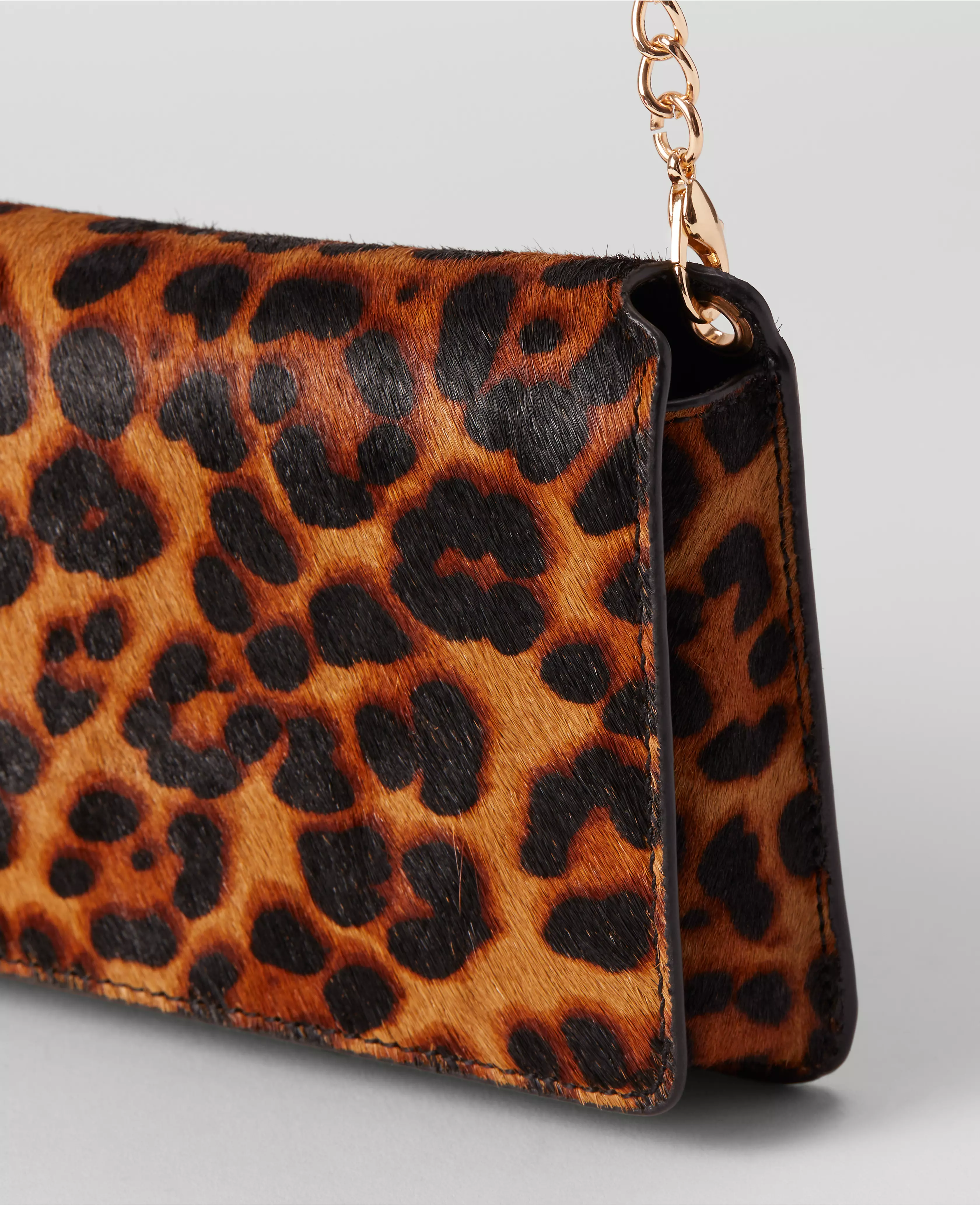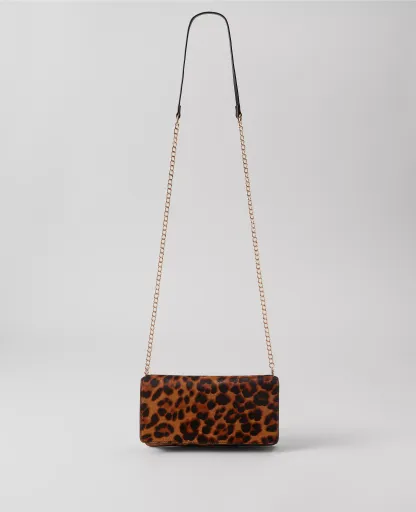 Our haircalf mini crossbody bag adds the perfect touch of animal intrigue. Foldover top. Chain handle. 8 1/2"L x 4 1/2"H x 1/14"W.
