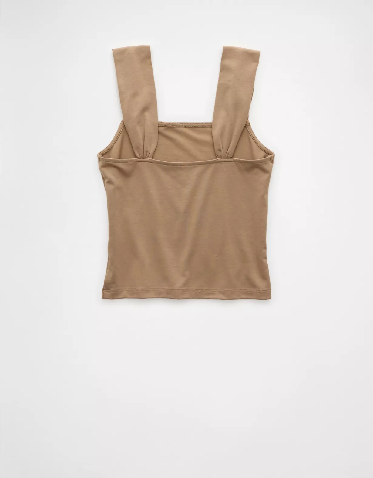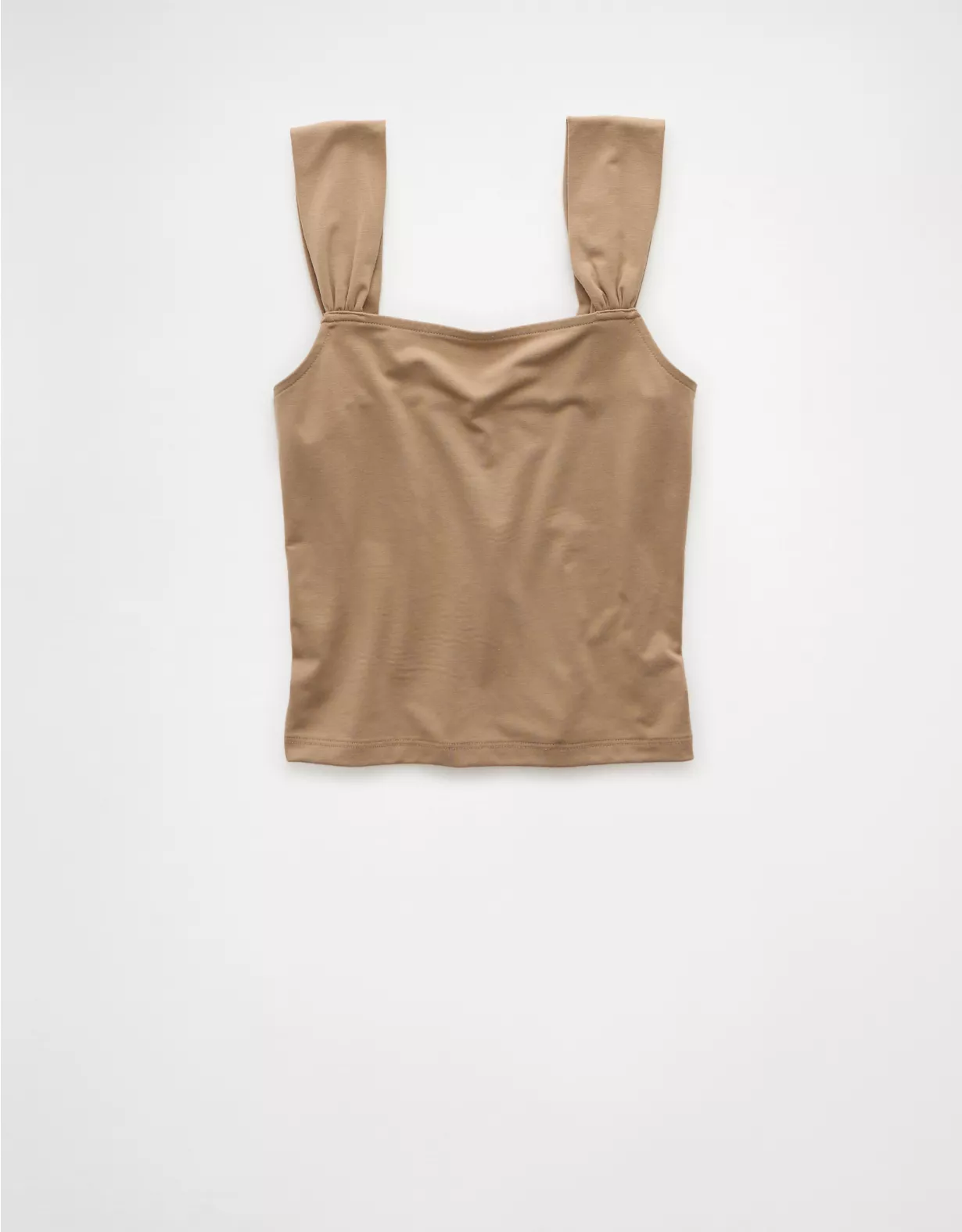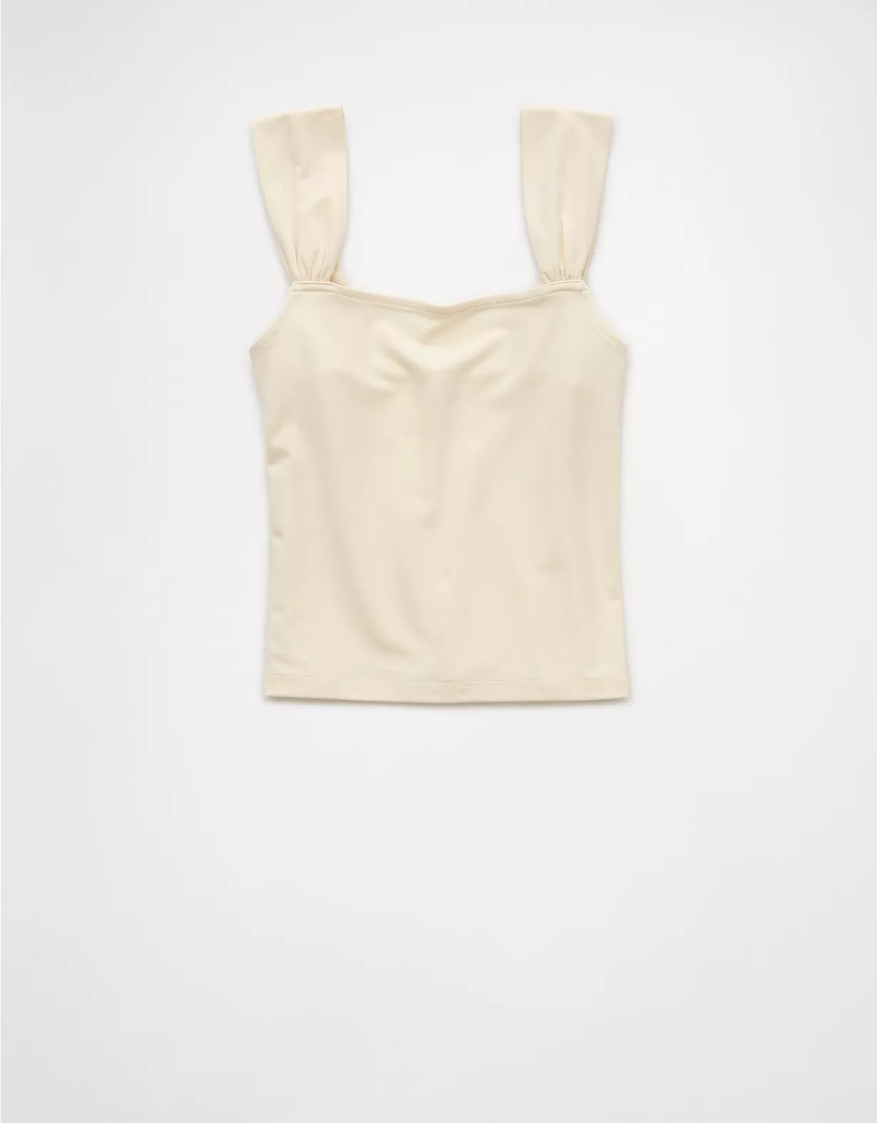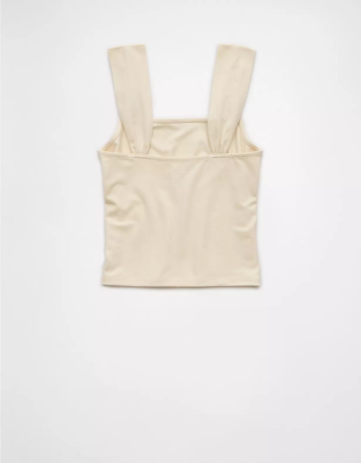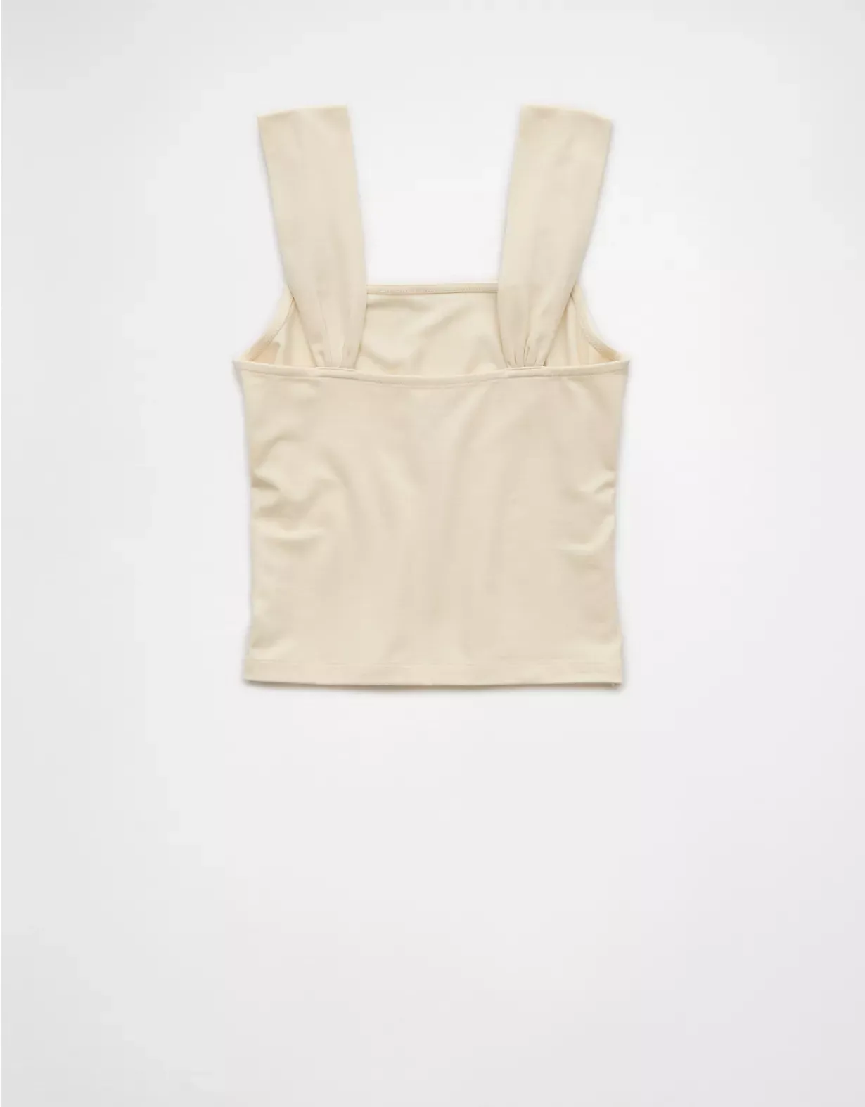 This tank has a cool cropped length and a square neckline with a cinch front. Complete the look with high-waisted denim shorts and 70's sunnies.