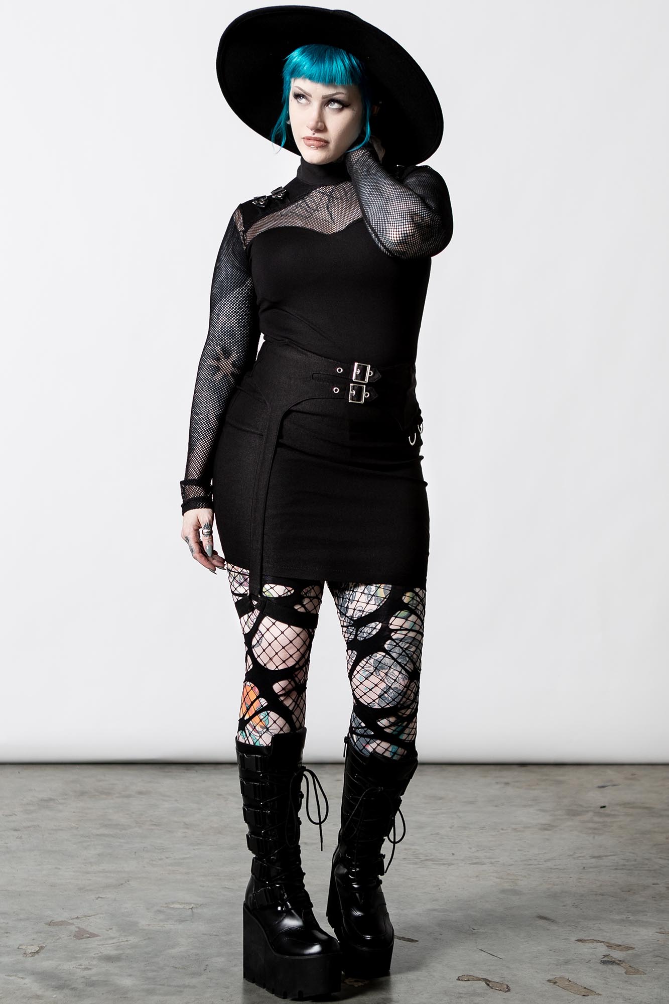 Turn heads in our 'Arch Enemies' fishnet top; conjured from a stretch mesh material for a comfortable fit! Featuring a high neck, silver hardware on shoulders and long mesh sleeves. This is the perfect top for adding some extra darkness to any outfit.