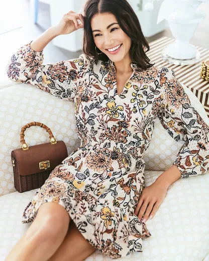 Easy fit, notch neck dress with a stand collar, smocked waist, long sleeves, and a hem ruffle.
