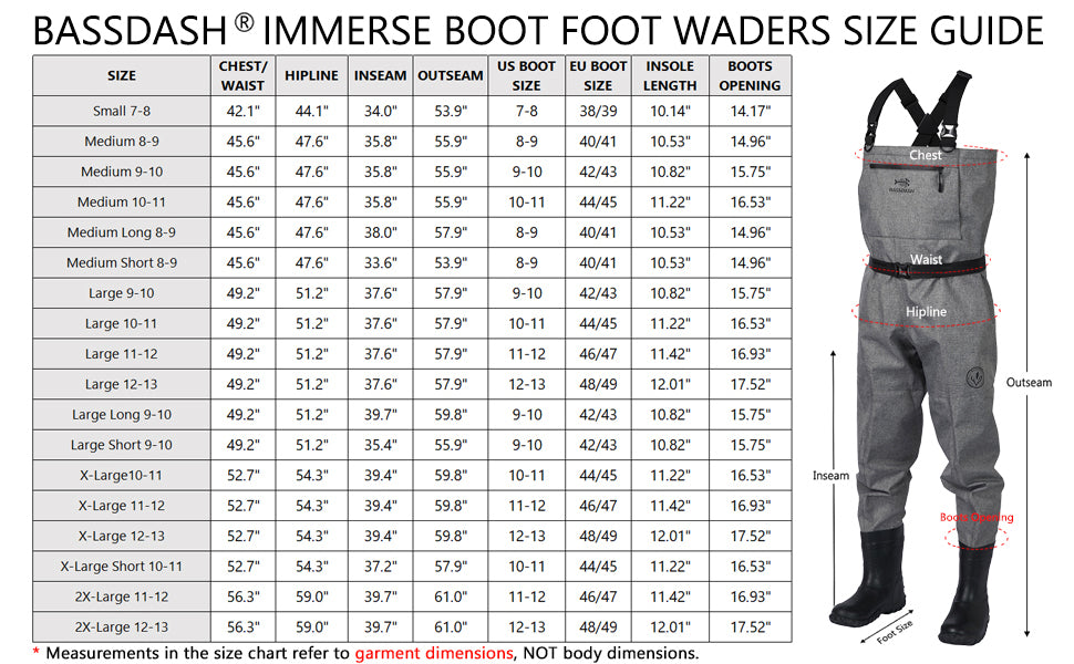 • Don't forget to purchase a size that is loose enough to accommodate wading pants and a fleece top underneath - usually the chest/waist measurements of the waders need to be at least 6~10 inches larger than your body chest/waist sizes, depending on the thickness of your layers underneath.