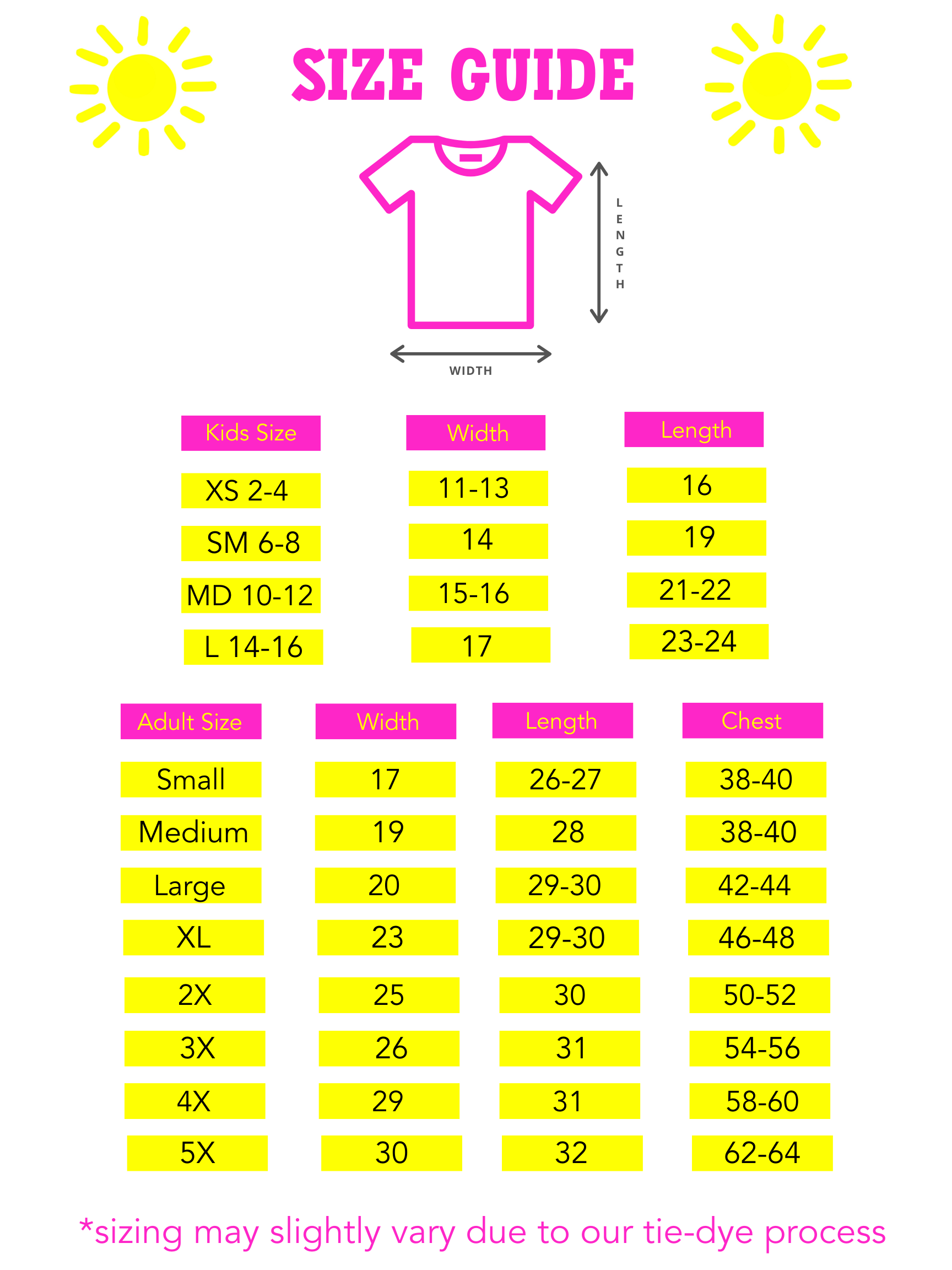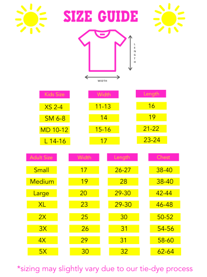 All of our tie-dye tees are hand dyed and fit true to size. Our tie-dye is hand dyed so colors and patterns may vary, which we believe is the true beauty of our tees. Our Be Kind Tees are unique just like YOU!!