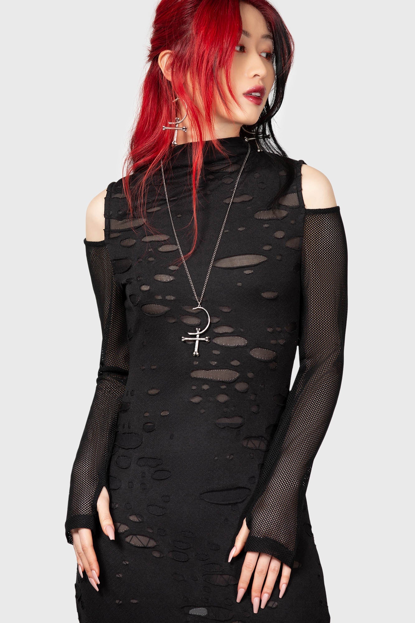 - Long fishnet sleeves with thumbholes.