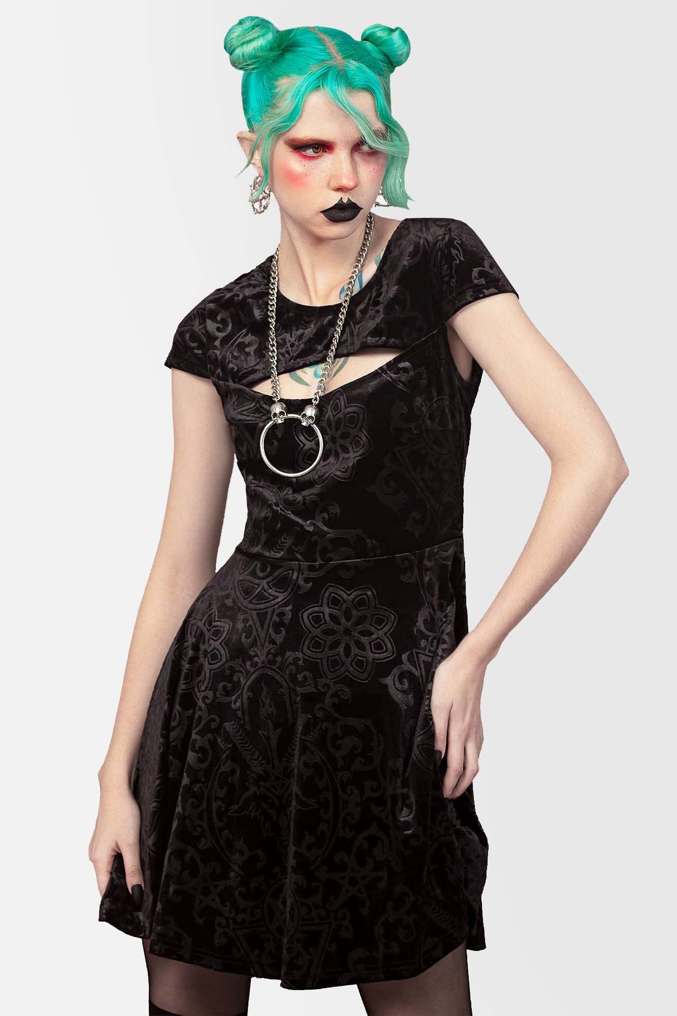 Get ready to cause chaos in our ‘Blasphemia’ Keyhole skater dress; conjured using a custom-made burnout velvet which stretches to perfection for a wicked fit! With this spellbinding high neck and keyhole cut-out you're gonna be ready to rock the witching hour.