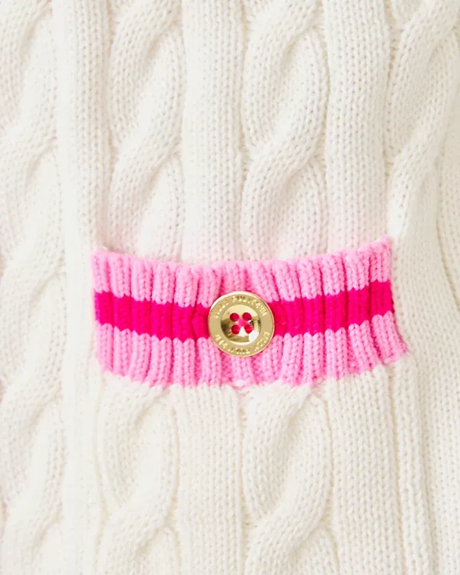 Long sleeve, collared, cable stitch cardigan with buttons, pockets, and stripe details.