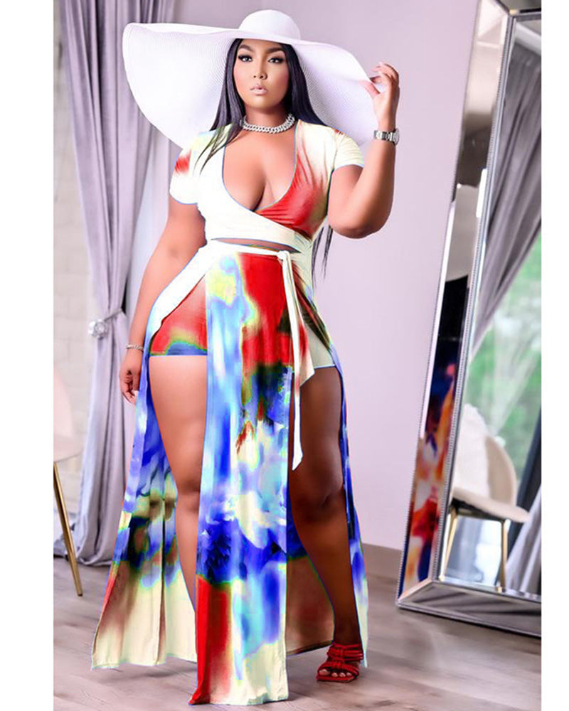 Features a sleeveless, multi color romper with front slits. Shorts attached