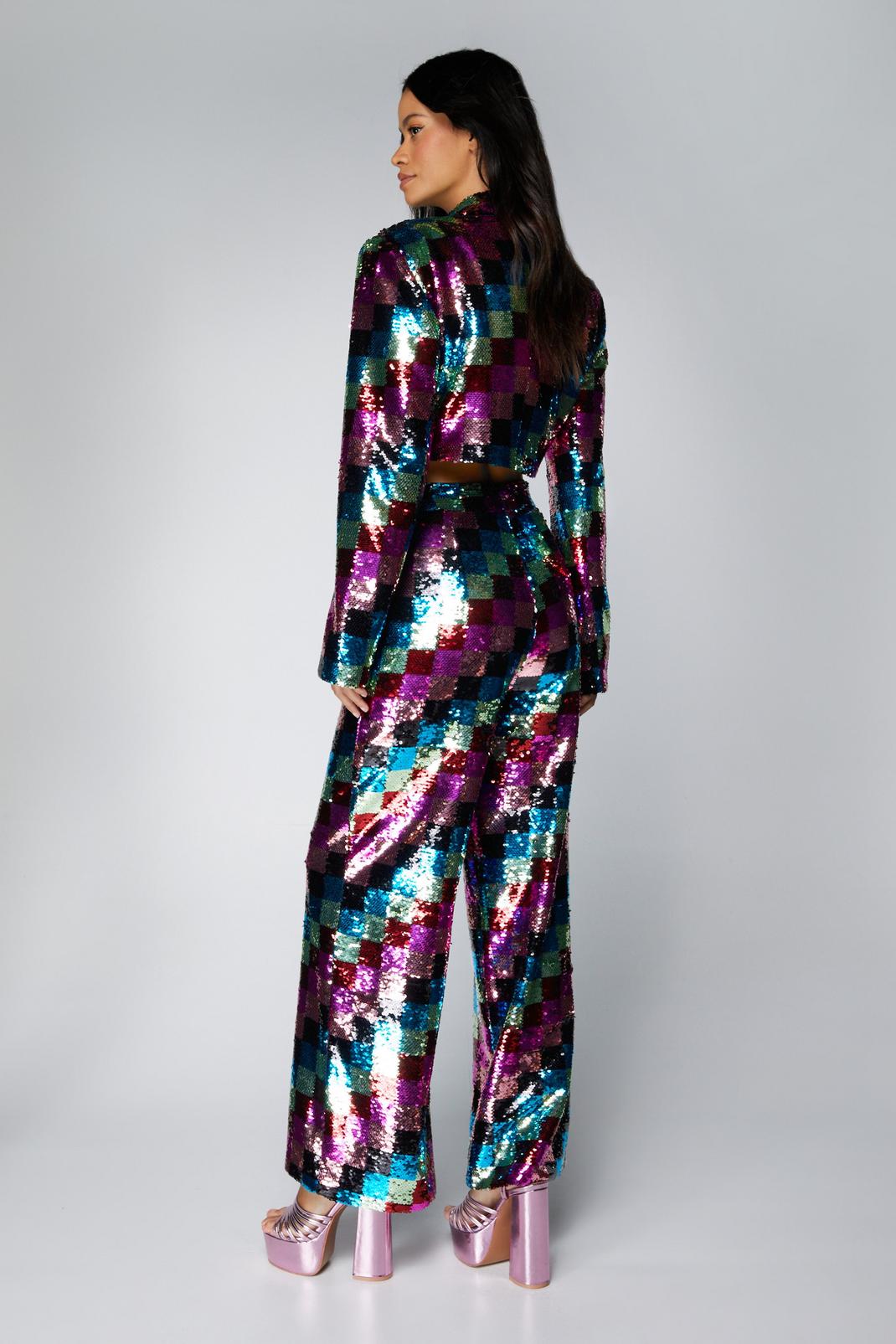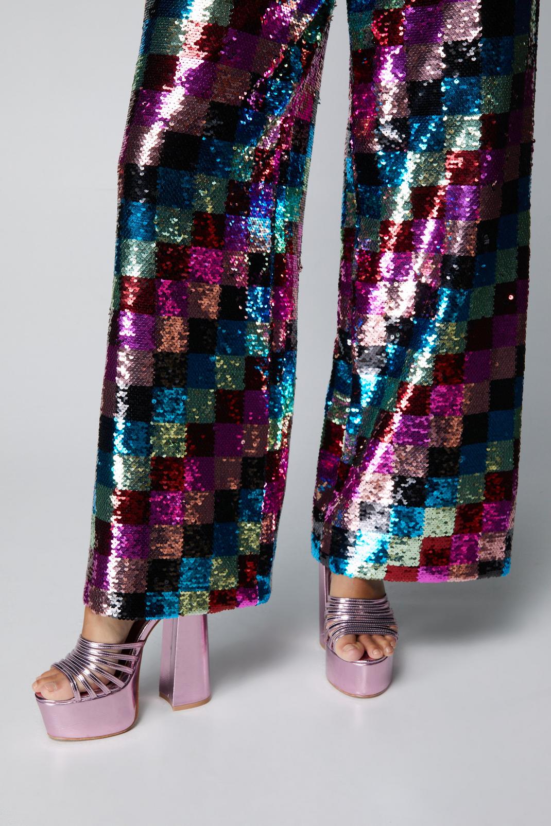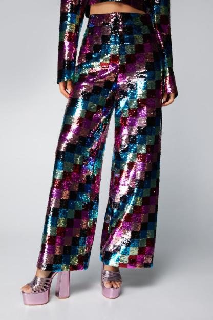Check mate. Feel confident in our sequin pants, made in high quality, sparkling sequin fabric, with a unique checkerboard pattern, a wide leg silhouette, and a high waist. Style with the matching blazer and boots for a look that will take you to all of your upcoming parties and occasions.