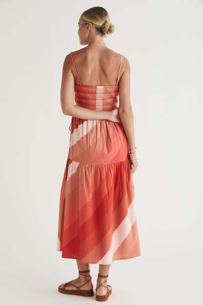 In an exclusive tonal yarn dye stripe fabric, the Circe Midi Dress is a Spring weekend essential. Feel effortless in the smocked bodice, midi length dress. Featuring detailed patterned stitching, practical side pockets, and unique MOS details ~ pair with a chunky sandal for everyday or a colourful heel for your next event.