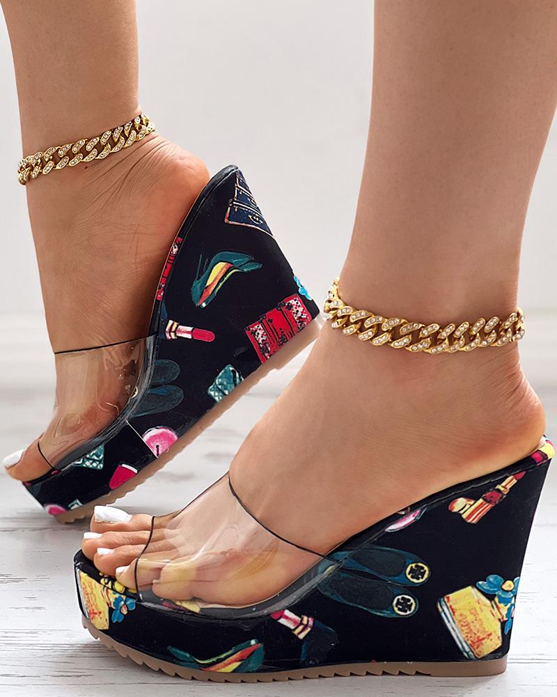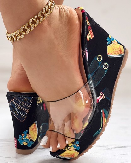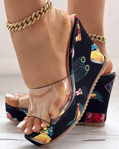 Clear Perspex Graphic Print Wedge Slippers