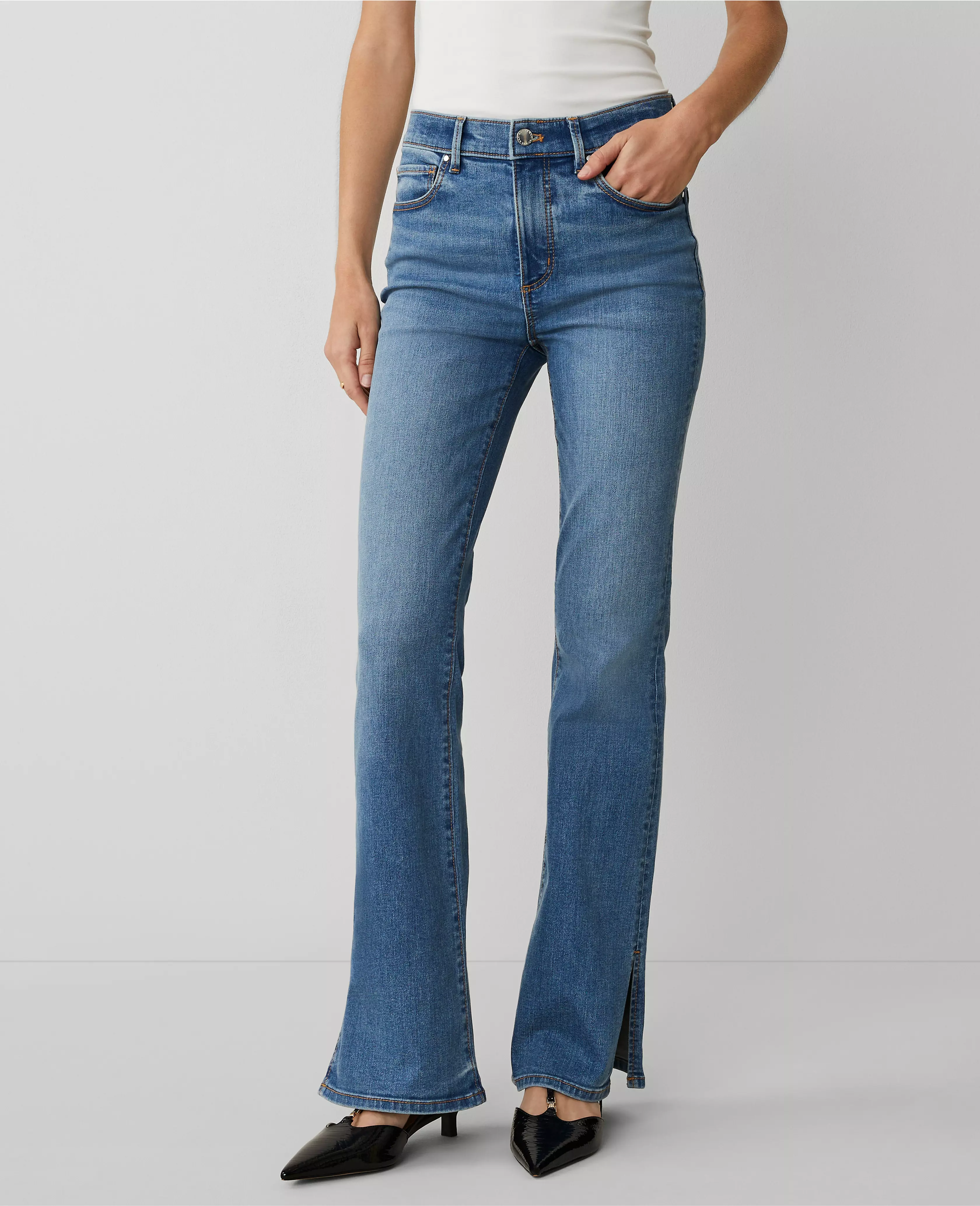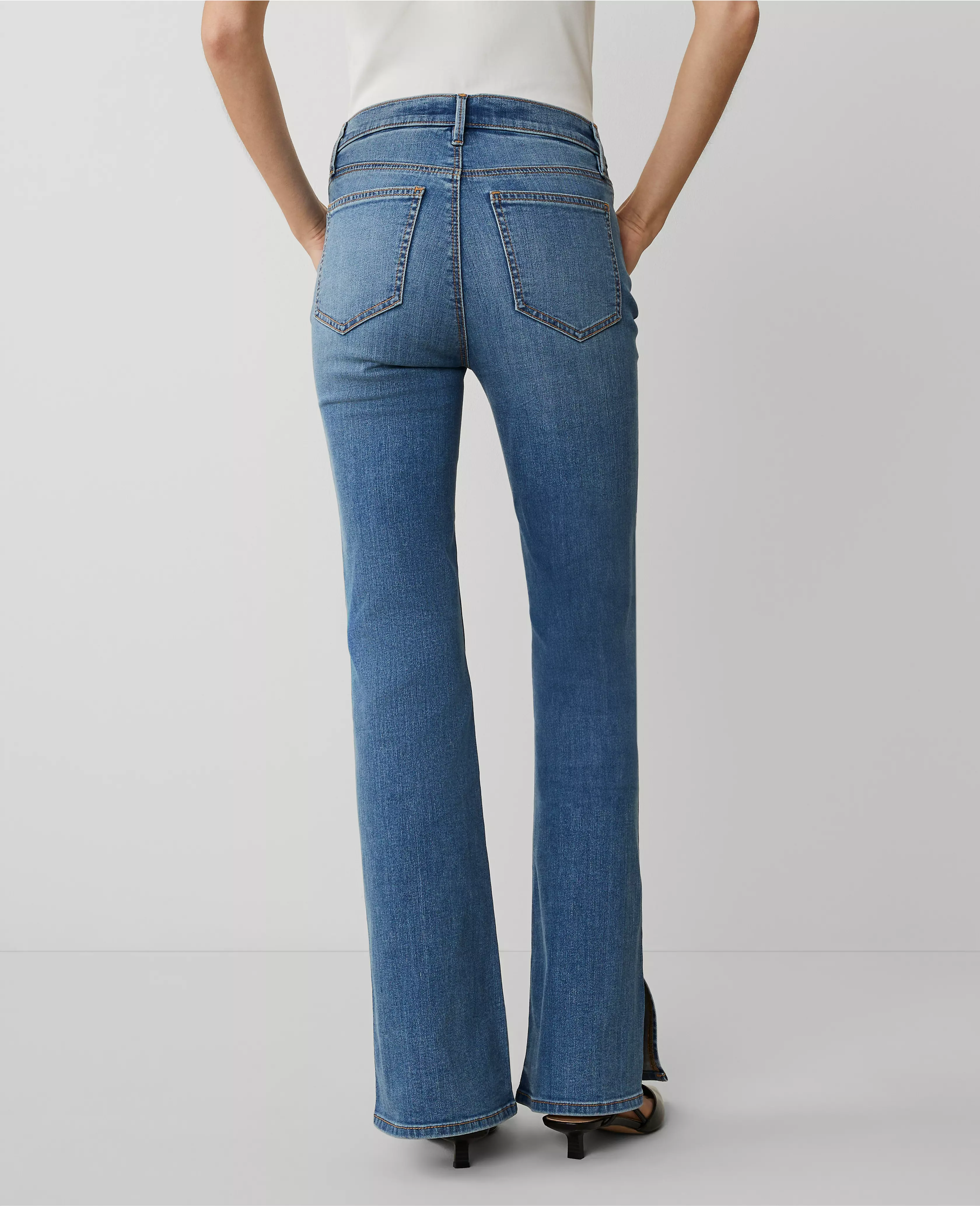 Our boot cut jeans are designed with new pockets that smooth, flatter and hold their shape. Performance stretch denim sculpts, shapes and supports all day long. Front zip with button closure. Belt loops. Classic five-pocket styling. Vent hem.