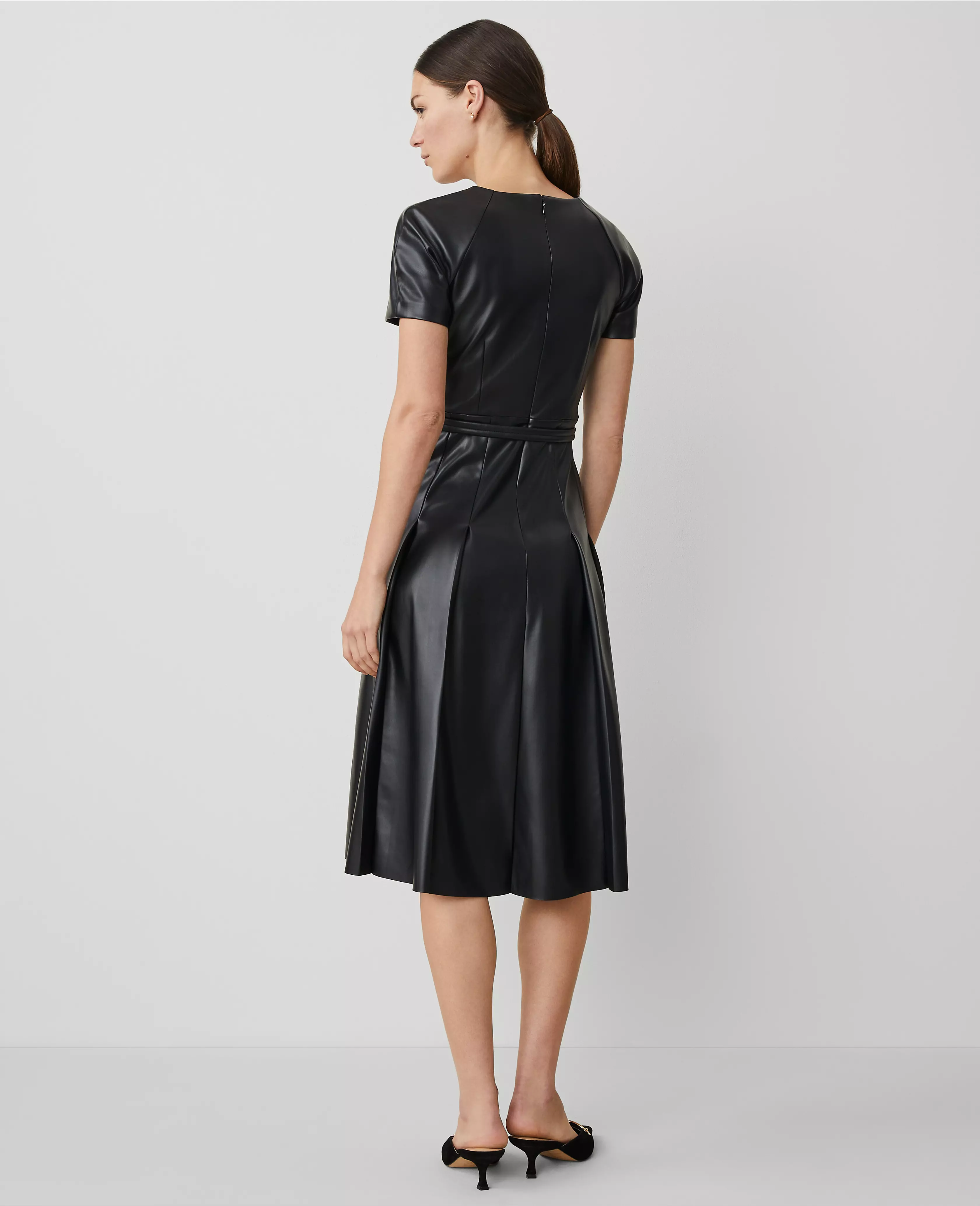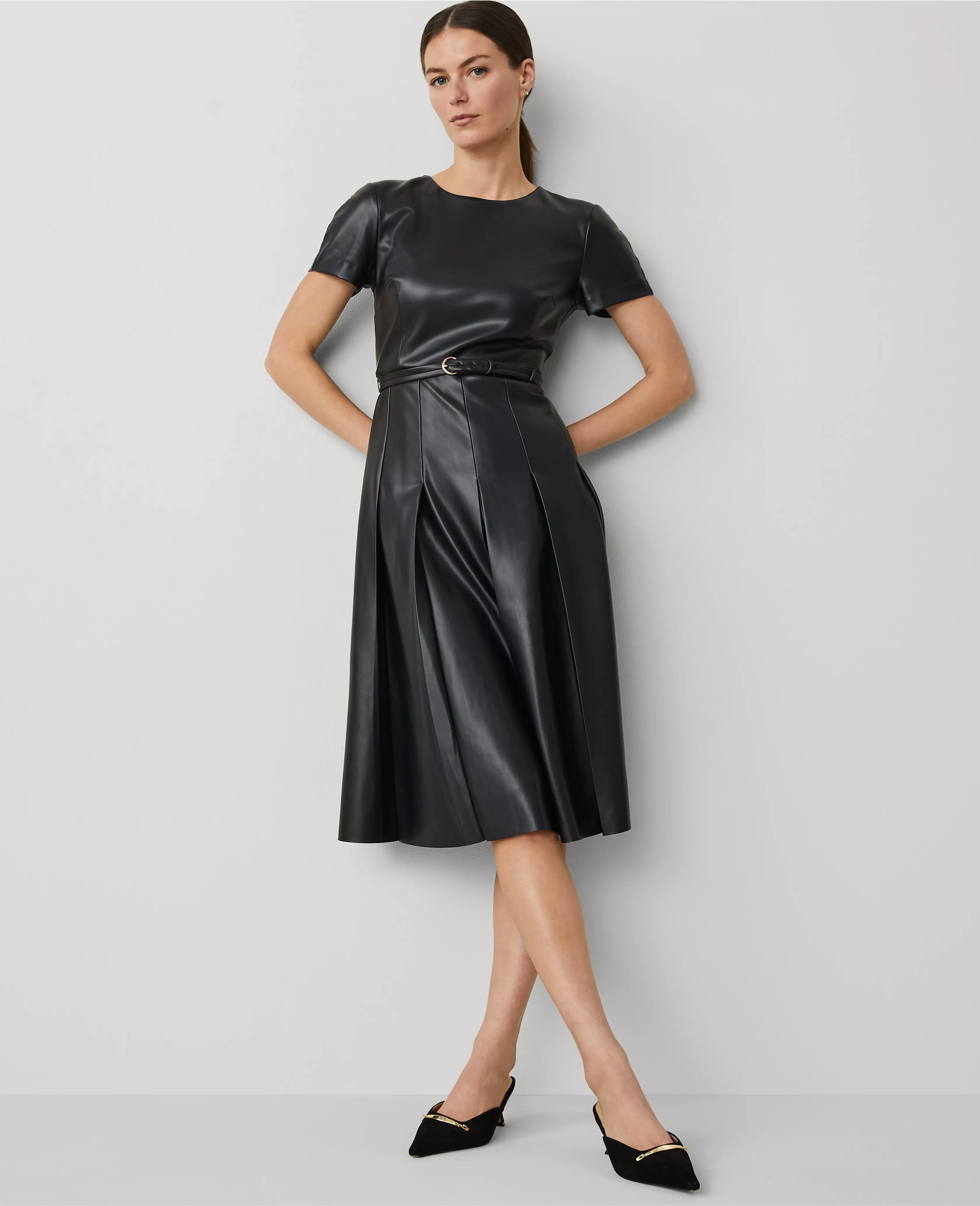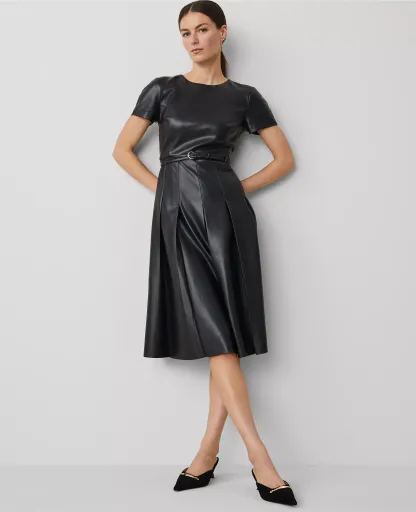 Our luxe faux leather midi dress features a refined pleated skirt, for irresistibly feminine edge. Crew neck. Short sleeves with back raglan seams. Self tie buckle belt. Hidden back zipper with hook-and-eye closure. Lined body.