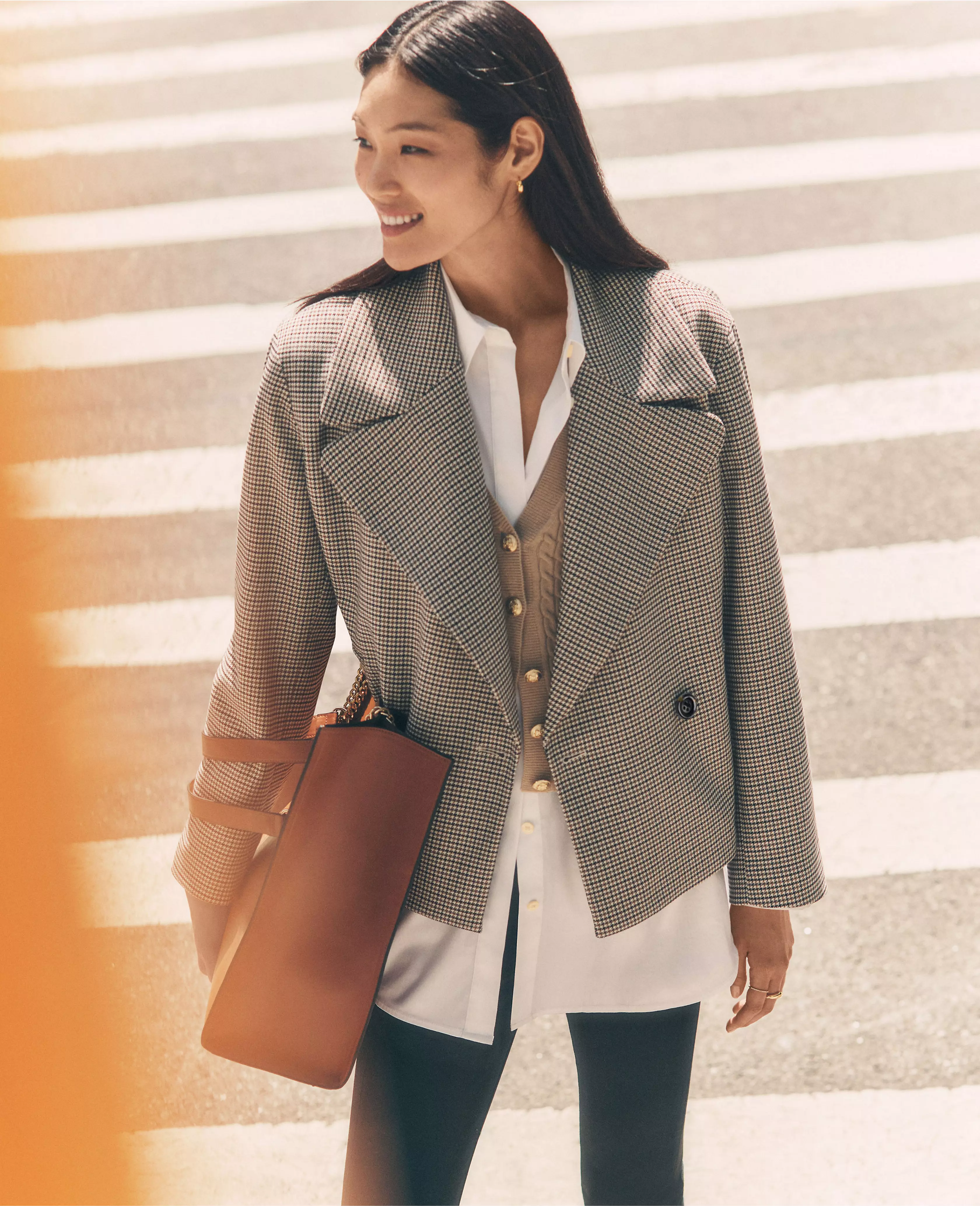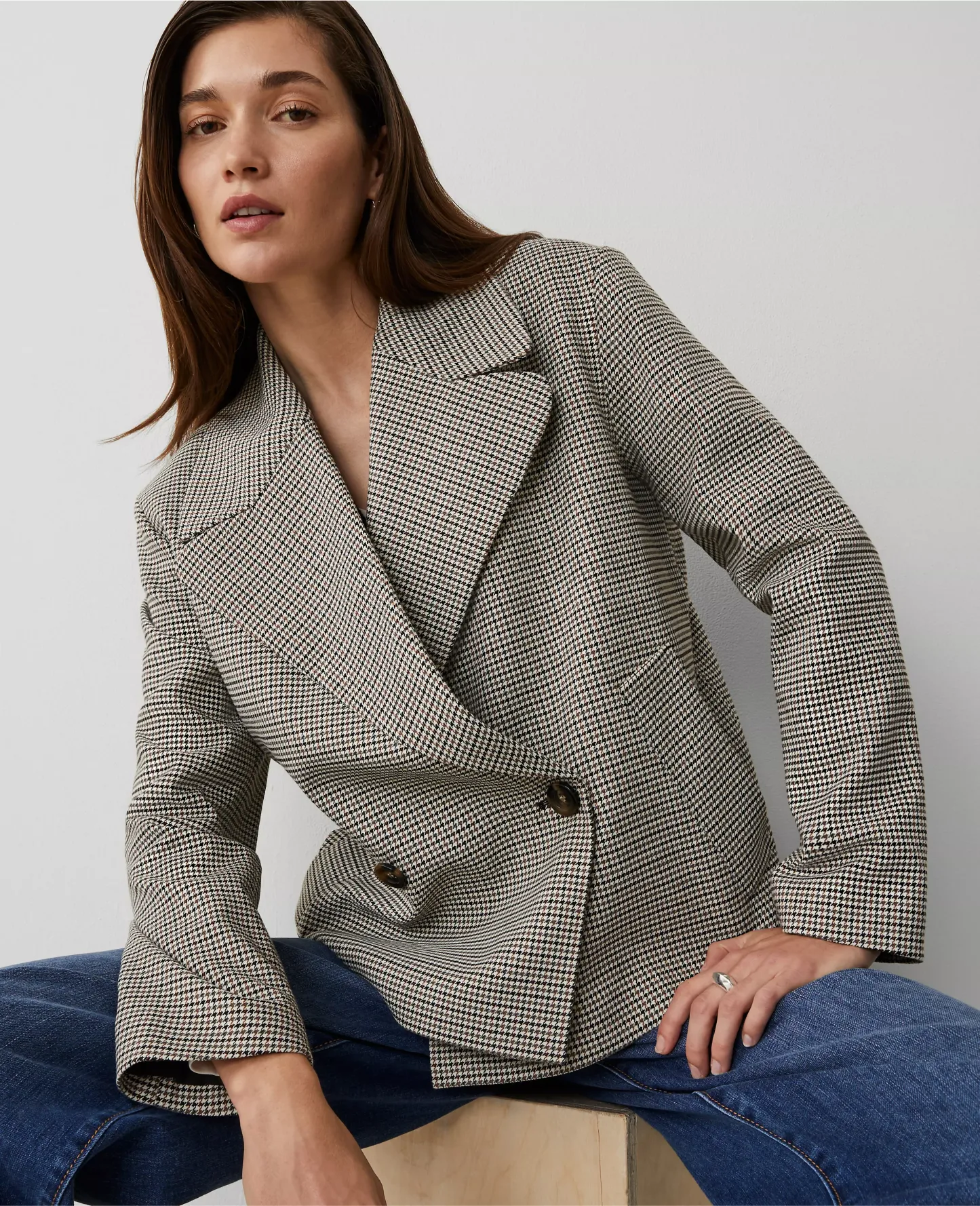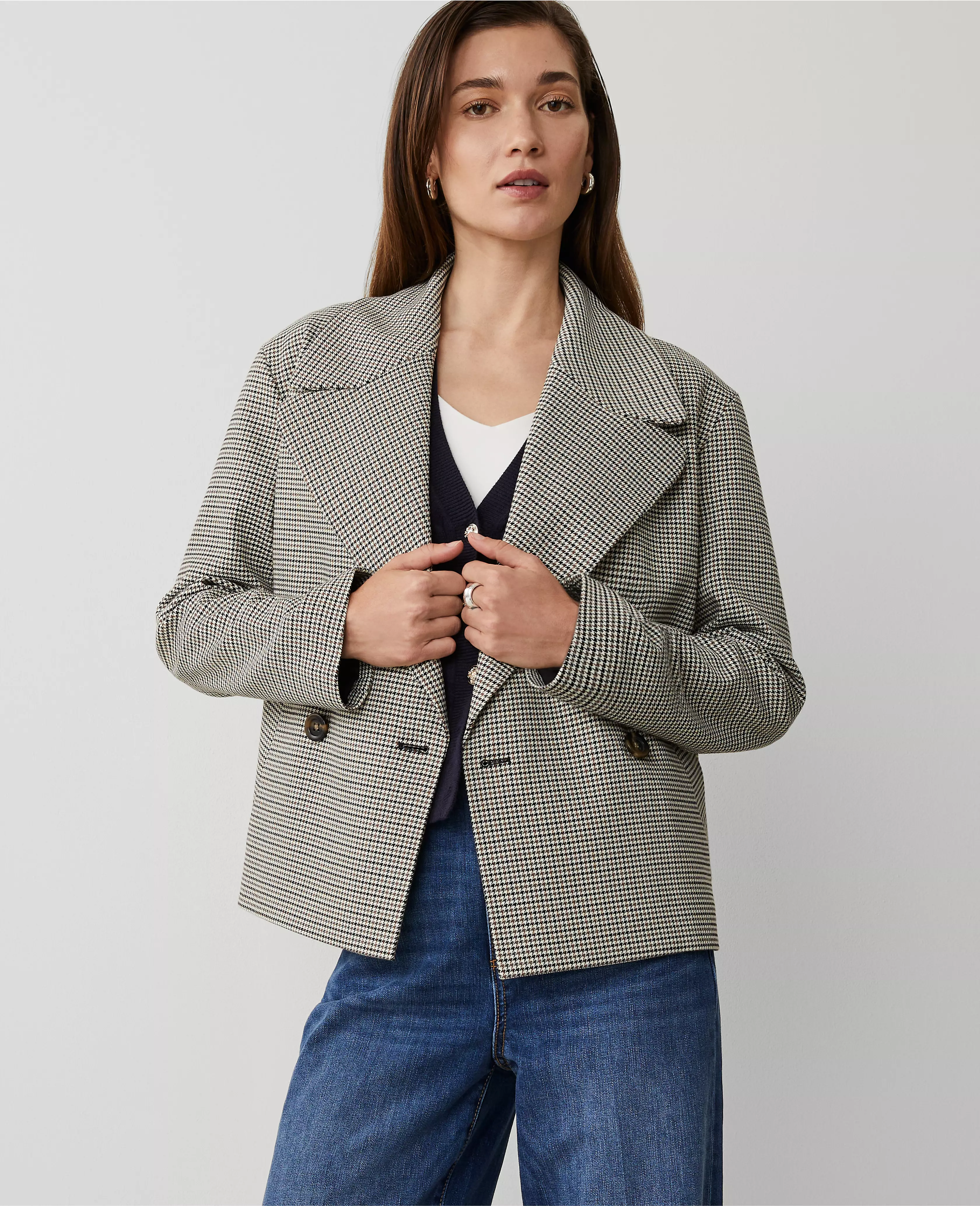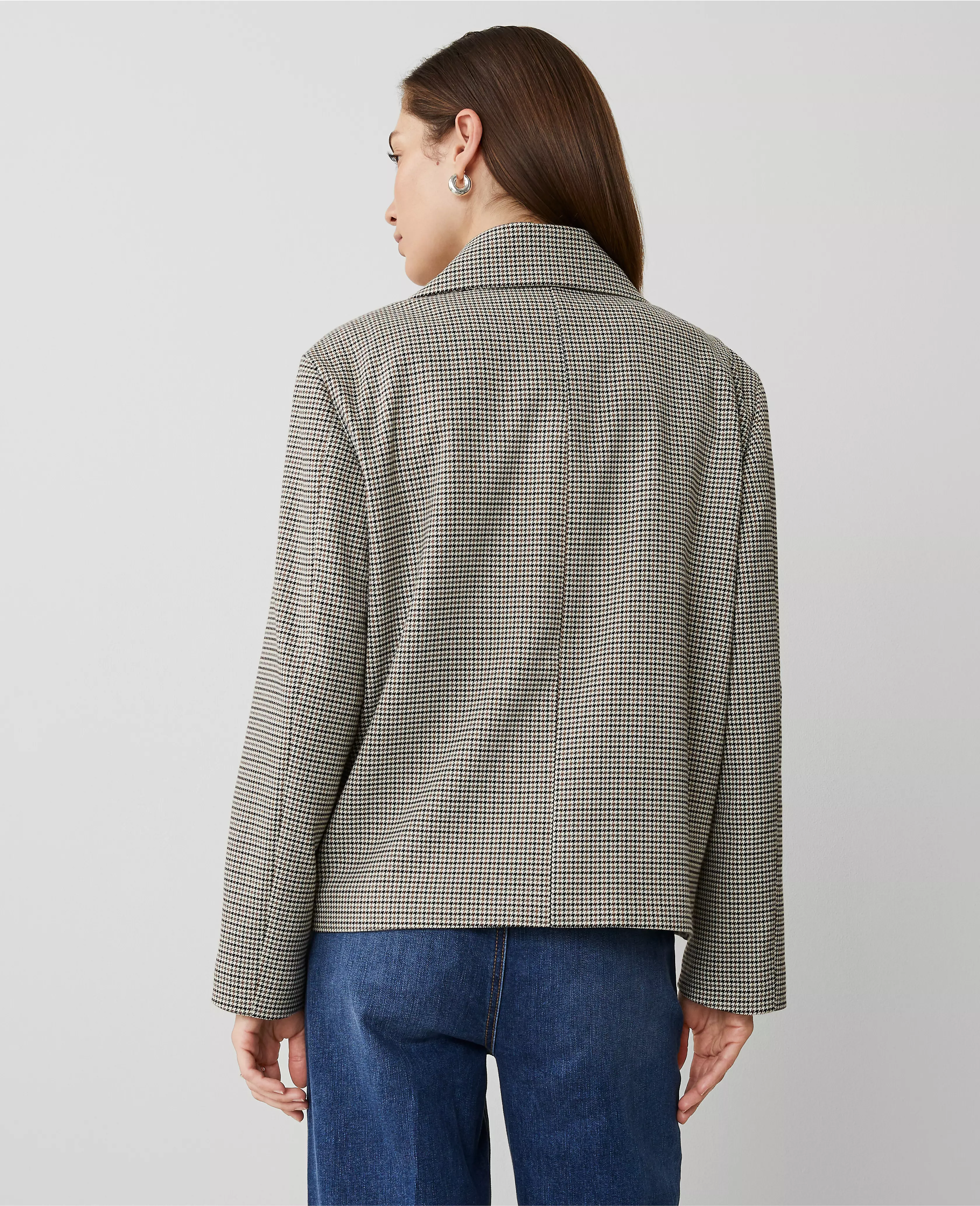 We gave the classic trench a modern update, with refined houndstooth and a swingy silhouette. Notched lapel. Long sleeves. Double breasted button front. Angled front welt pockets. Lined.