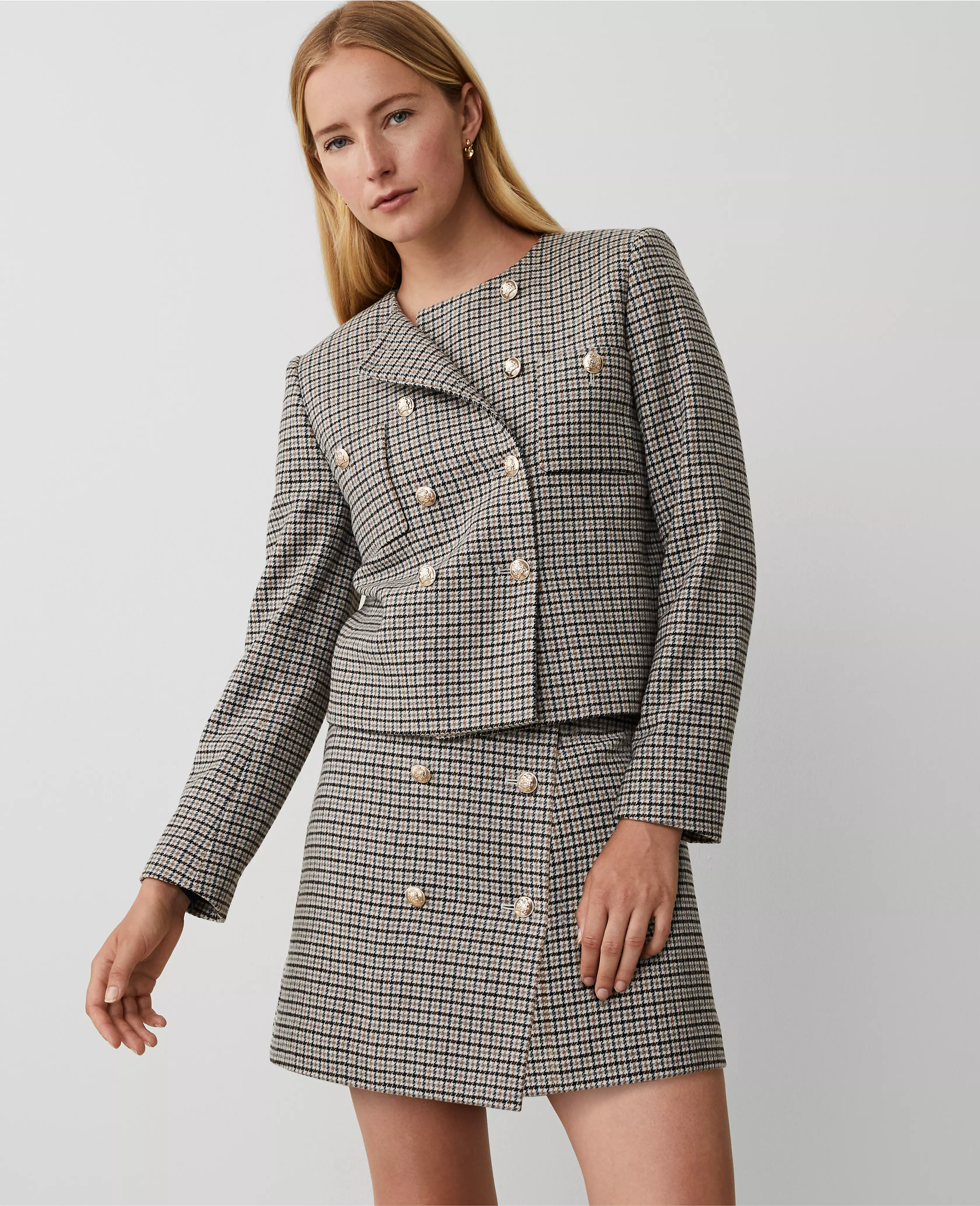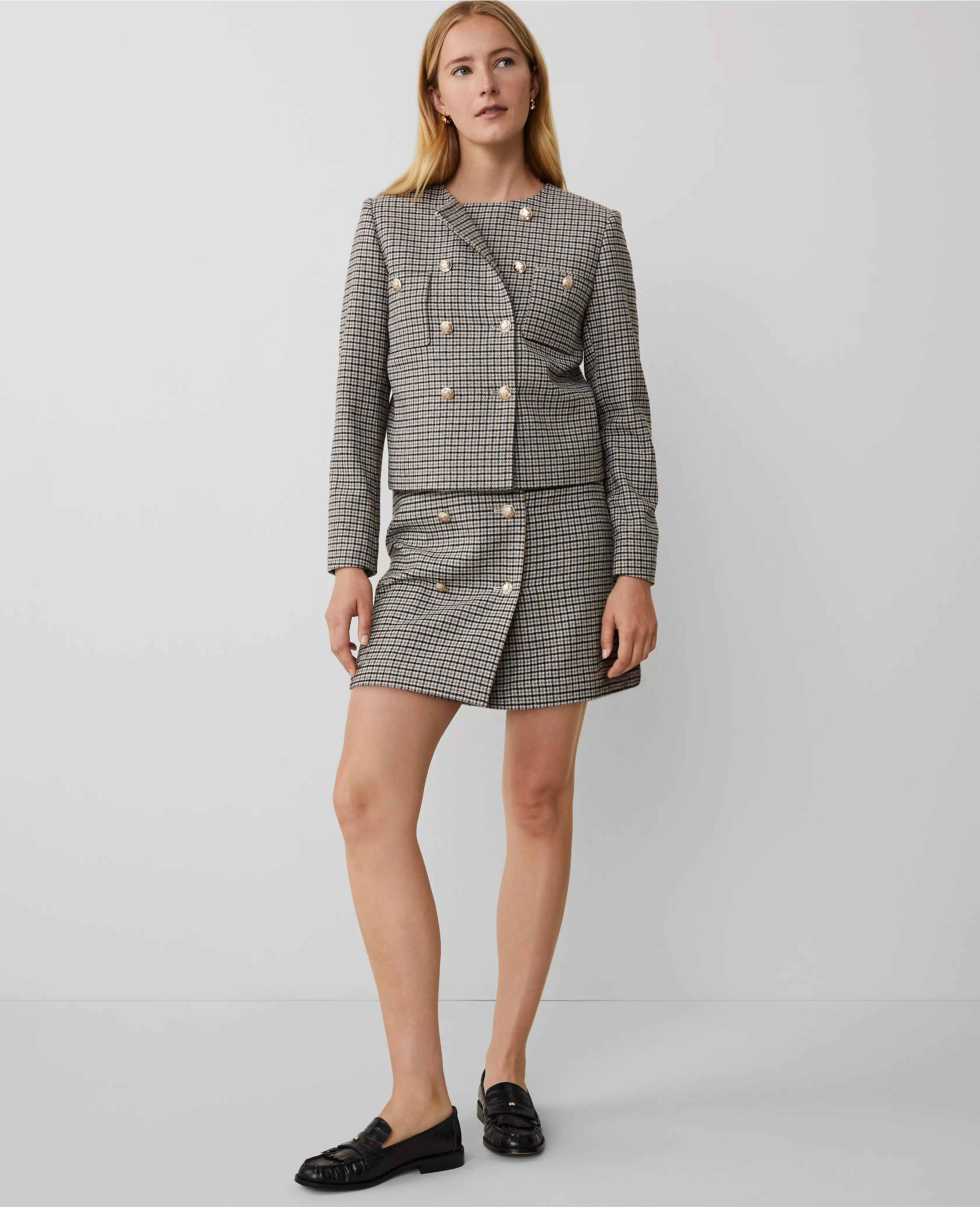 Smartly checked, our double breasted jacket features the addition of chest patch pockets for modern utility. Crew neck. Long sleeves. Double breasted button front. Chest patch pockets with button closure. Lined.