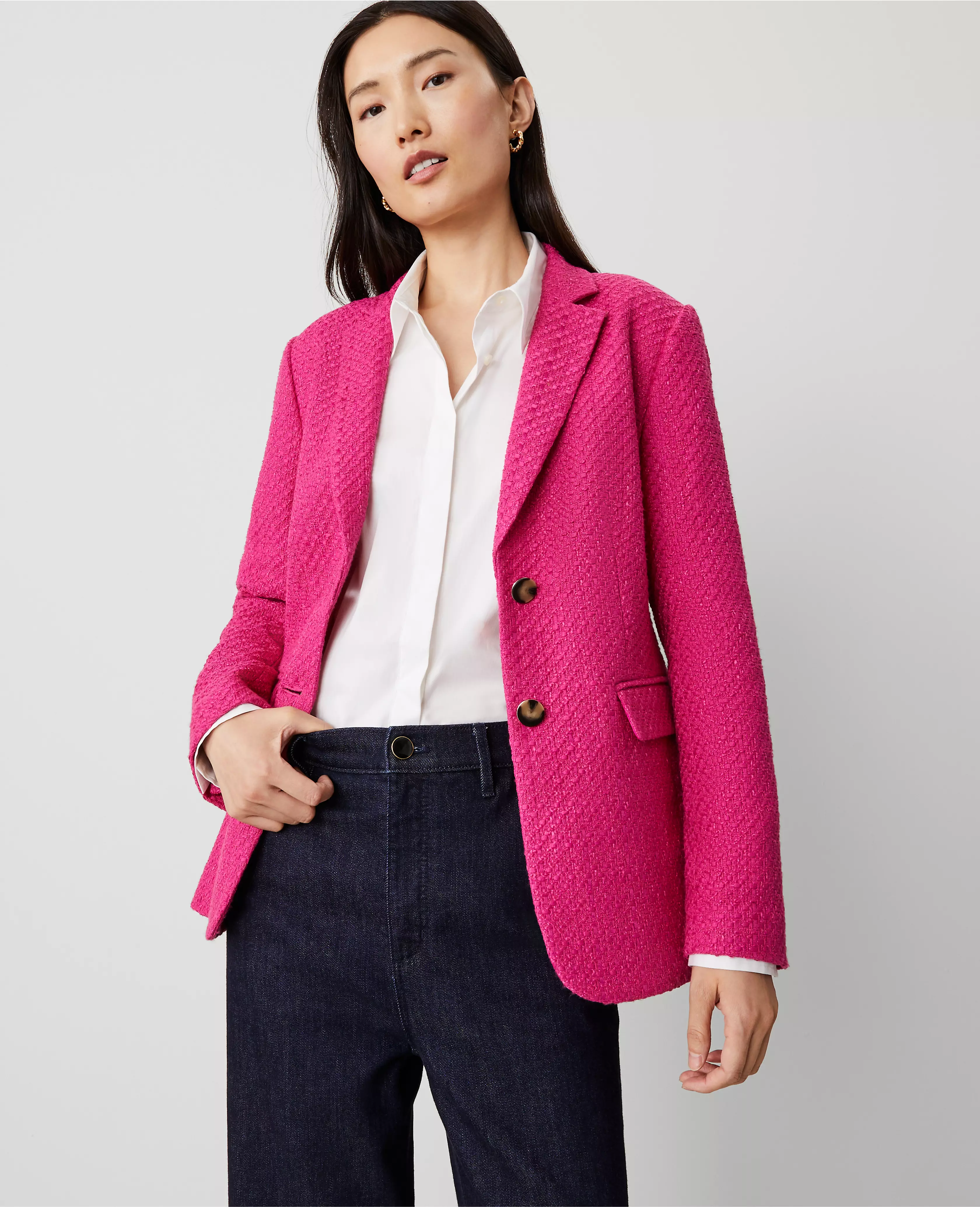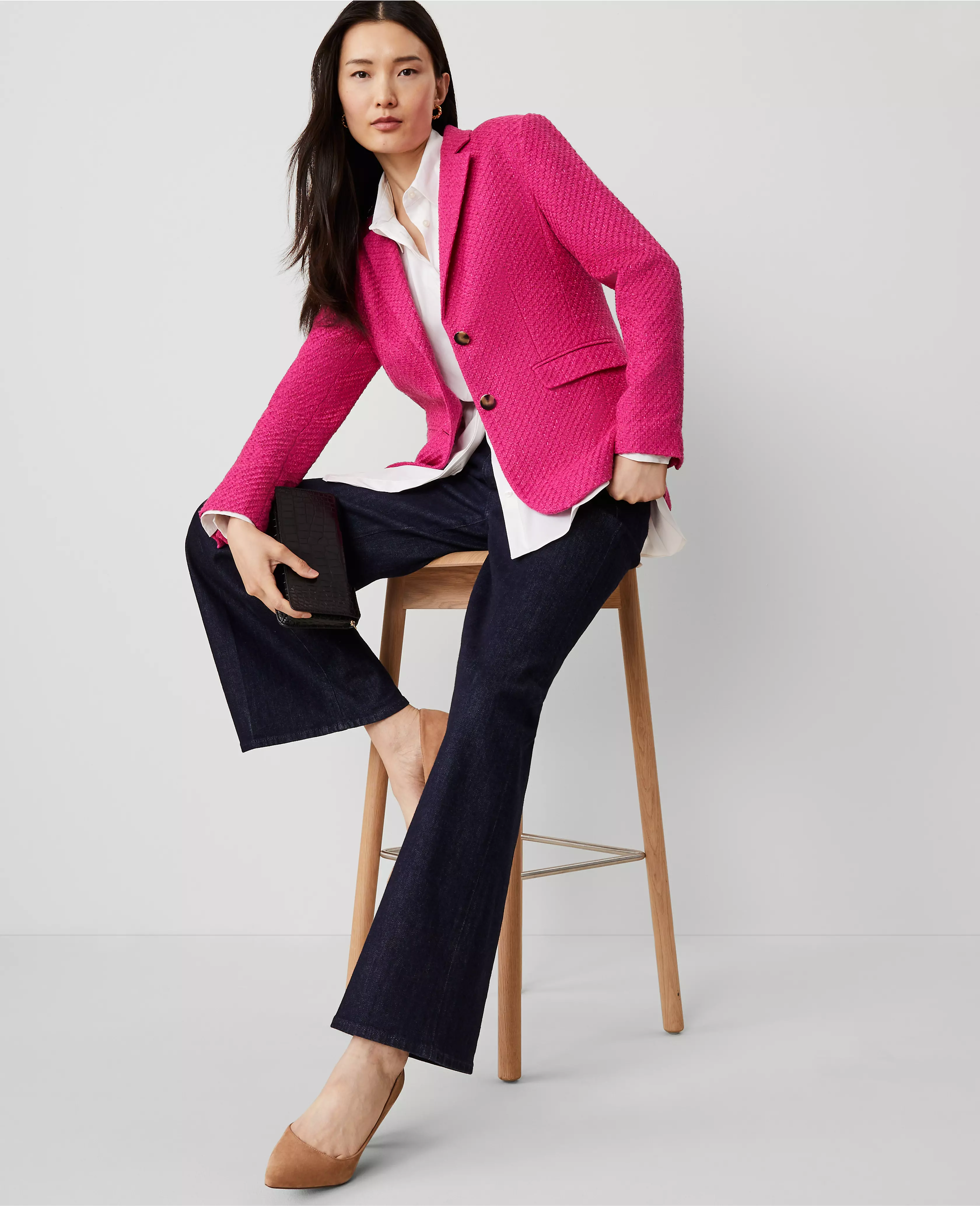 Comfort-chic at its finest, our tailored blazer plays very well with others: mix and match the collection with ease. Notched lapel. Long button-open sleeves allow for versatility in styling. Two-button front. Front flap besom pockets. Back vent. Lined.