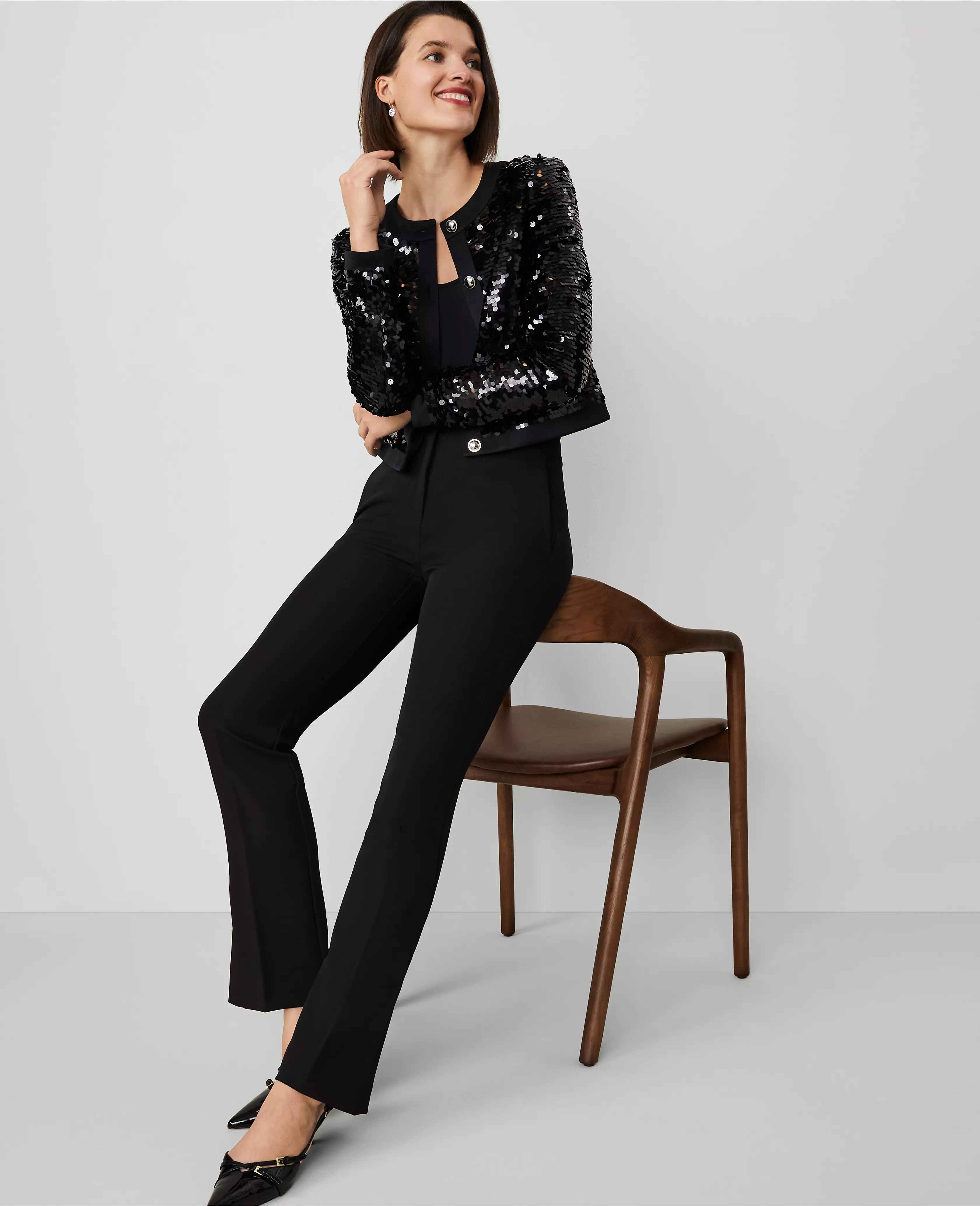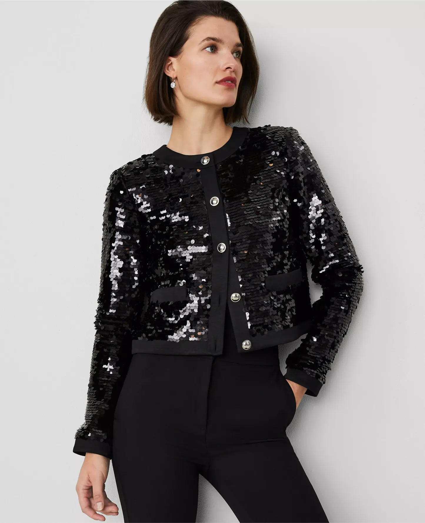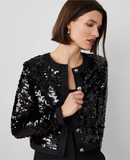 Our sequin crew neck jacket highlights your look with irresistible sparkle. Crew neck. Long sleeves. Button front. Front welt pockets. Lined.