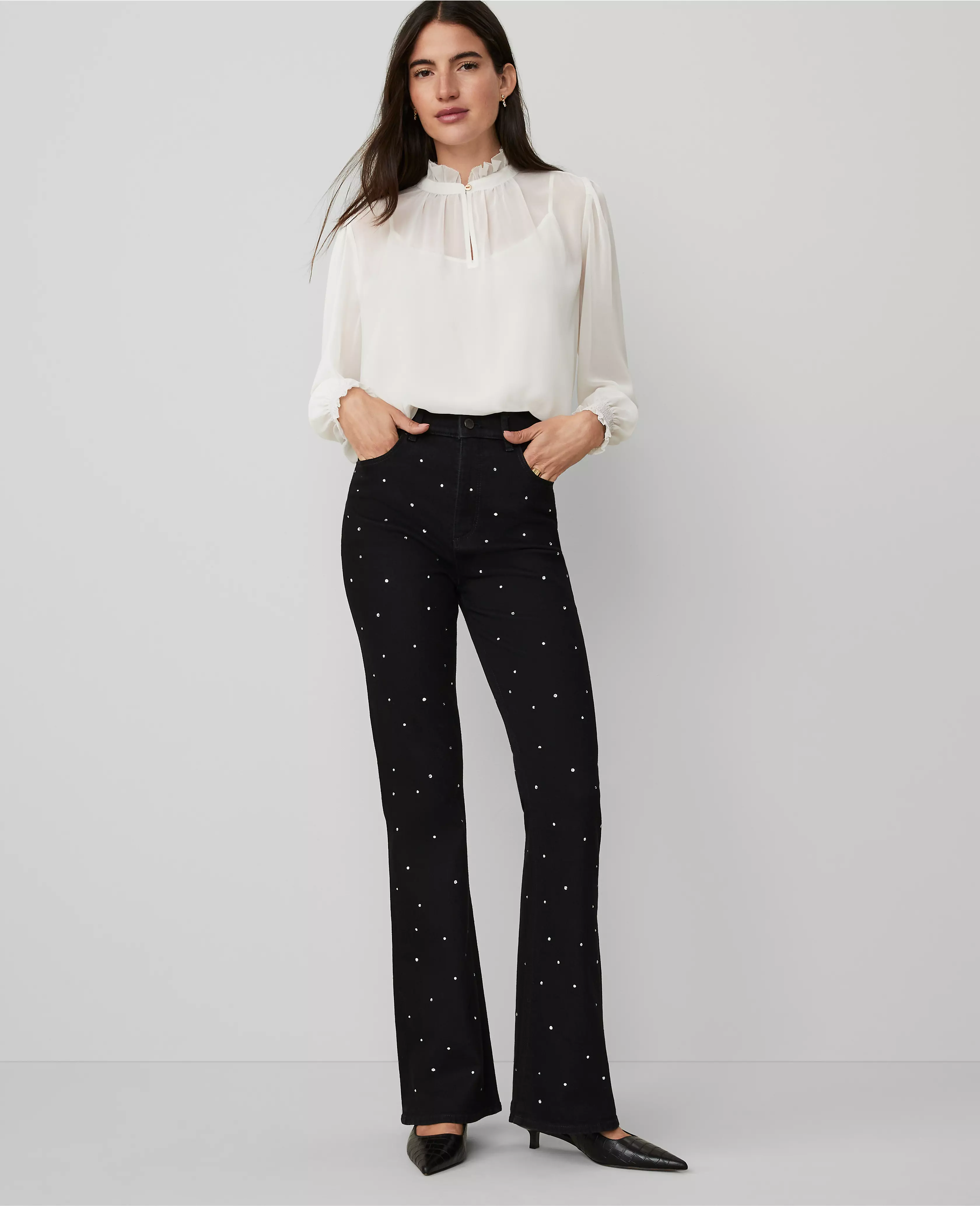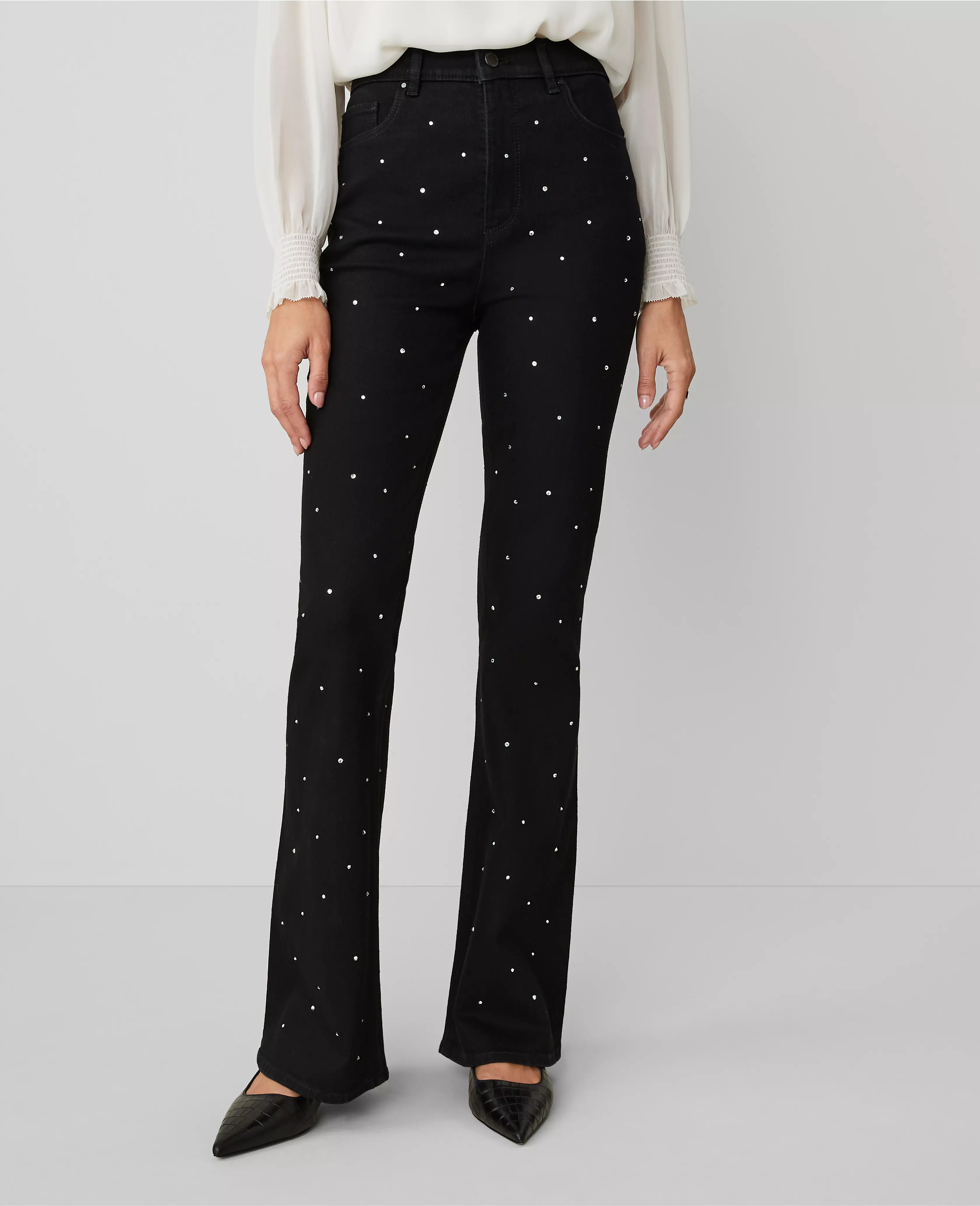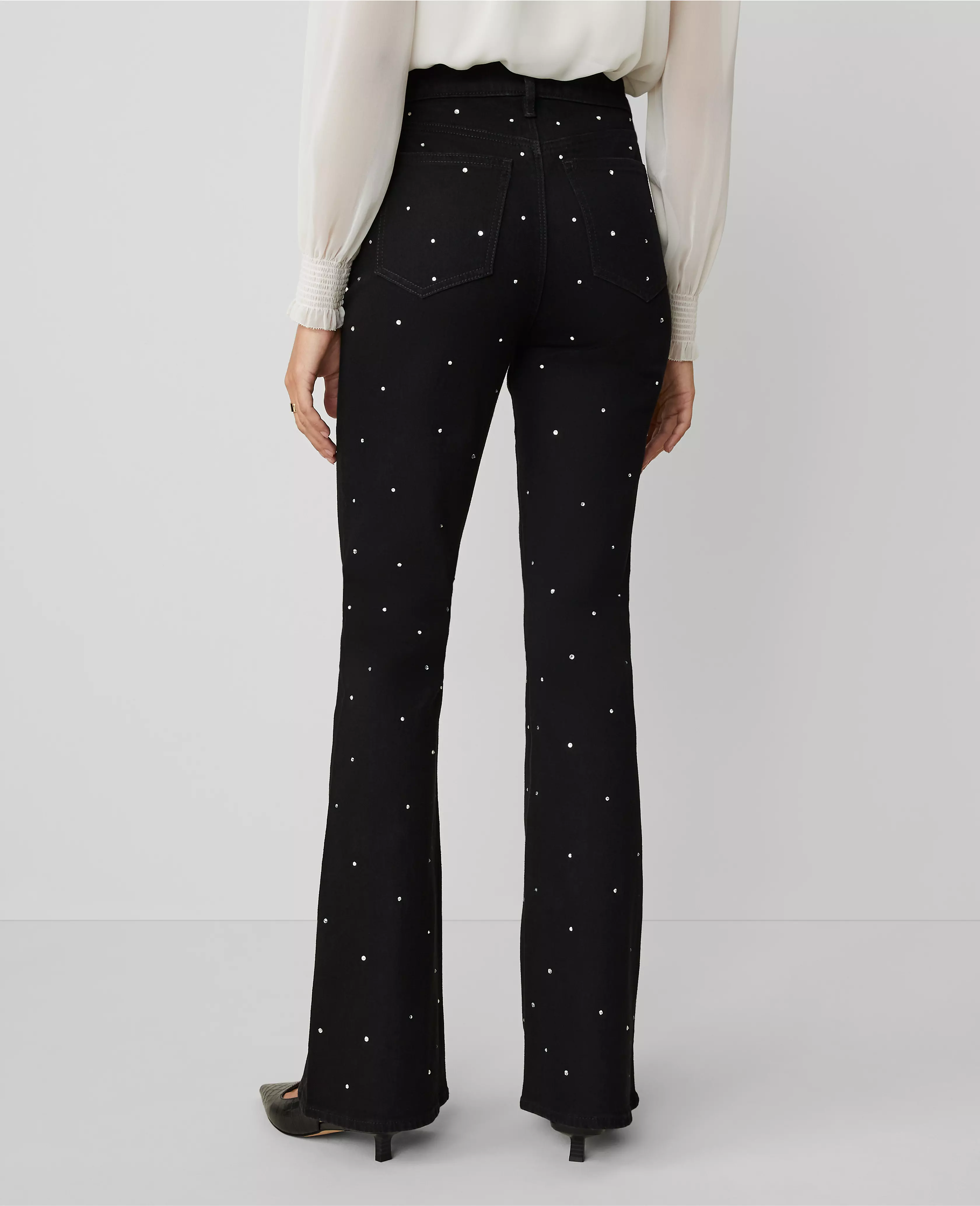 These embellished flare jeans are the perfect balance of modern styling and timeless detail. Front zip with double hook-and-bar closure. Belt loops. Front off-seam pockets. Back besom pockets.