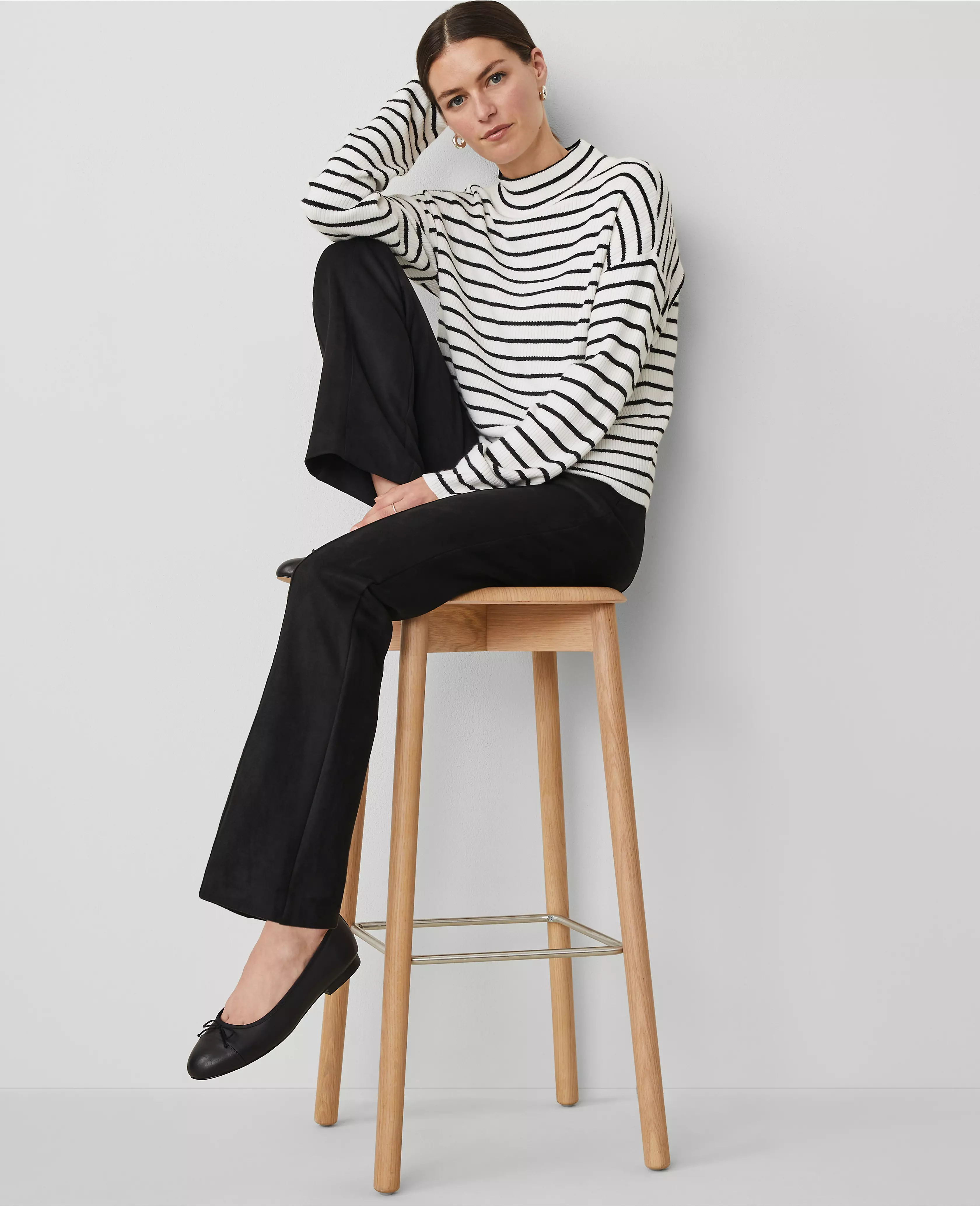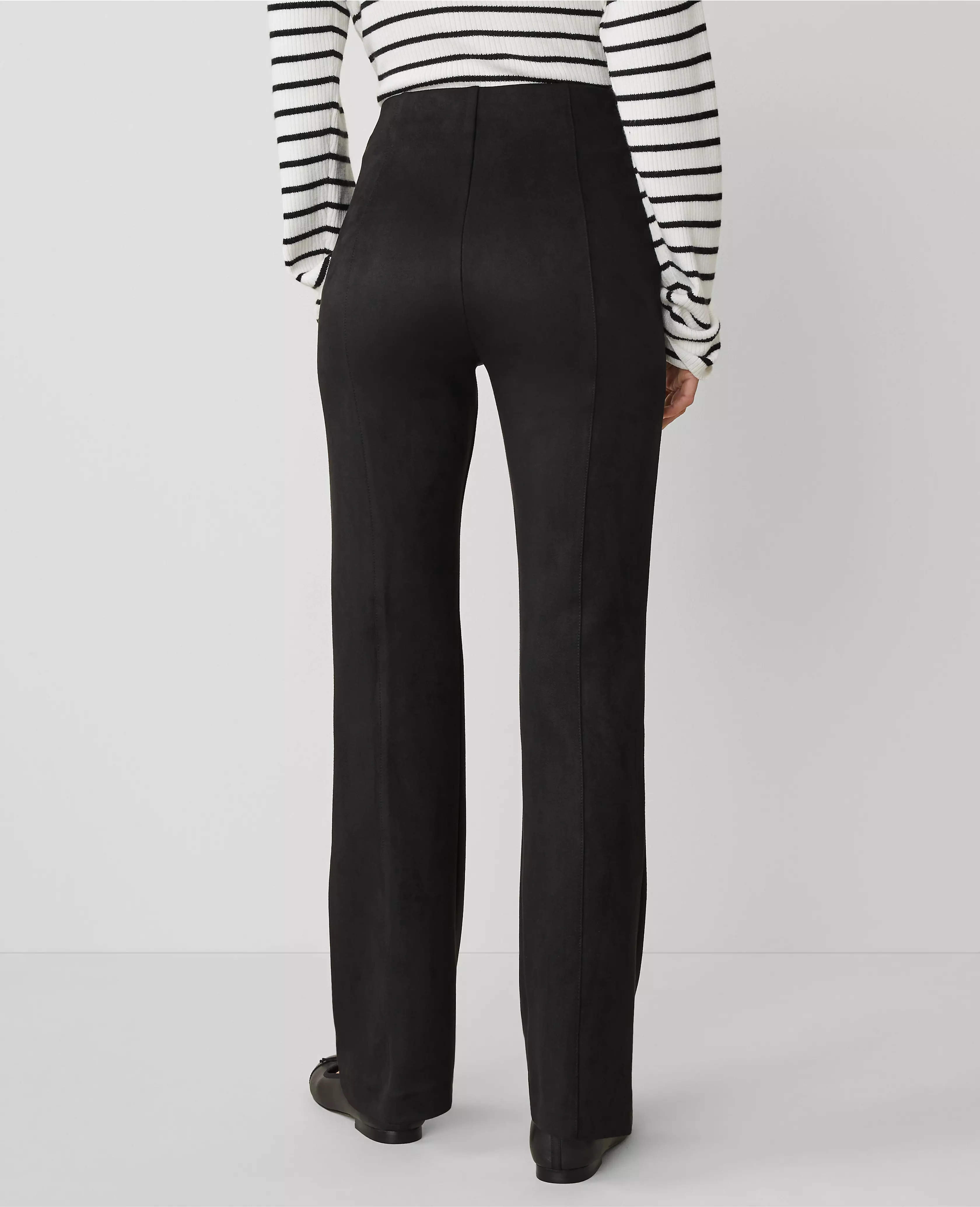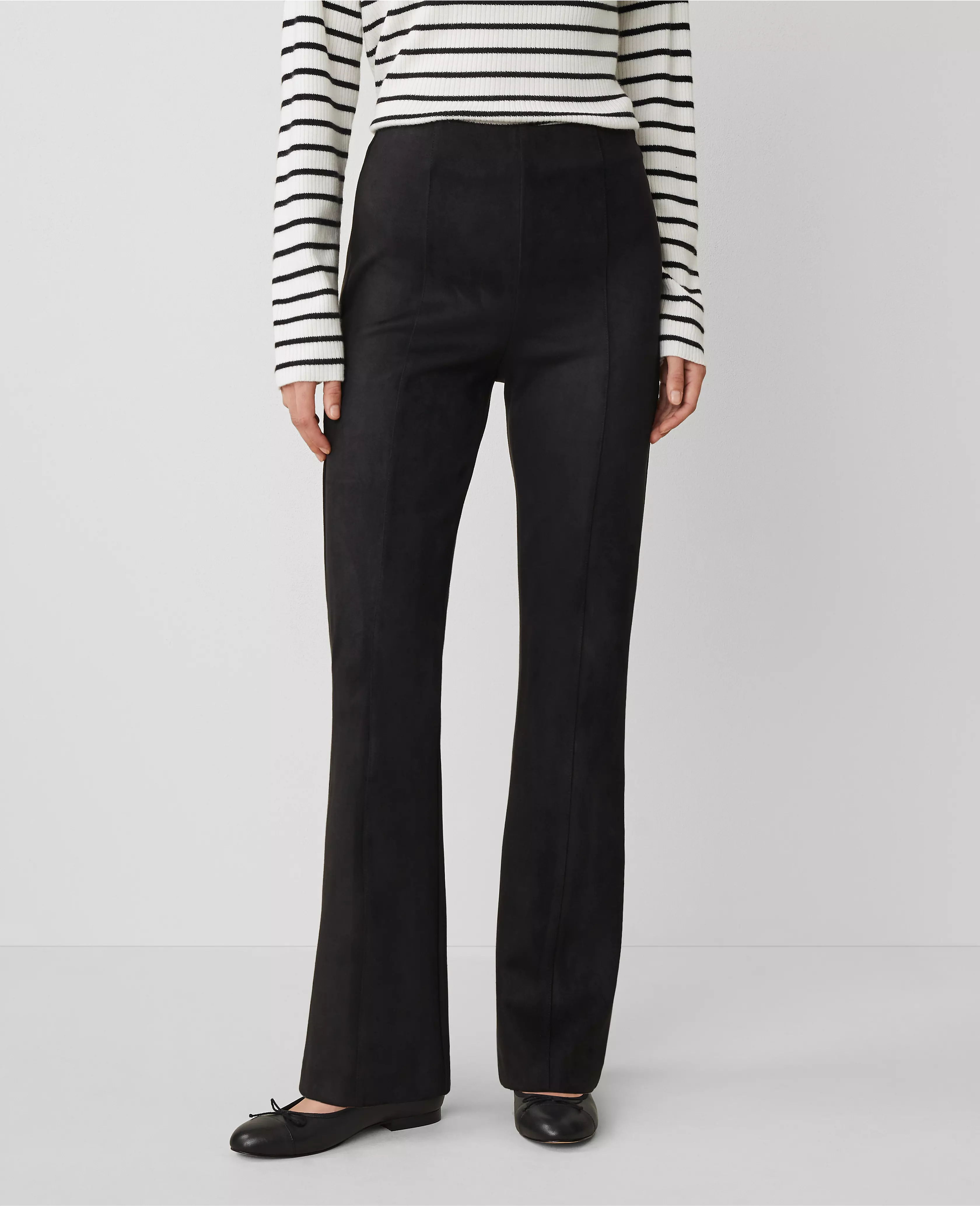 In rich faux suede, these flared pants are the perfect balance of modern styling and timeless detail. Elasticized waist. Hidden side zipper with hook-and-eye closure.
