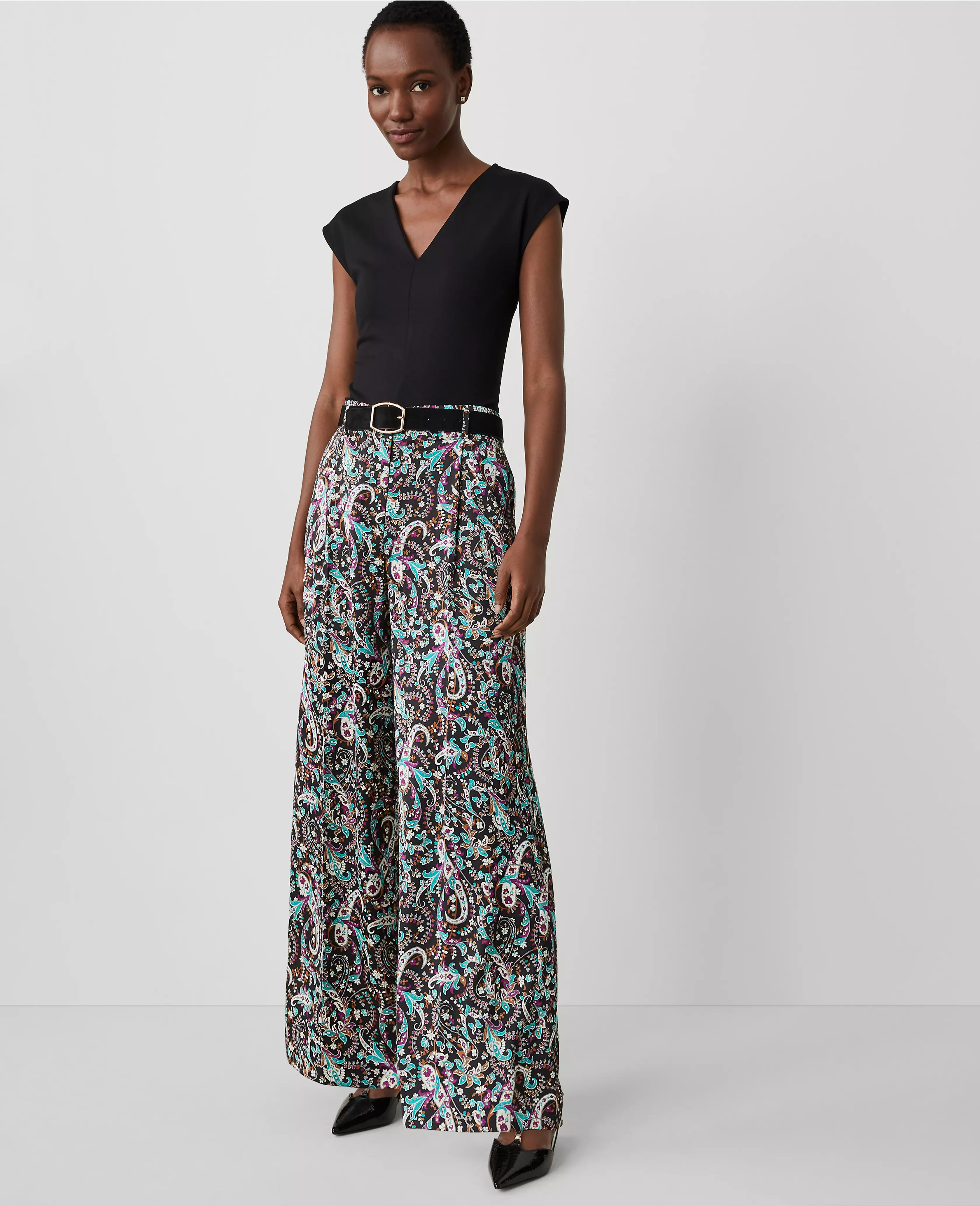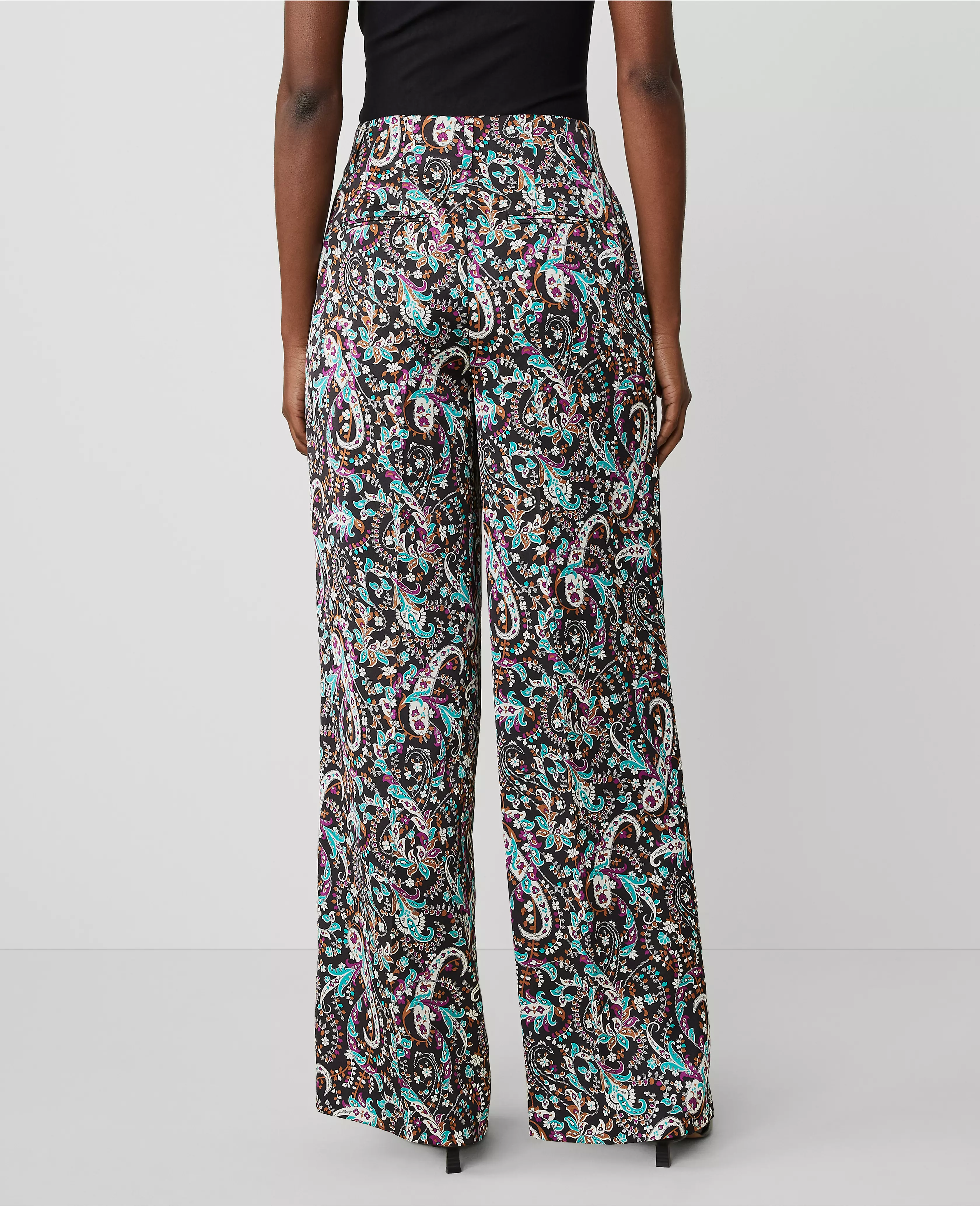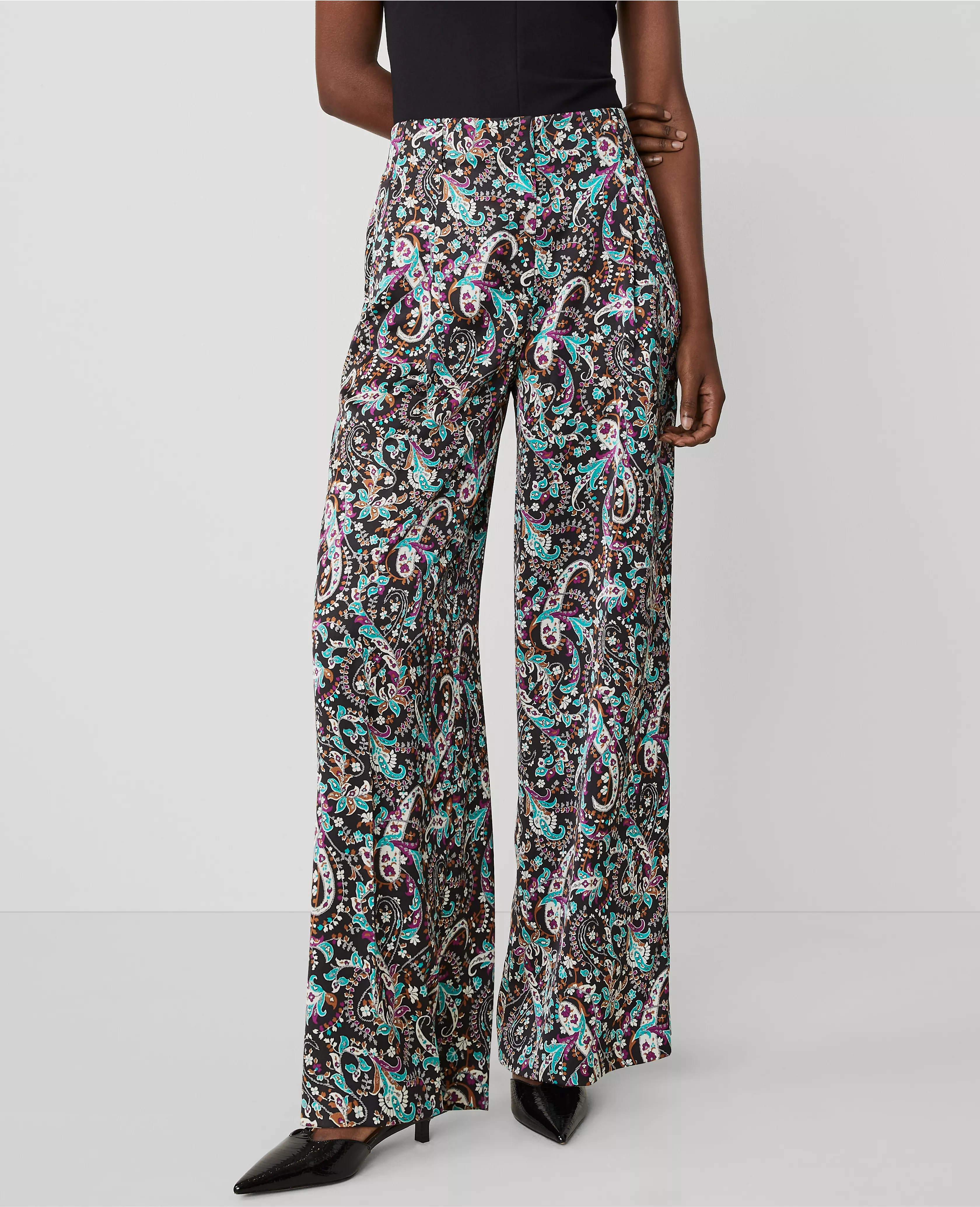 Our single-pleat paisley wide leg pant is a modern must-have with a perfect drape and high waist that endlessly flatters. Front zip with double hook-and-bar closure. Belt loops. Front off-seam pockets. Back besom pockets.