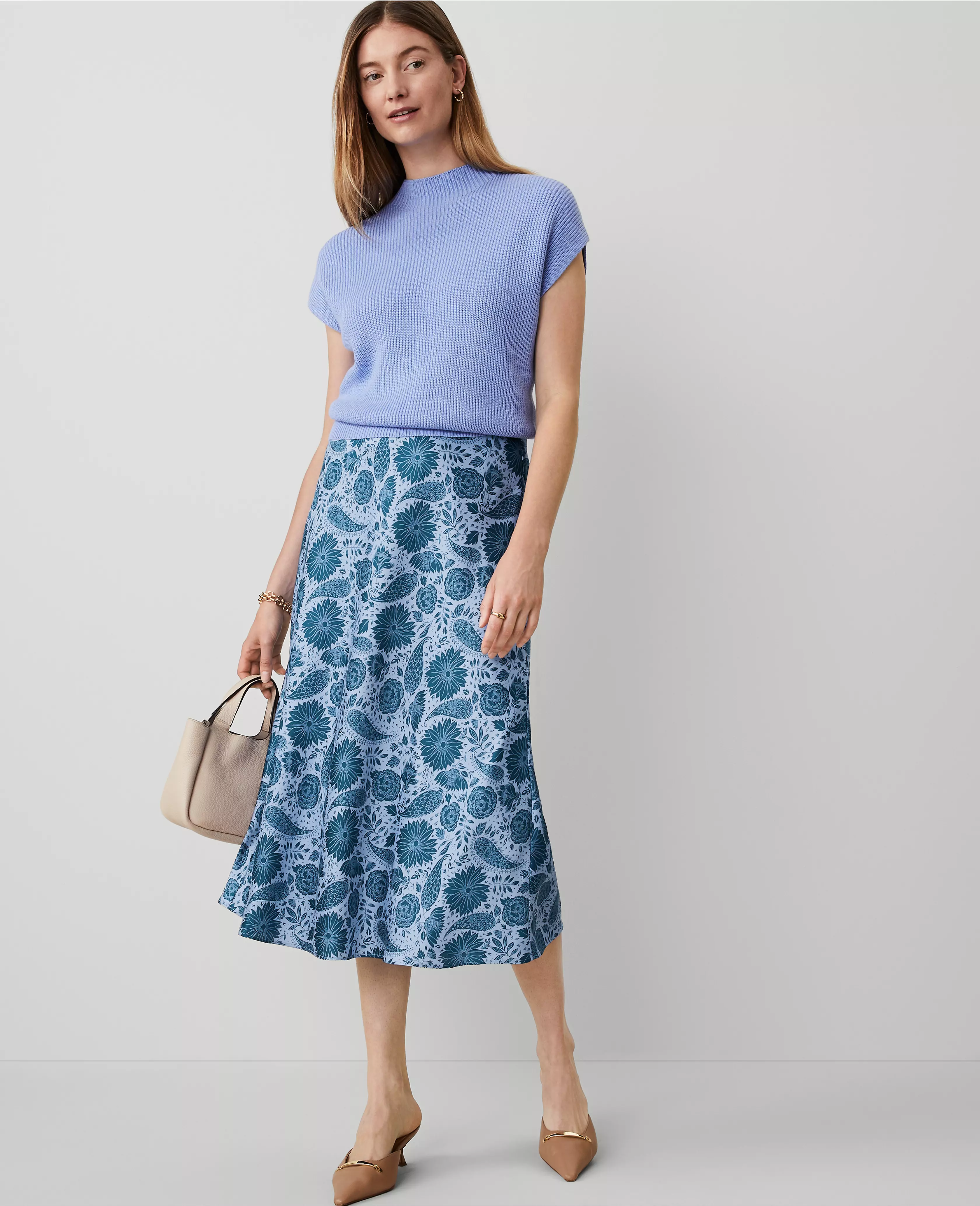 Our bias slip skirt flatters in a softly flared pull-on silhouette. Elasticized waist. Lined.