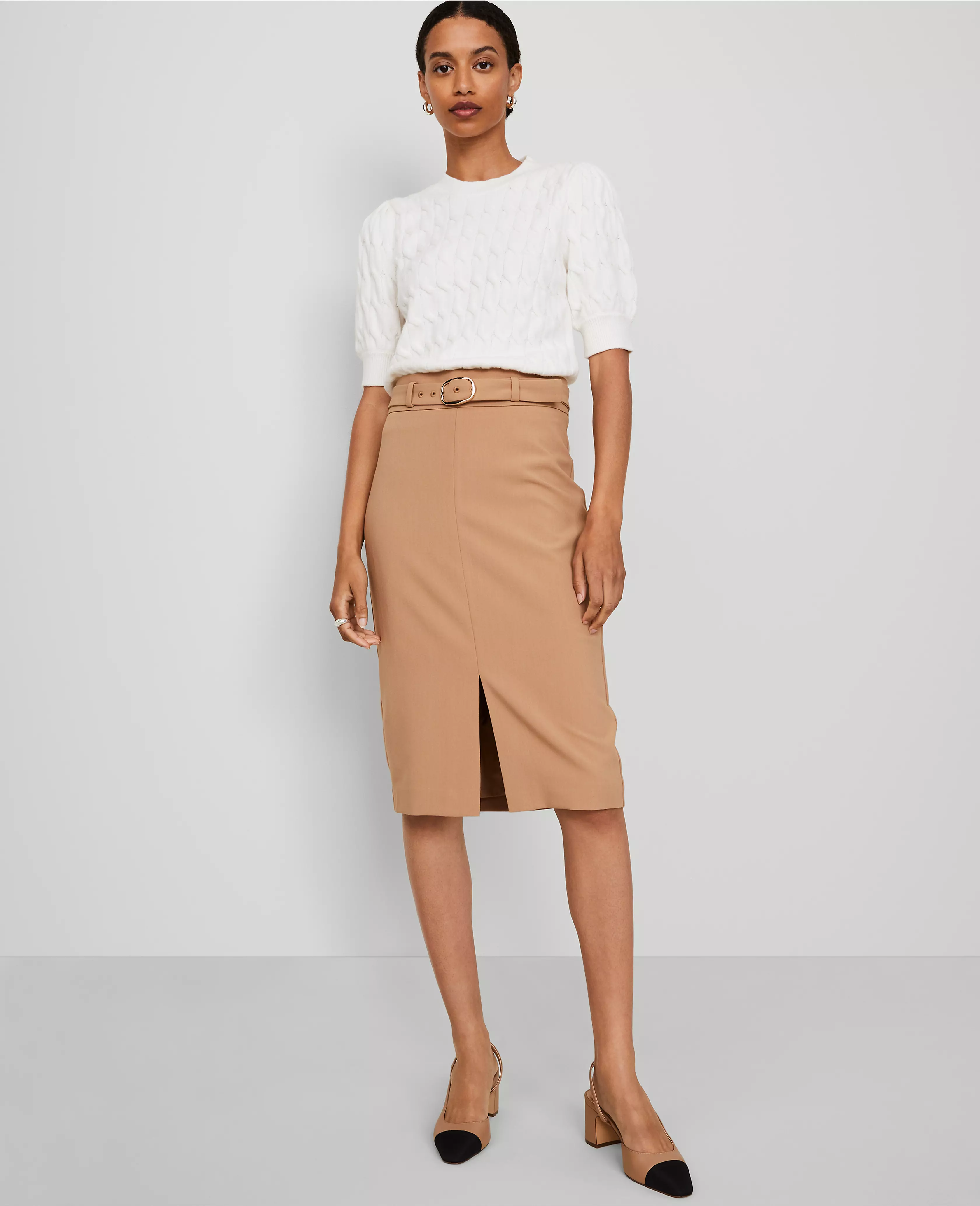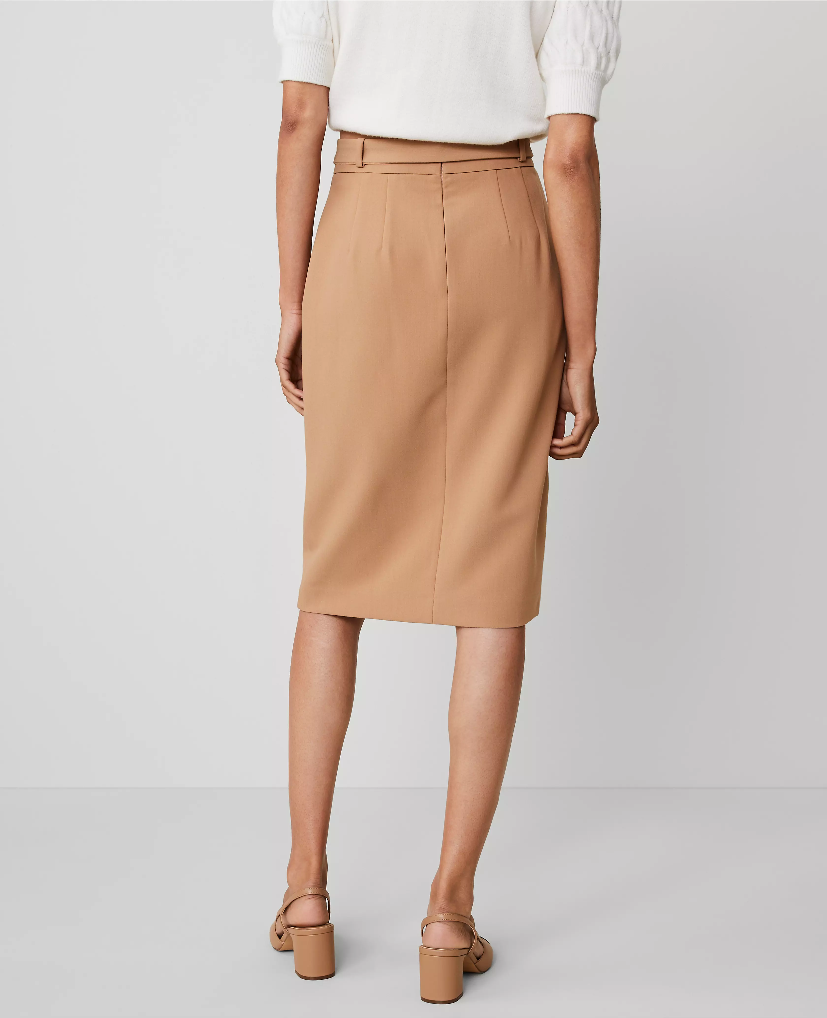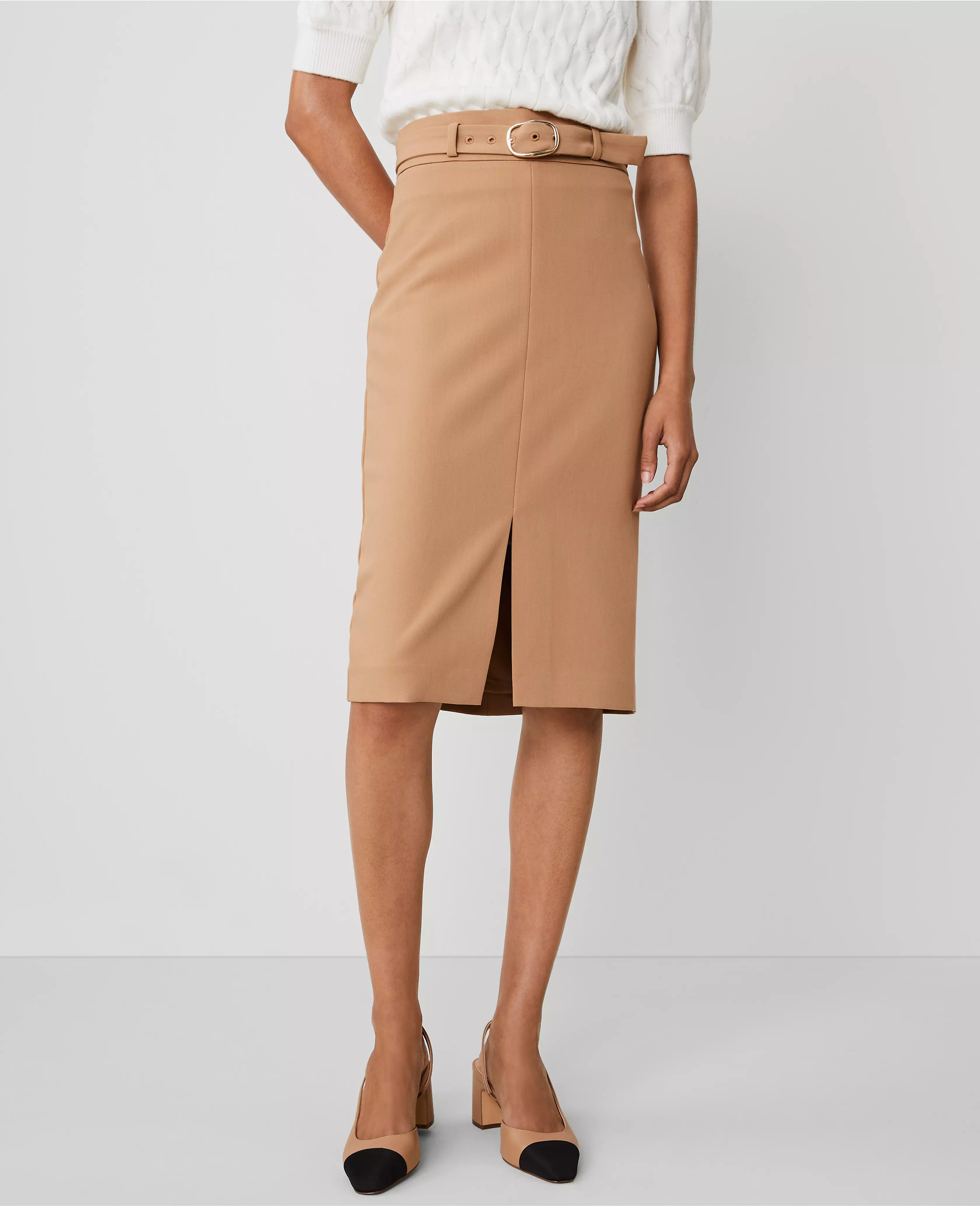 Our belted pencil skirt is cut with a sleek front slit, for extra ease of movement. Belt loops. Self tie buckle belt. Front slit. Hidden back zipper with hook-and-eye closure. Lined.