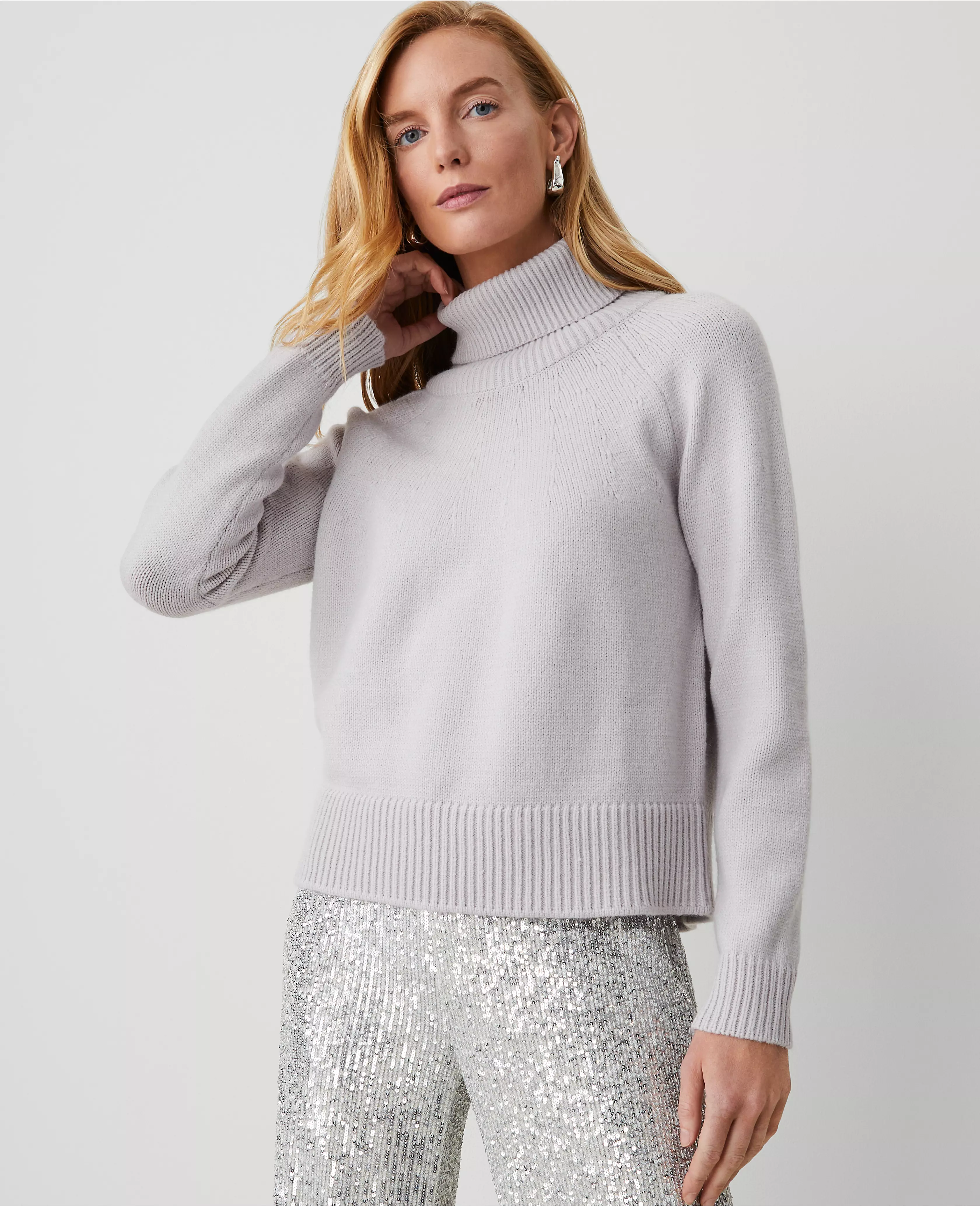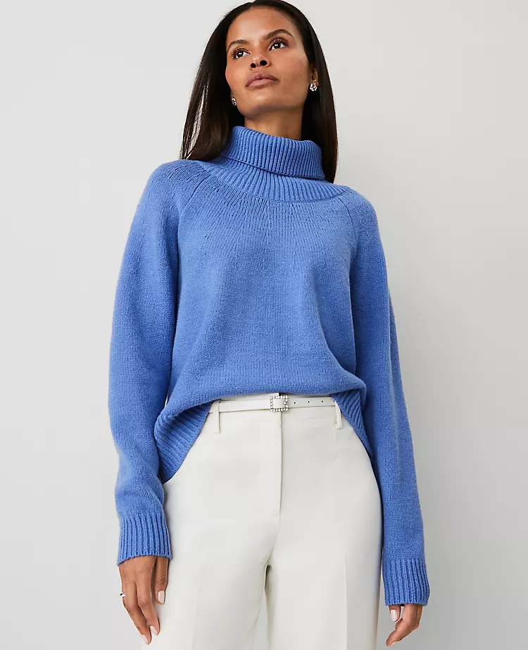 Our cozy turtleneck sweater is a covetable you'll want to live in - all season long. Turtleneck. Long raglan sleeves. Ribbed neckline, cuffs and hem.