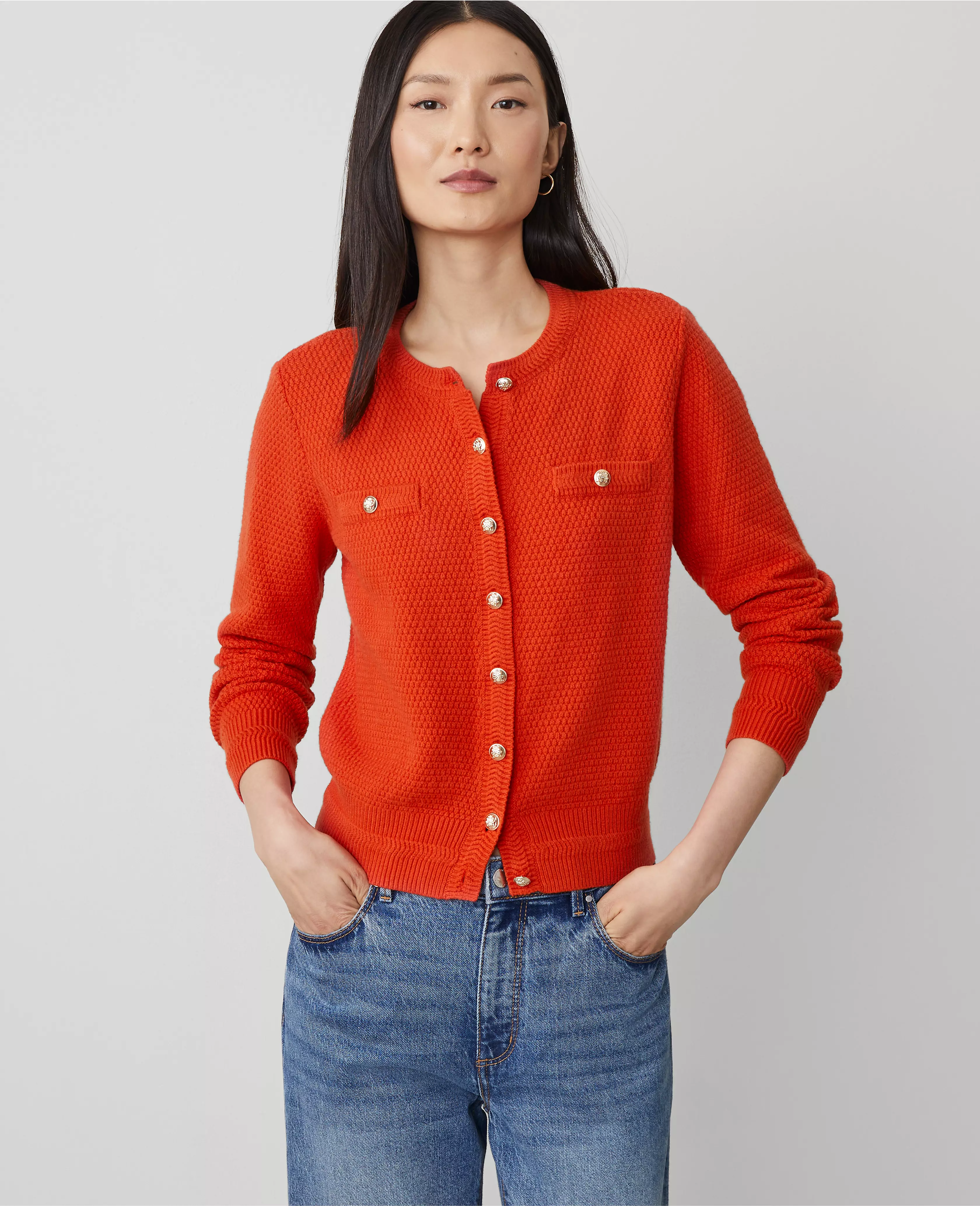In a textured tuck stitch, our button-detailed cardigan is ready for whatever the day brings. Crew neck. Long sleeves. Button front. Chest button welt pockets.