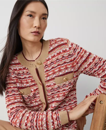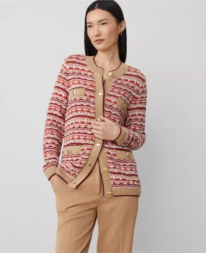 Texturally refined, this tweedy cardigan is polished with shiny button detail. Crew neck. Long sleeves. Button front. Chest and waist button welt pockets.