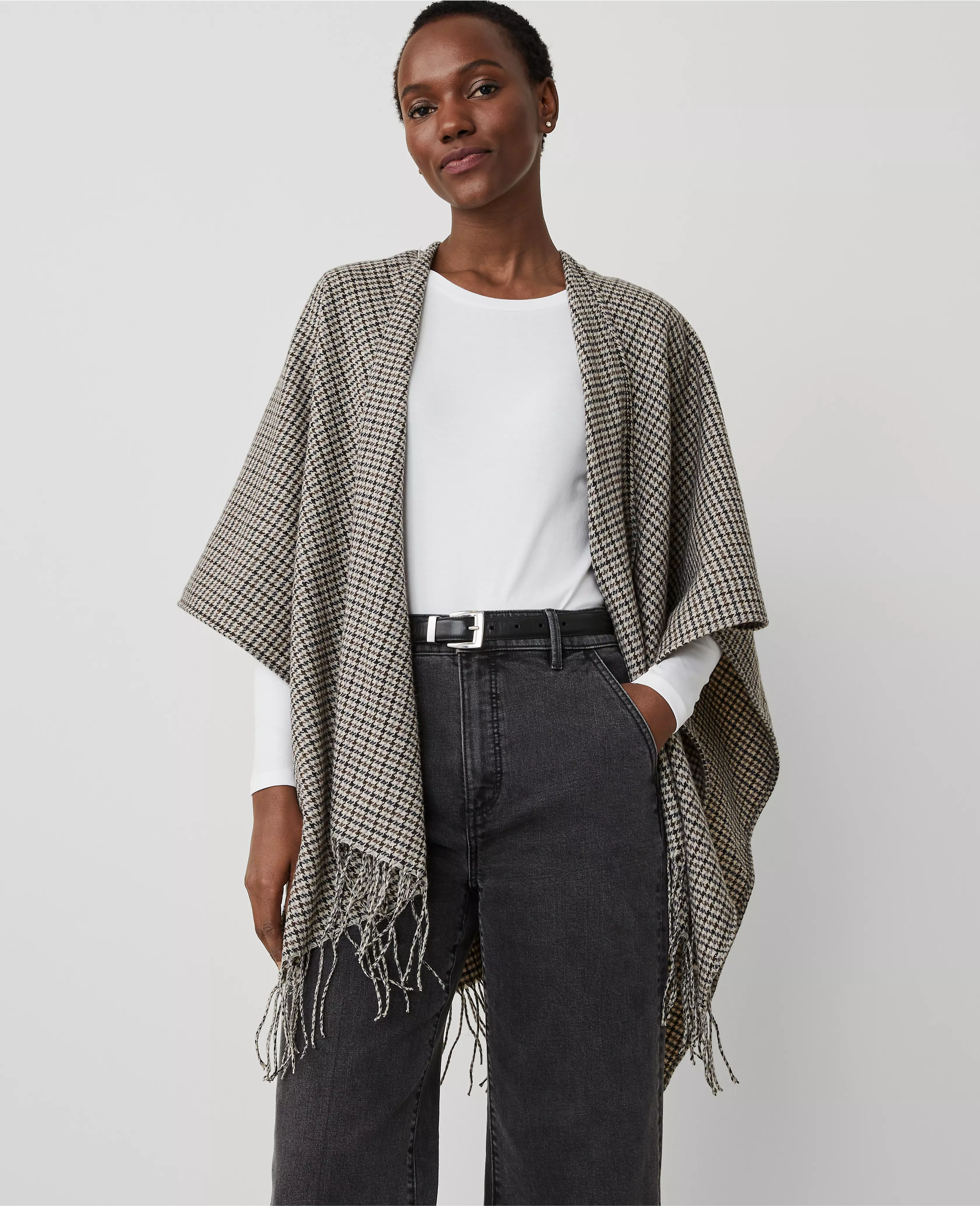 With effortless drape and flow, our plaid open poncho is a flattering layer that's always at ease. Light fringe at ends. Open front. 3/4 sleeves. 45"W x 58"L; 4" tassels.