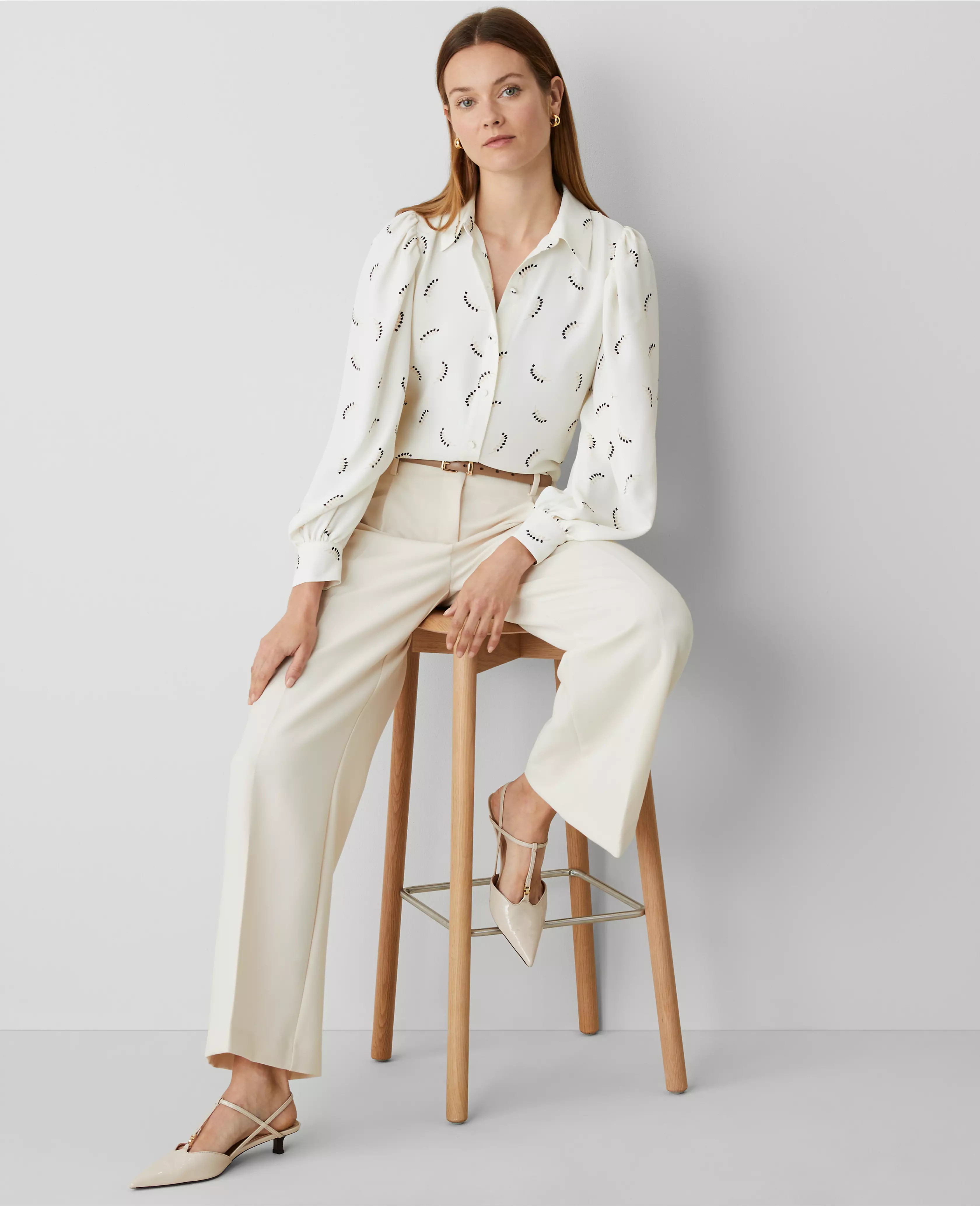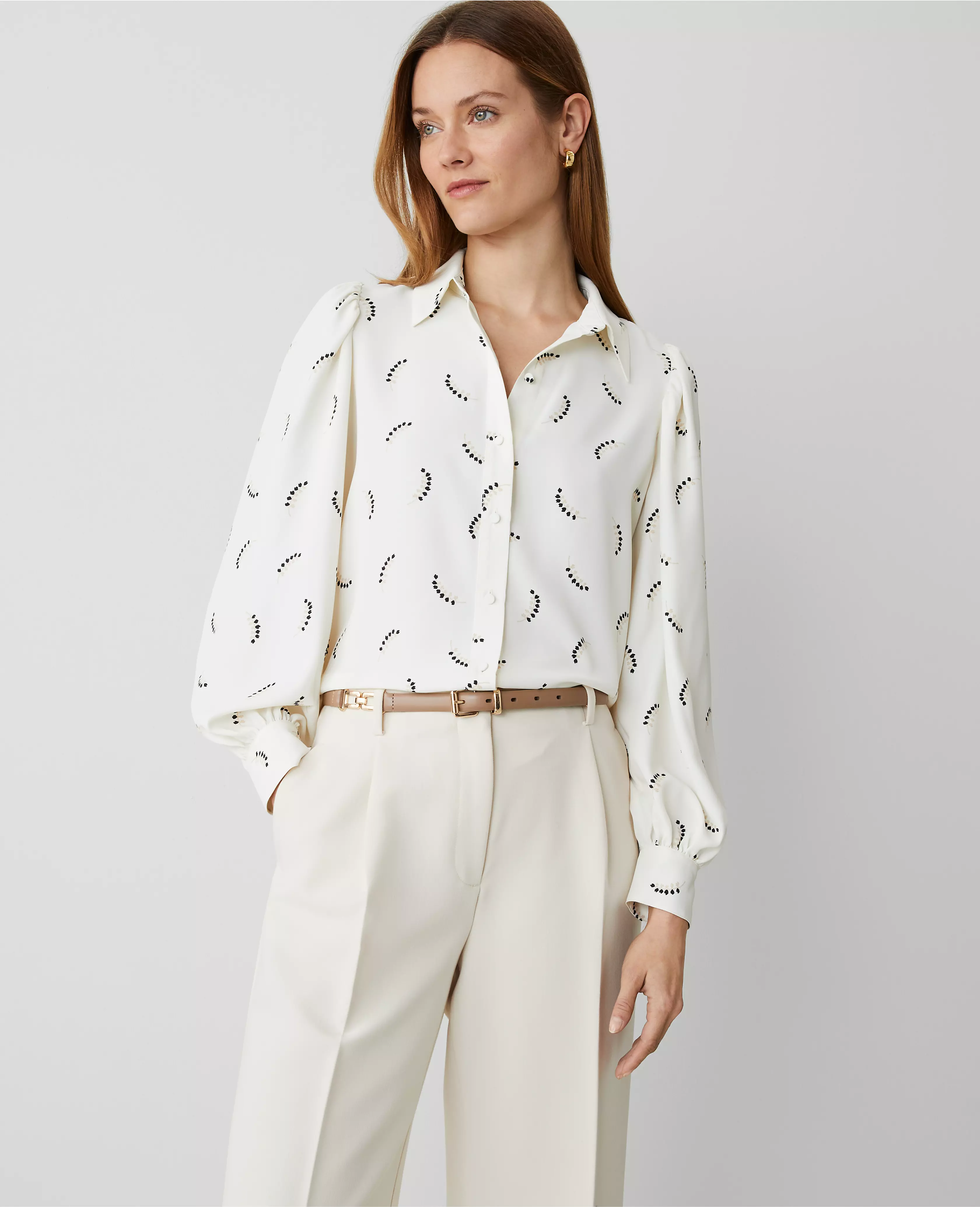 Puff sleeves play up the volume (and style factor) of this have-to-have collared button front shirt. Point collar. Long sleeves with shirred sleeve caps and button cuffs. Button front.