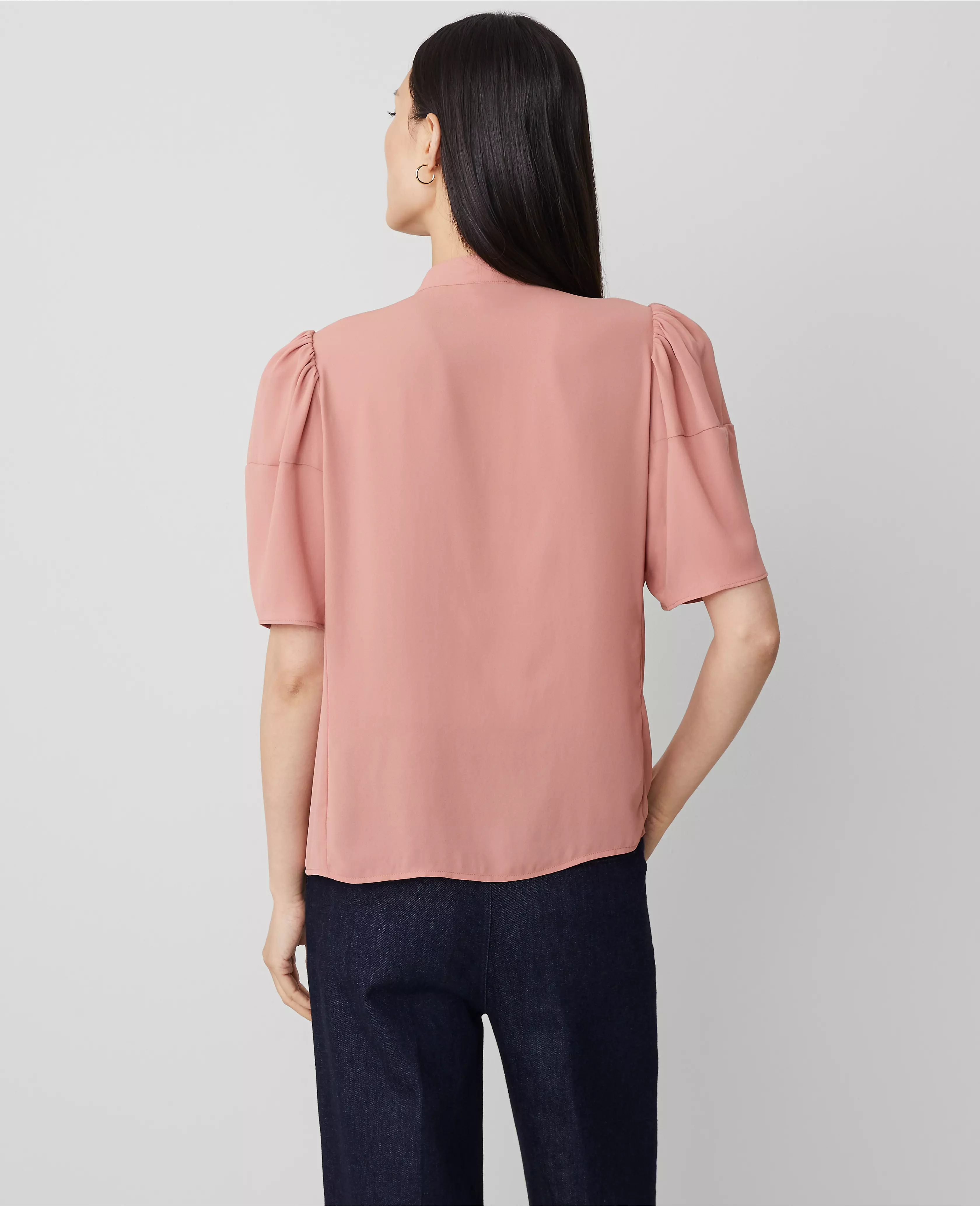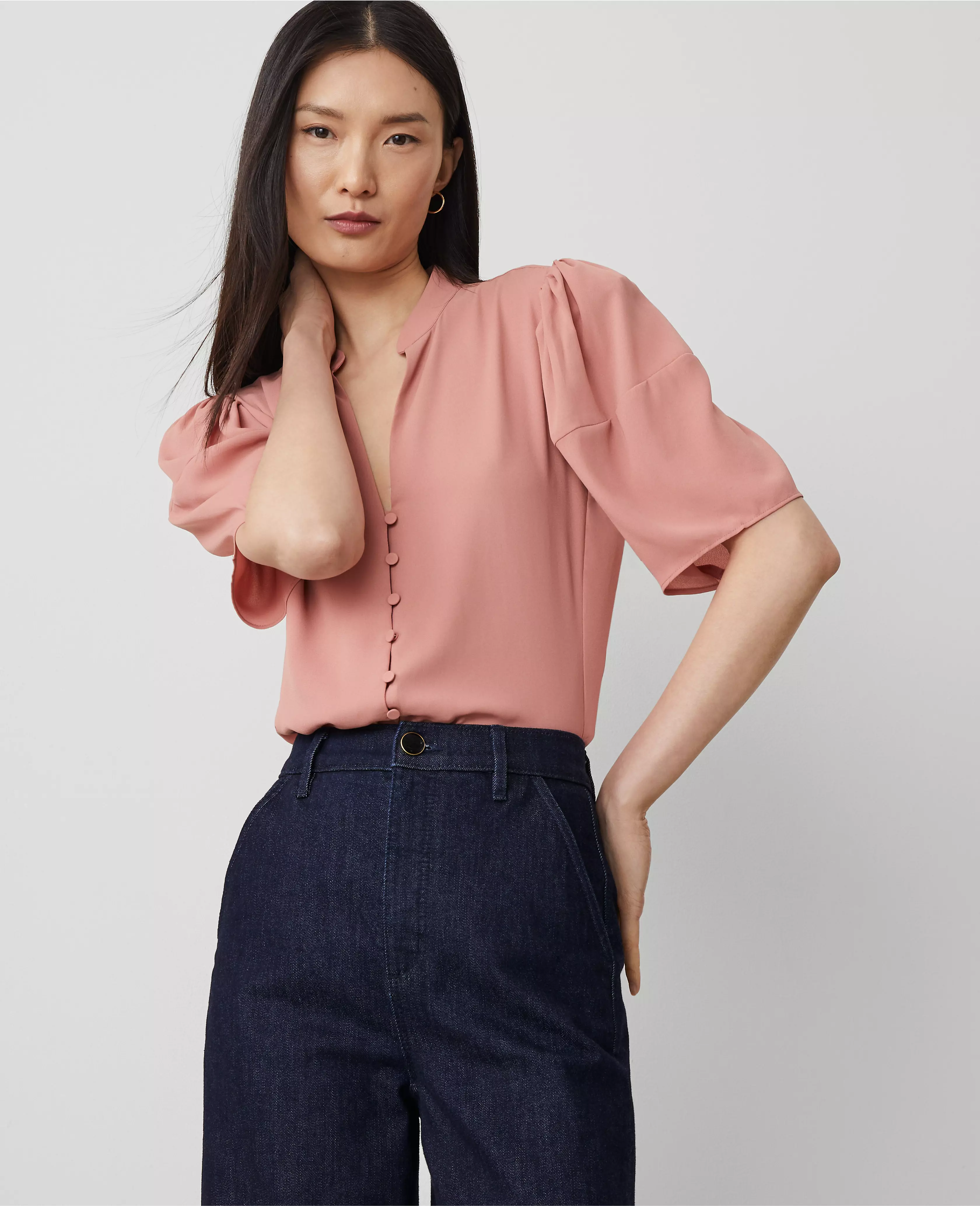 Light up the room in this softly shirred style, made with airy lantern sleeves for modern proportion play. Split neck with stand collar. Short sleeves with shirred sleeve caps. Button front. Lined front.