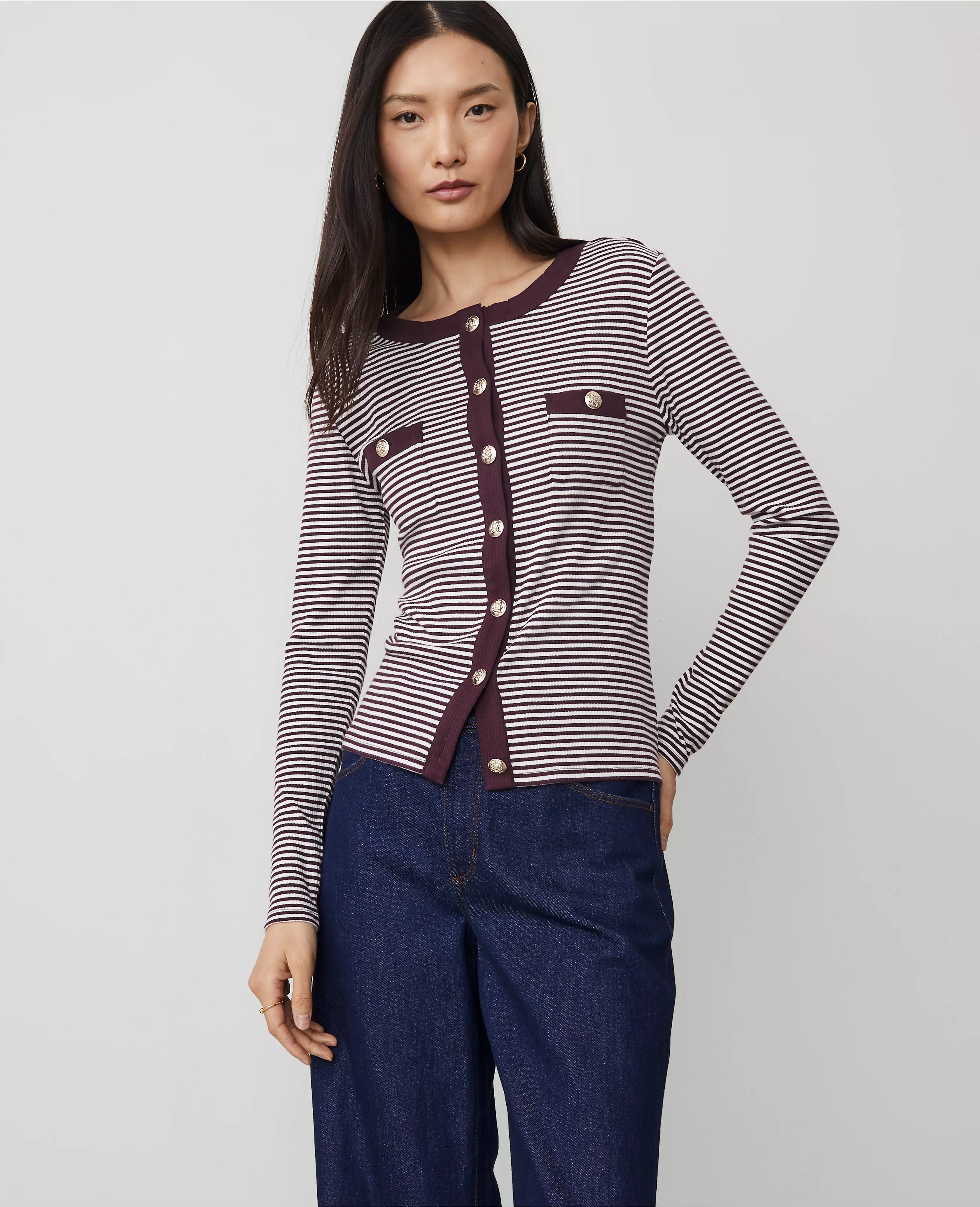 Polished from A.M. to P.M., our knit jacket shines with smart button detail. Crew neck. Long sleeves. Button front. Chest patch pockets with button closure.