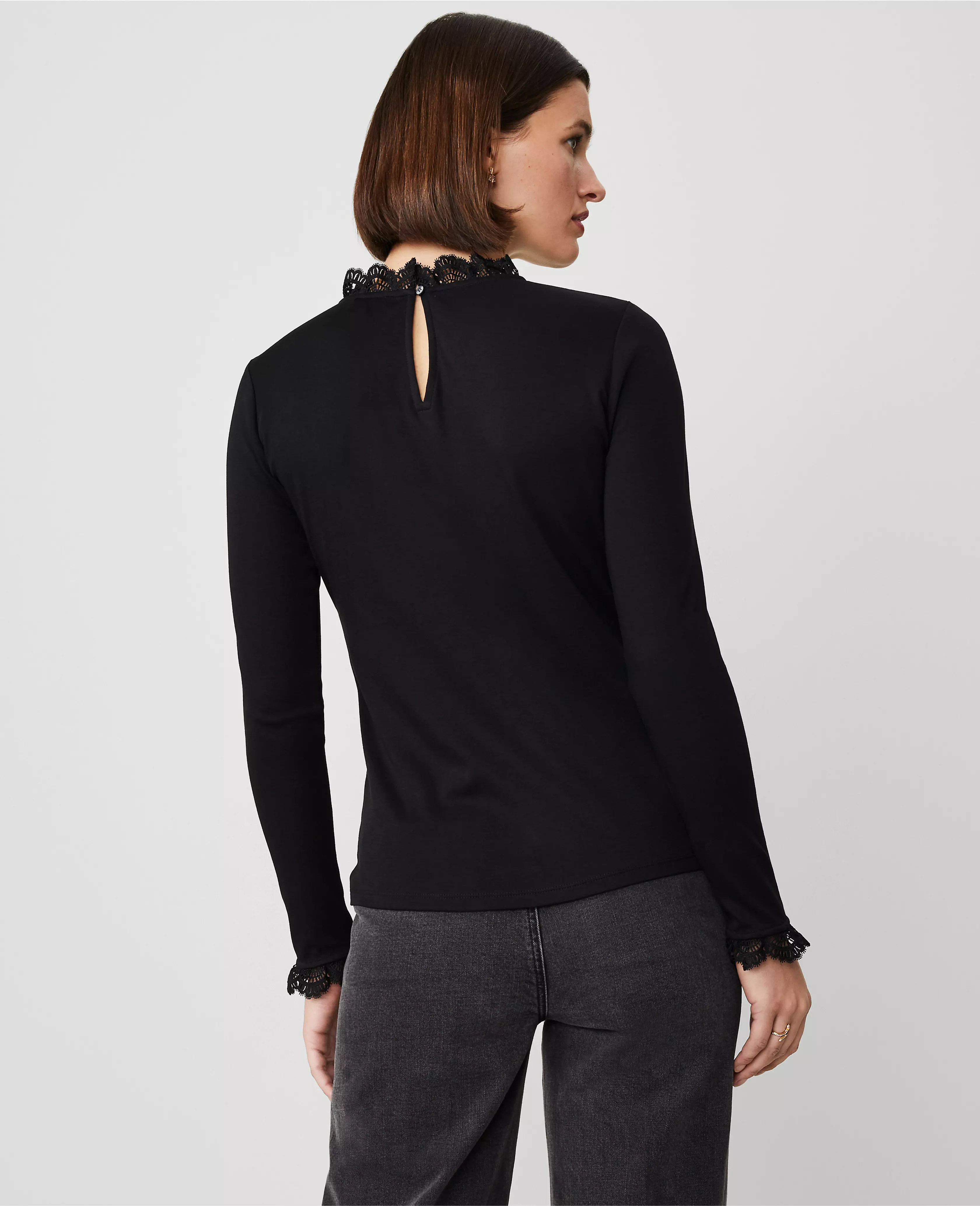 Artfully ruffled at the neck and cuffs, our refined knit top is as romantic as it is versatile. Crew neck. Long sleeves. Back slit with hook-and-eye closure.