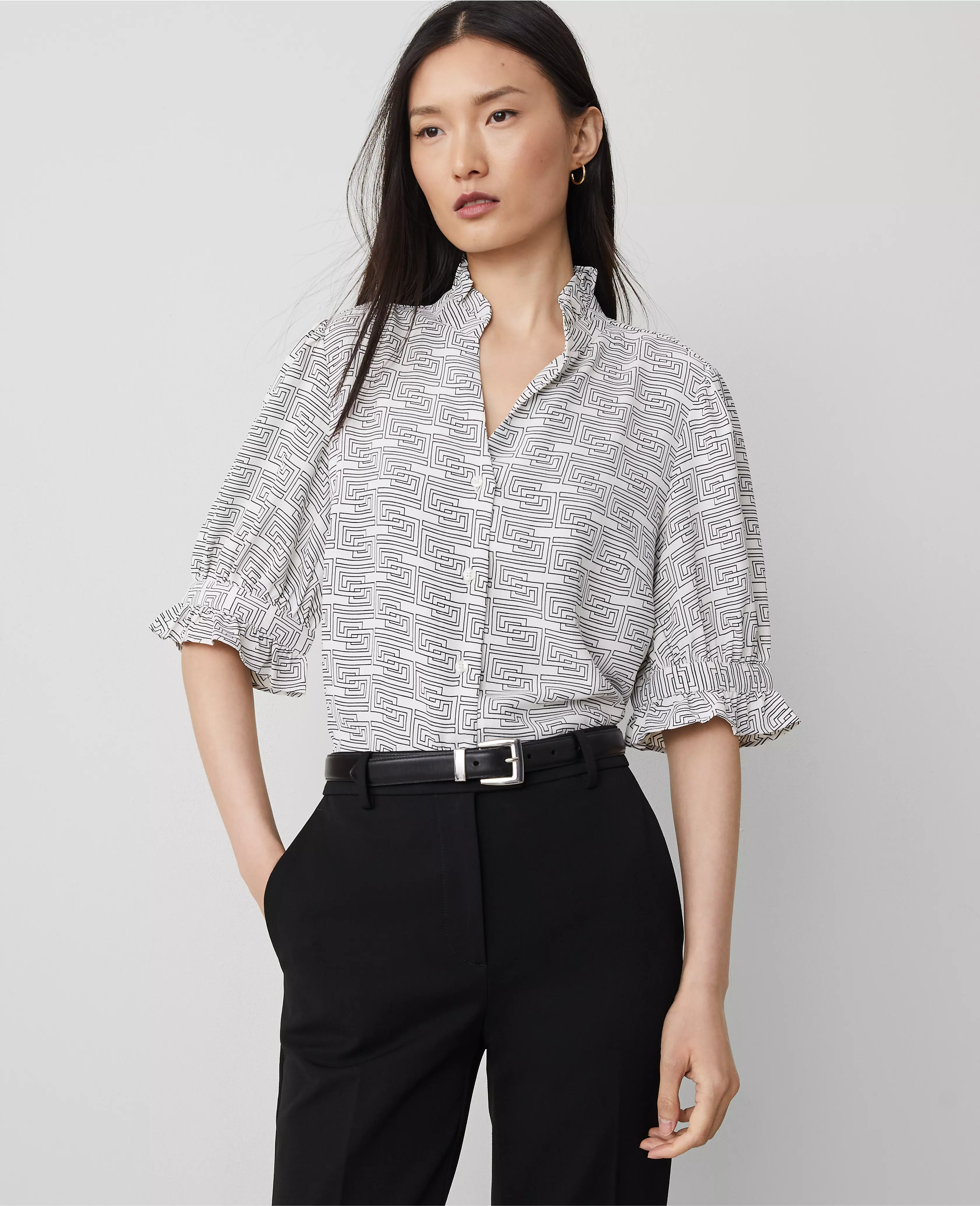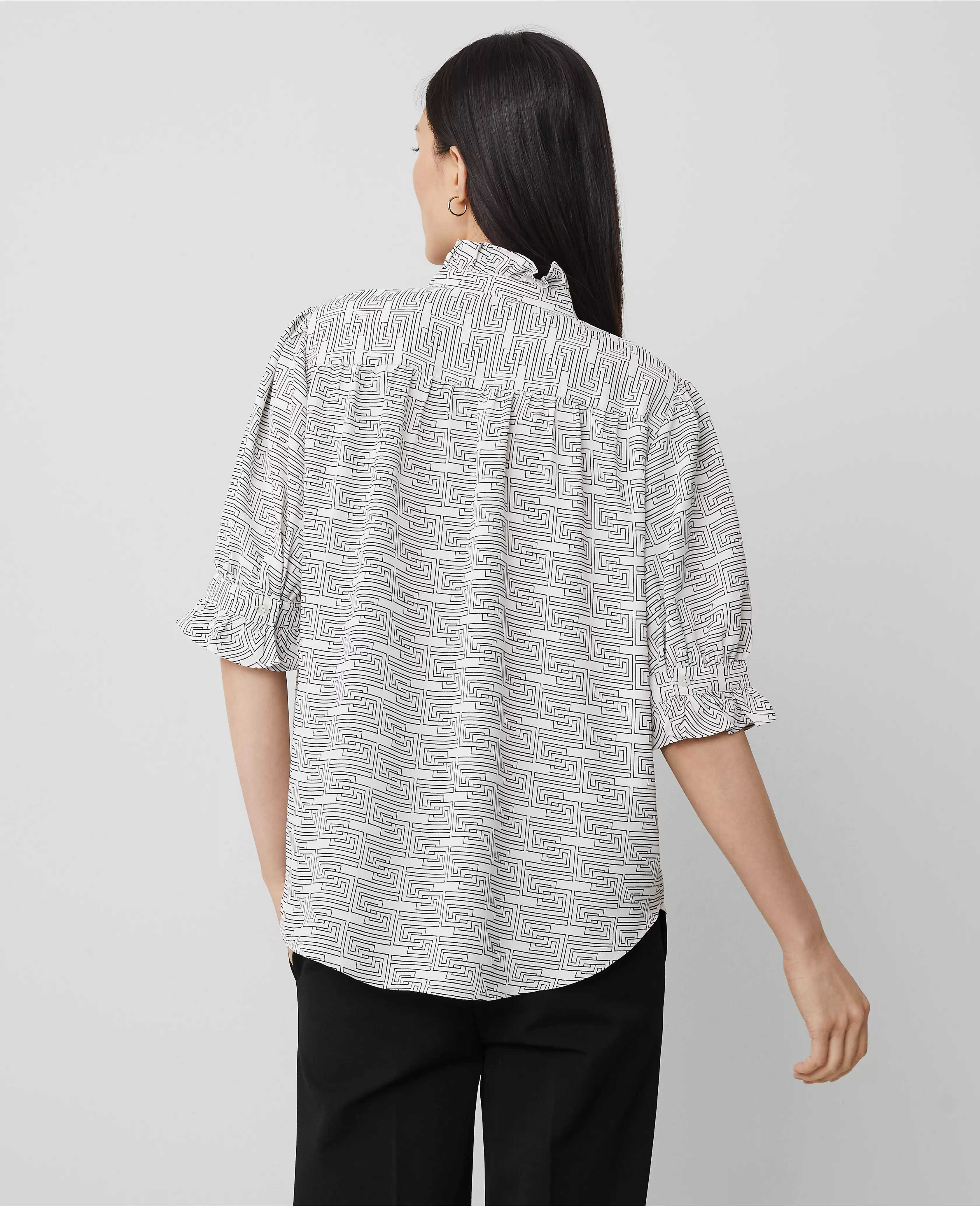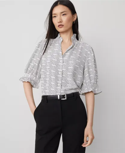 Ruffles add romantic texture to this button down top, done in season-perfect hues. Stand ruffle collar. Short sleeves with shirred sleeve caps and button cuffs. Button front. Shirred back yoke. Shirttail hem.