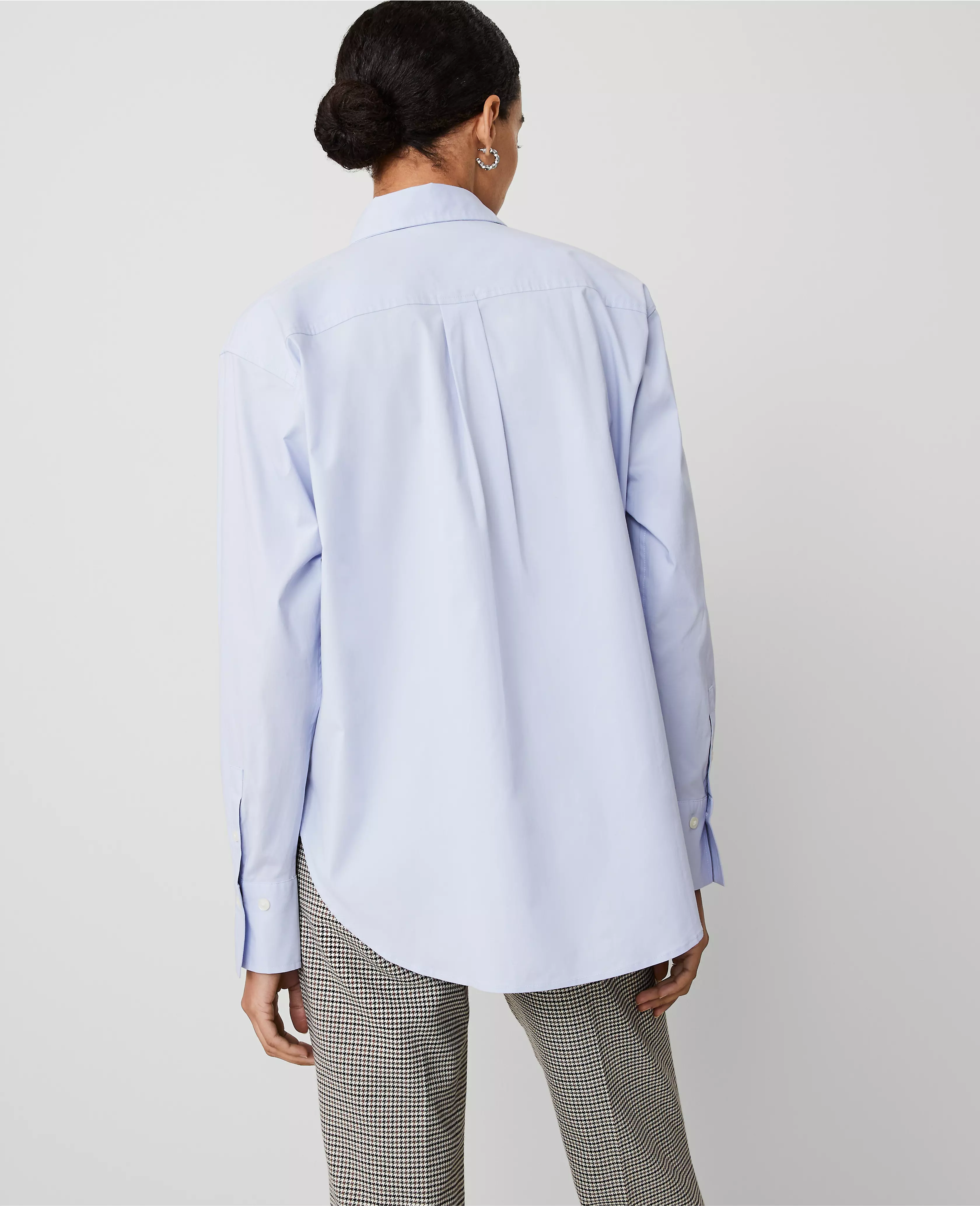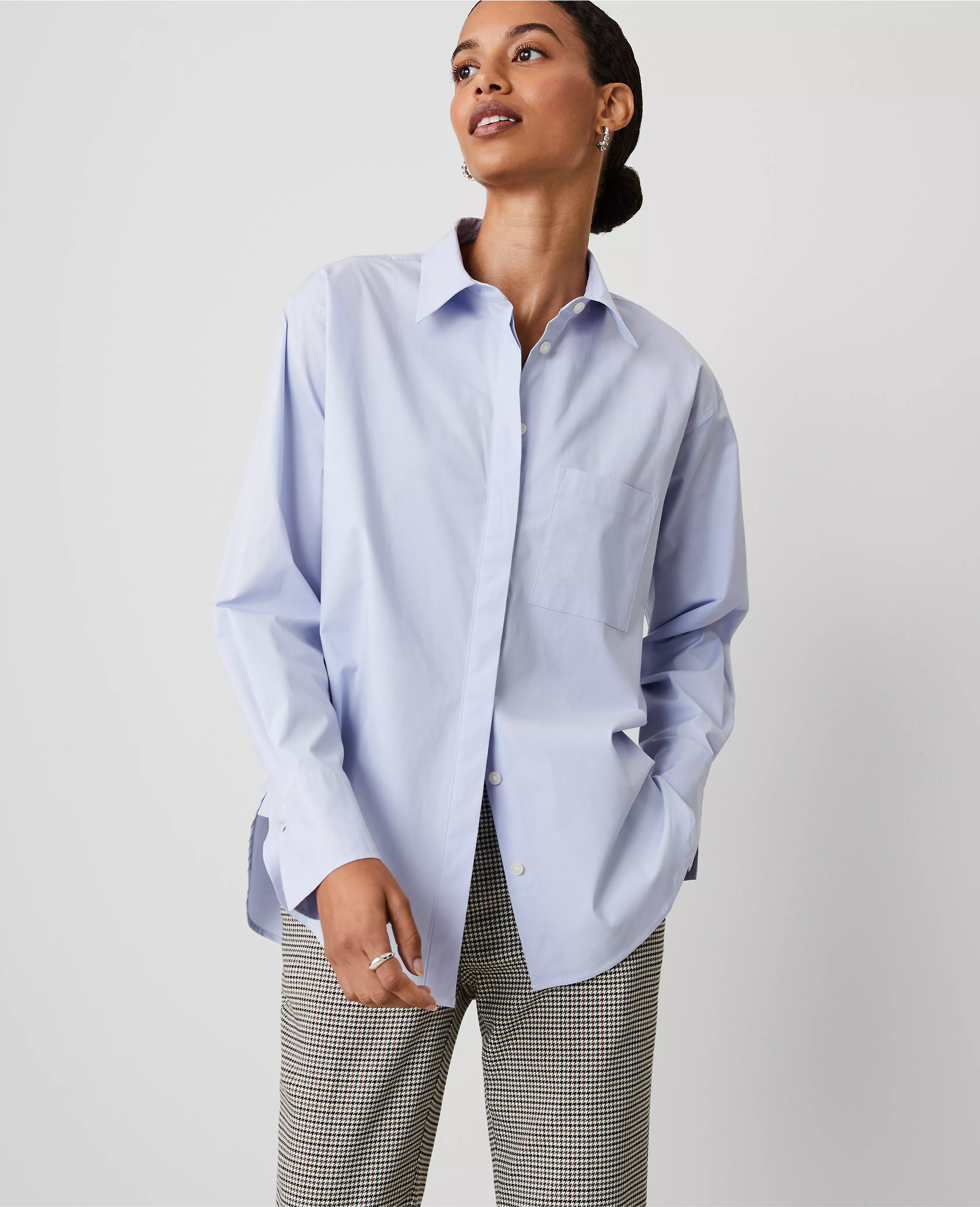 Fresh and flattering, our oversized shirt moves with ease. Point collar. Long sleeves with button cuffs. Hidden button front placket. Forward shoulder seams. Chest patch placket. Back yoke with box pleat. Shirttail hem.
