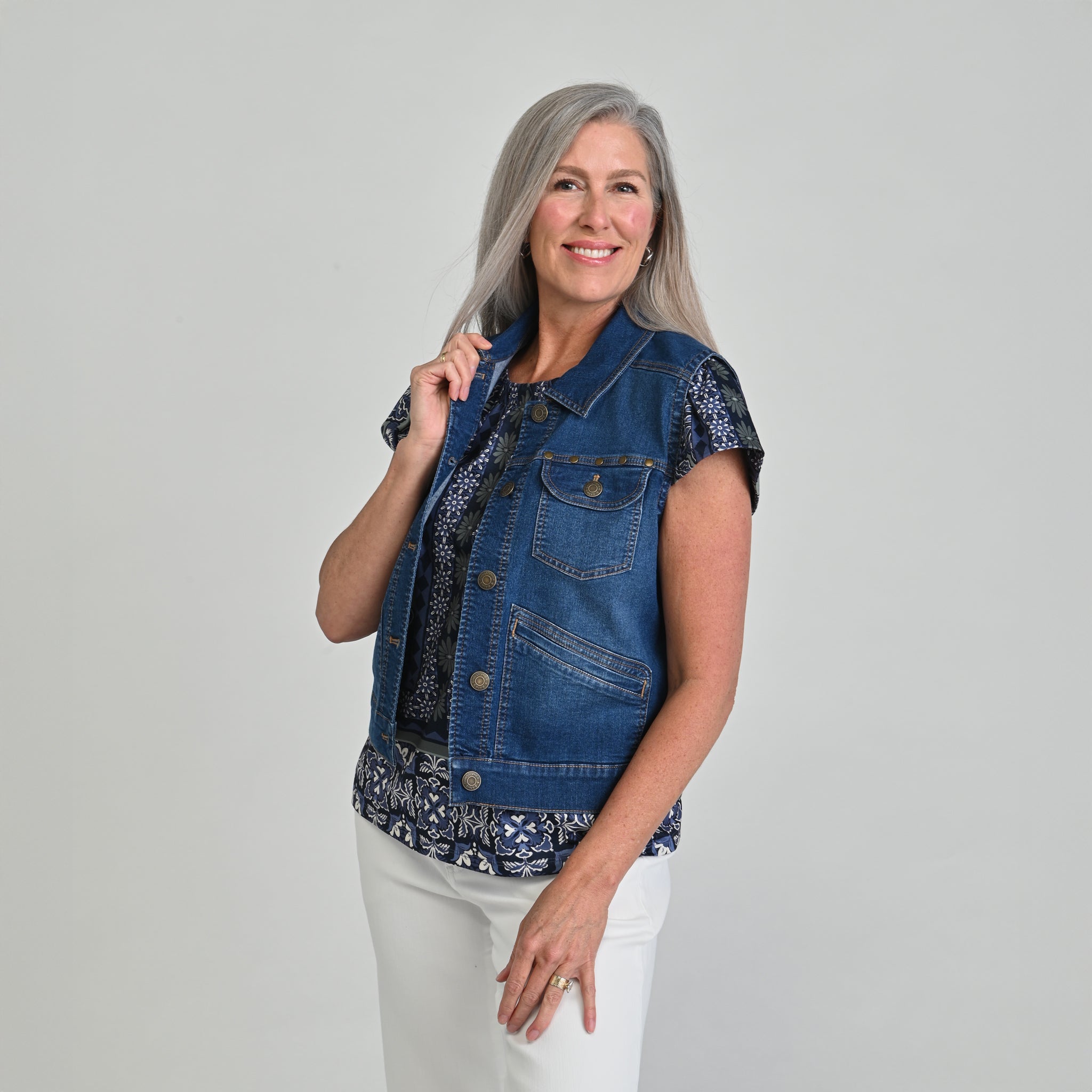 Elevate your outfit with our Denim Vest, featuring bold dome stud detailing and sleek front slant pockets that blend style with function. Designed as the ultimate layering piece, it effortlessly pulls your look together with a cool, confident finish.