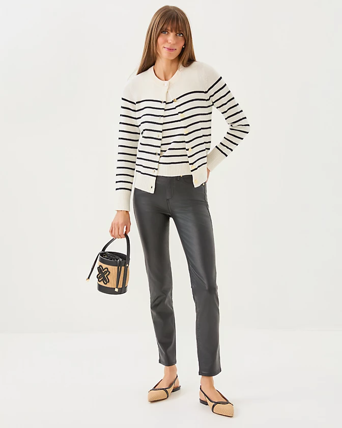 Striped, crew neck cardigan with buttons and a matching crew neck shell.