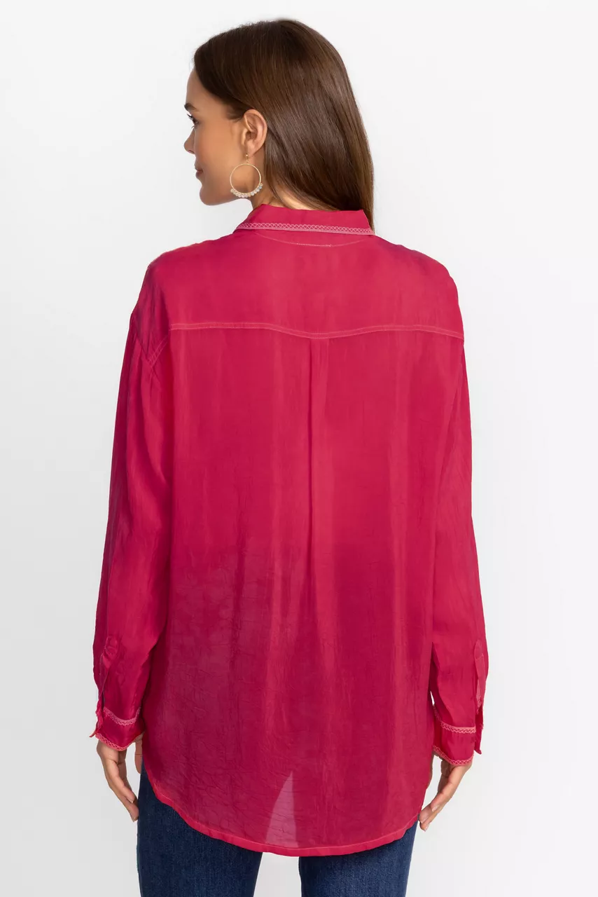 Offering a fresh take on classic shirting, the Gillian Blouse is crafted from a lightweight fabric. Featuring a traditional collared button-front and side slits, this slip-lined shirt is embroidered with an intricate pattern at the yoke with a western flair. Pair with boot cut jeans and the Farfelle Cowboy Boots for a perfectly coordinated ensemble.