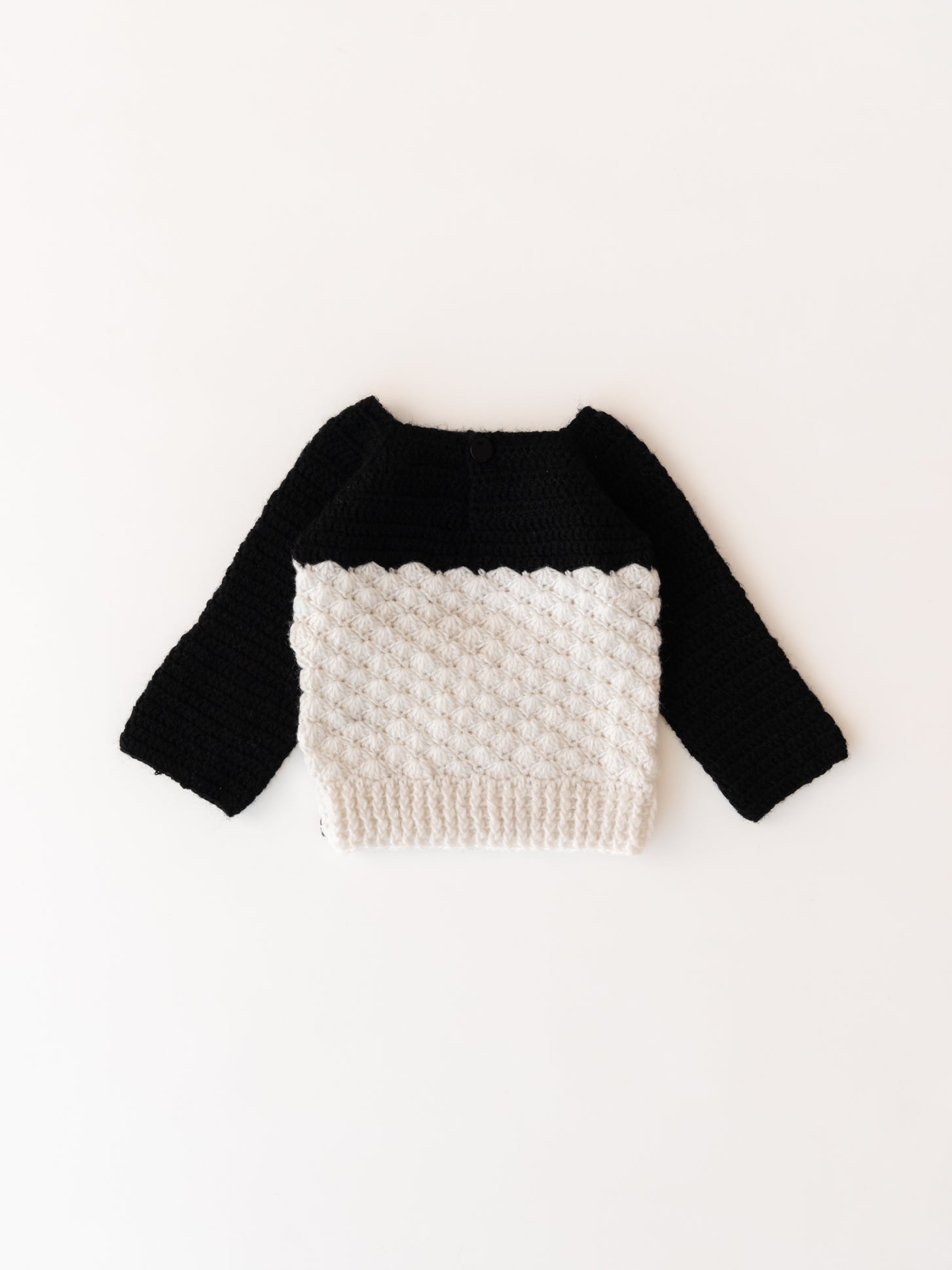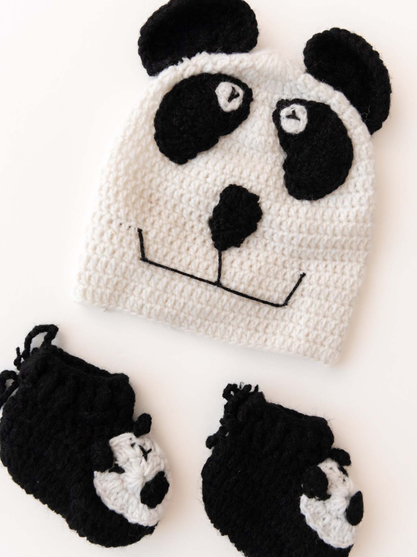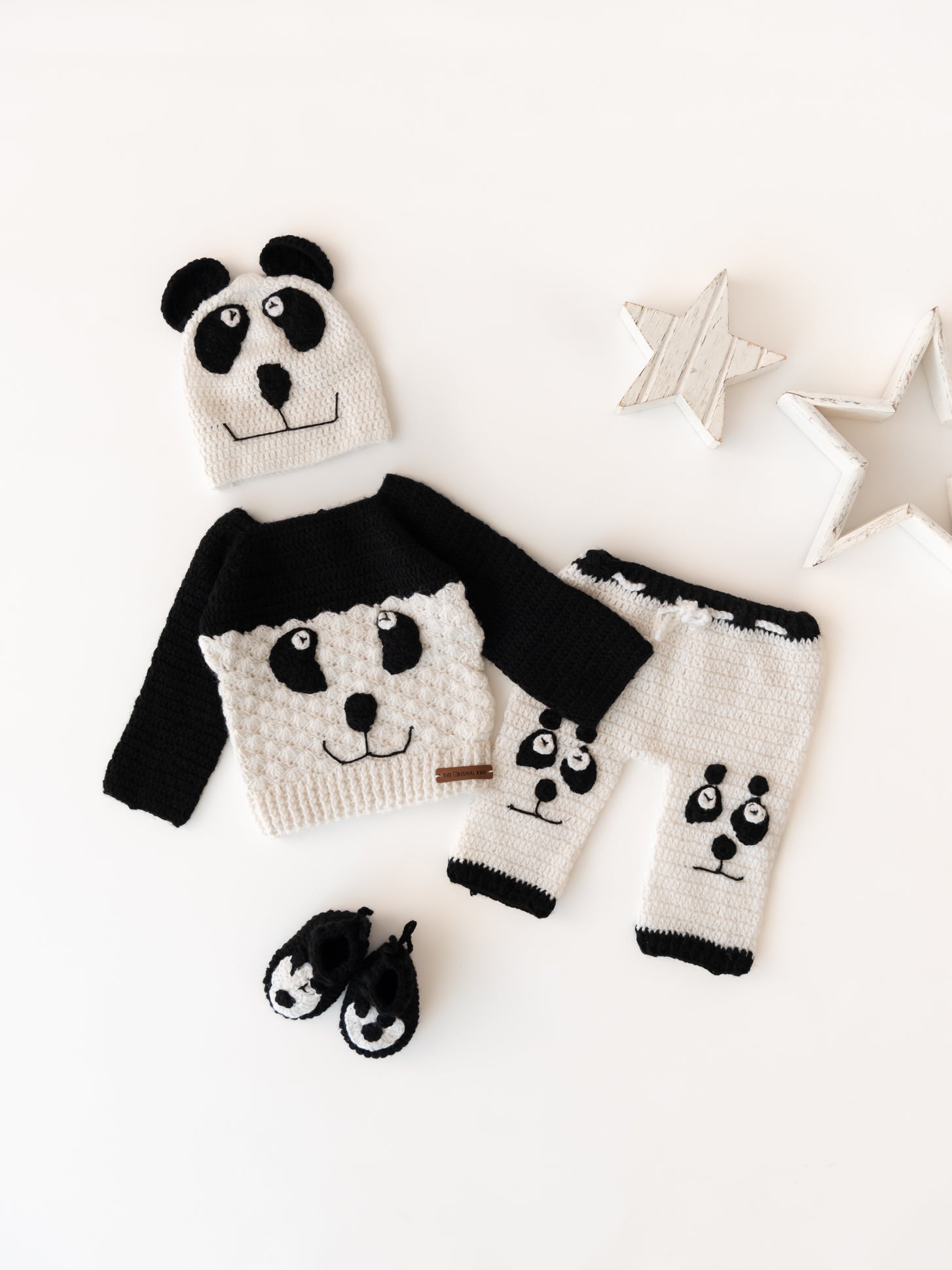 White & Black, Handmade Panda Face Sweater set with Pyjama/Pants & Cap With Booties, round neck, long sleeves, button closure, ribbed hem.
