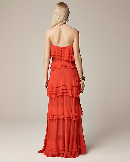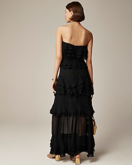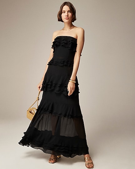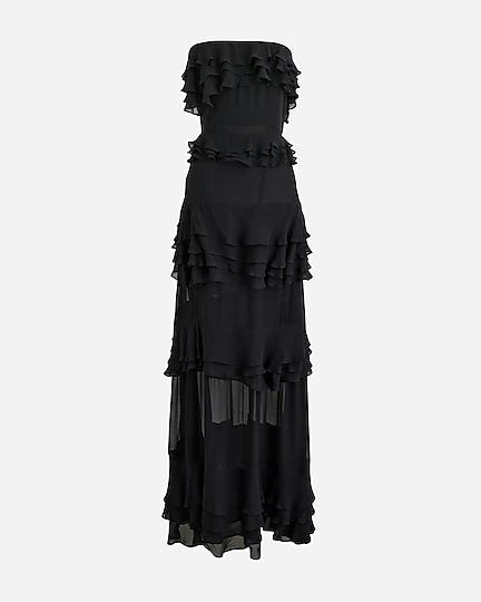 A dreamy maxi dress with a strapless silhouette and cascading ruffle details down the front. Plus, it's crafted from a floaty chiffon fabric that's lightweight and drapey.