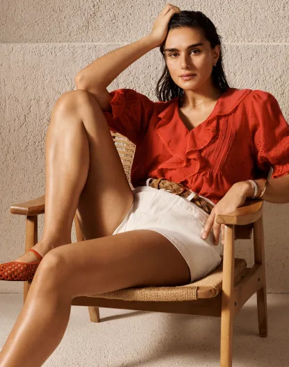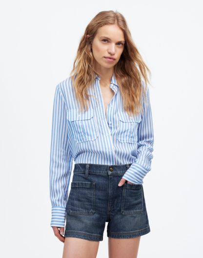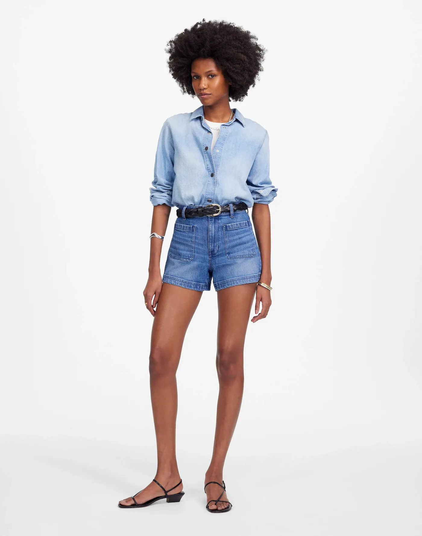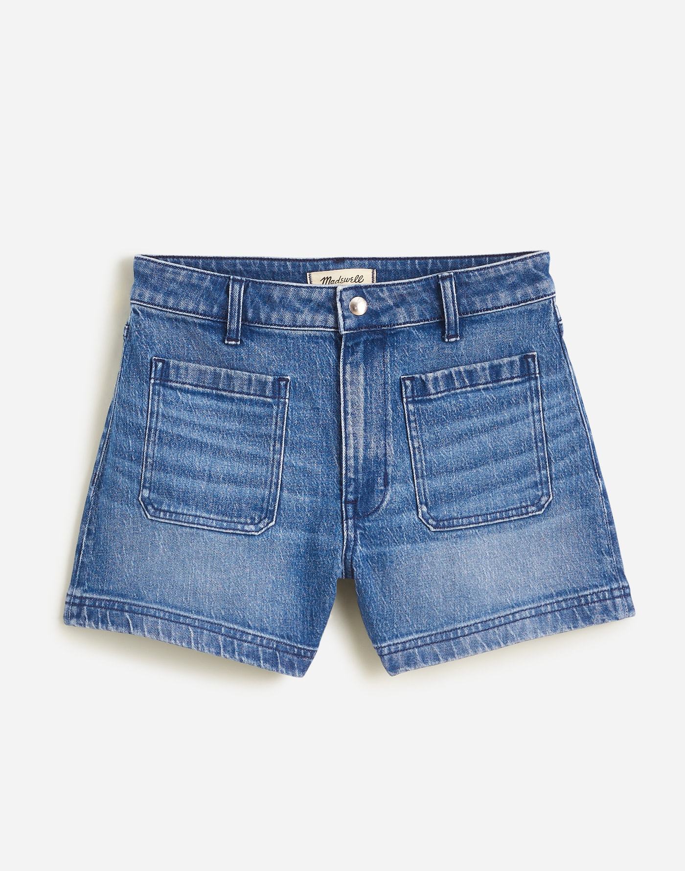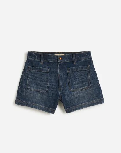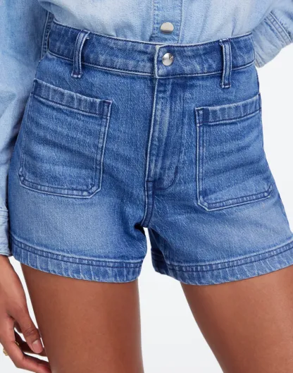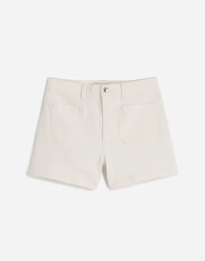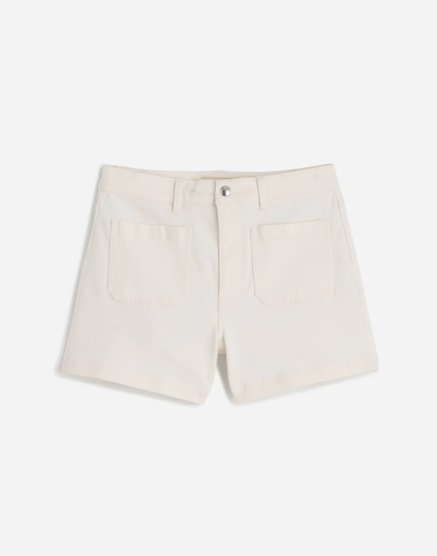 fitted A-line shorts have a high rise with front patch pockets.