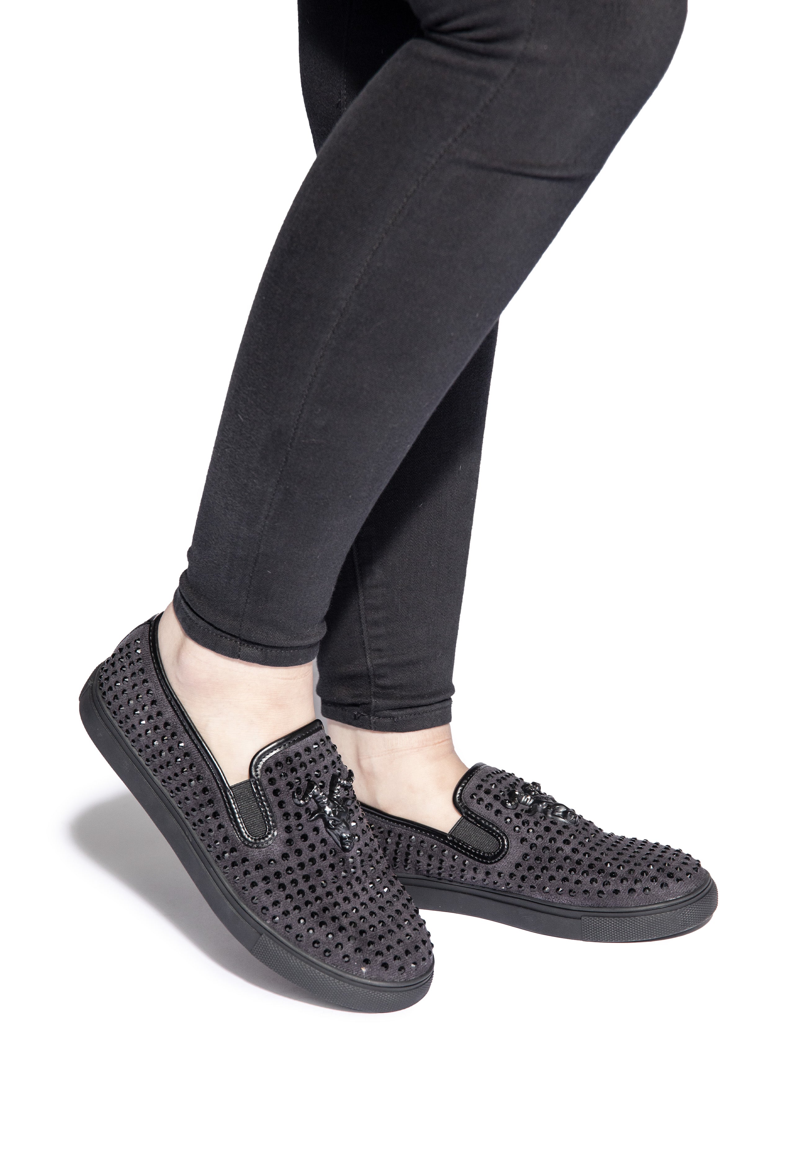 Unisex style slip on sneaker featuring our Baphomet hardware in an antique silver finish on a black faux suede fabric upper. The shoe features a fully stoned upper in black gemstones and PU faux leather trim.