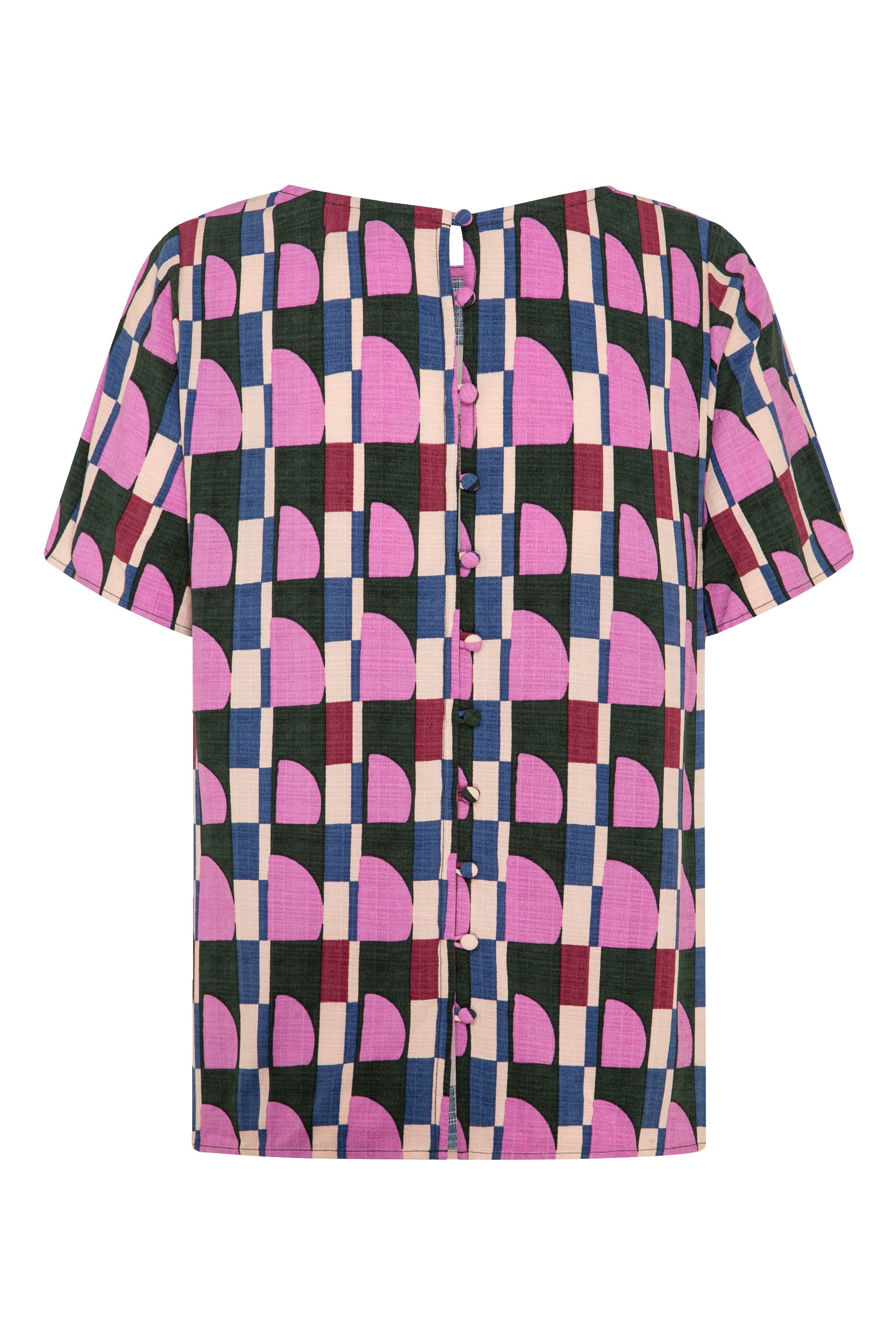 The Kitty Top has a loose fitting silhouette with a high neckline and a button down detail at the back for a little something extra.