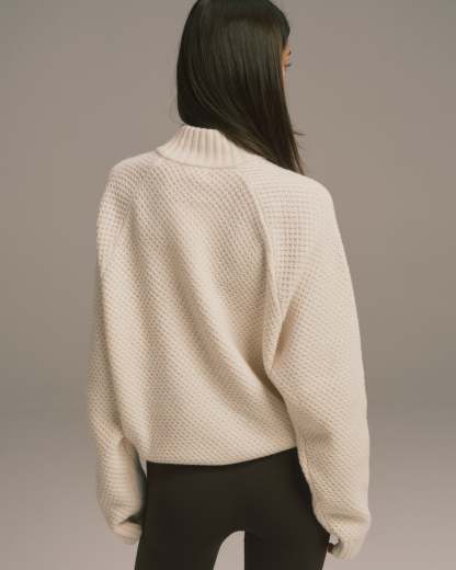 Introducing the Knit Full Zip Funnel Neck Sweatshirt. A comfortable choice this season. Cut from a cosy wool blend. It has a relaxed fit and features a double zip and embroidered logo on the back. Style it with your favourite Ultimate Leggings post Pilates class.