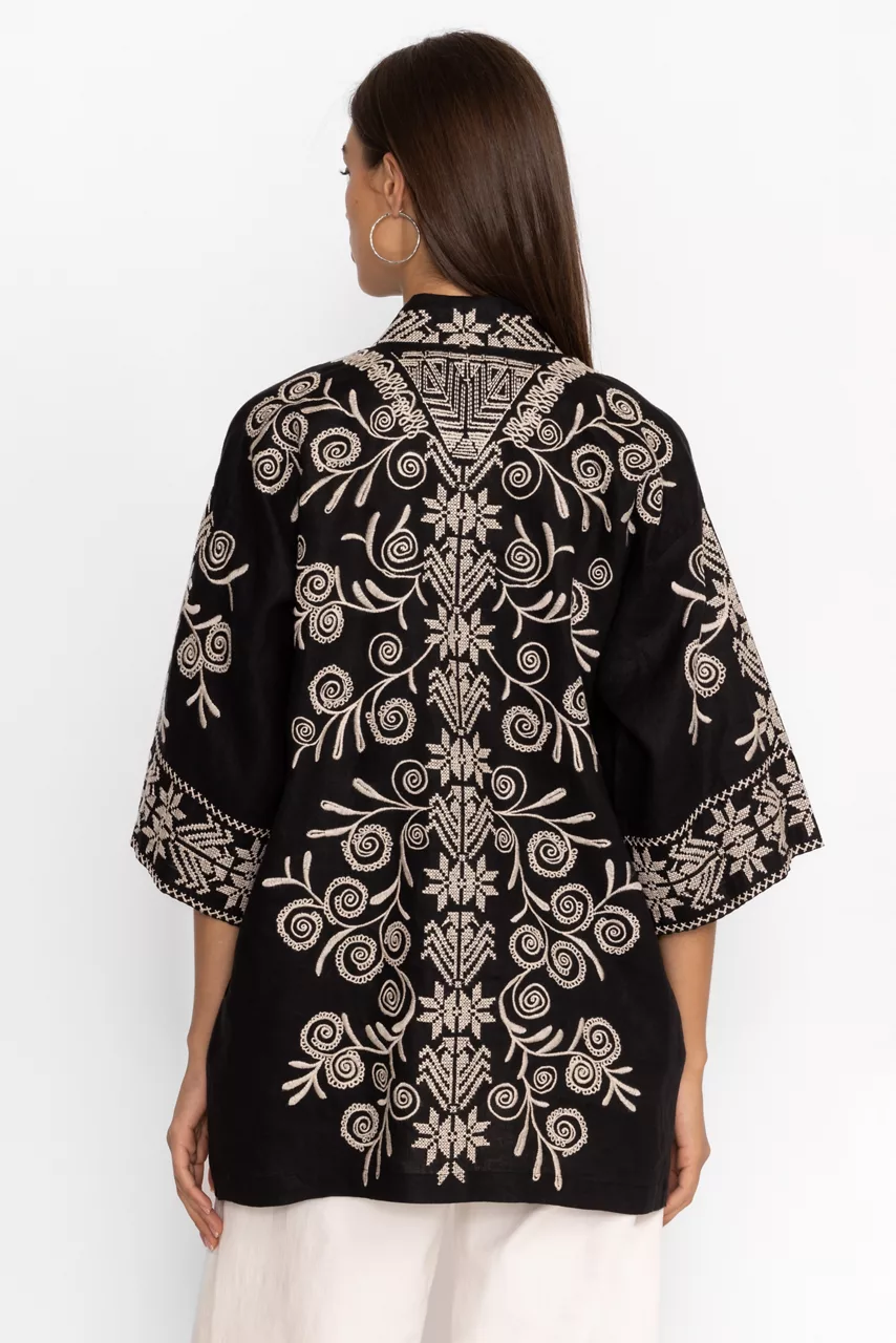 Crafted from 100% breathable linen, the Hannani Shawl Collar Kimono is the perfect top layer for breezy days and nights. Featuring a shawl collar with and open front, this elegant kimono is finished with 3/4 sleeves and side seam pockets. Layer over the Etta Silk Cami and pair with easy palazzo linen pants for a timeless casual look.